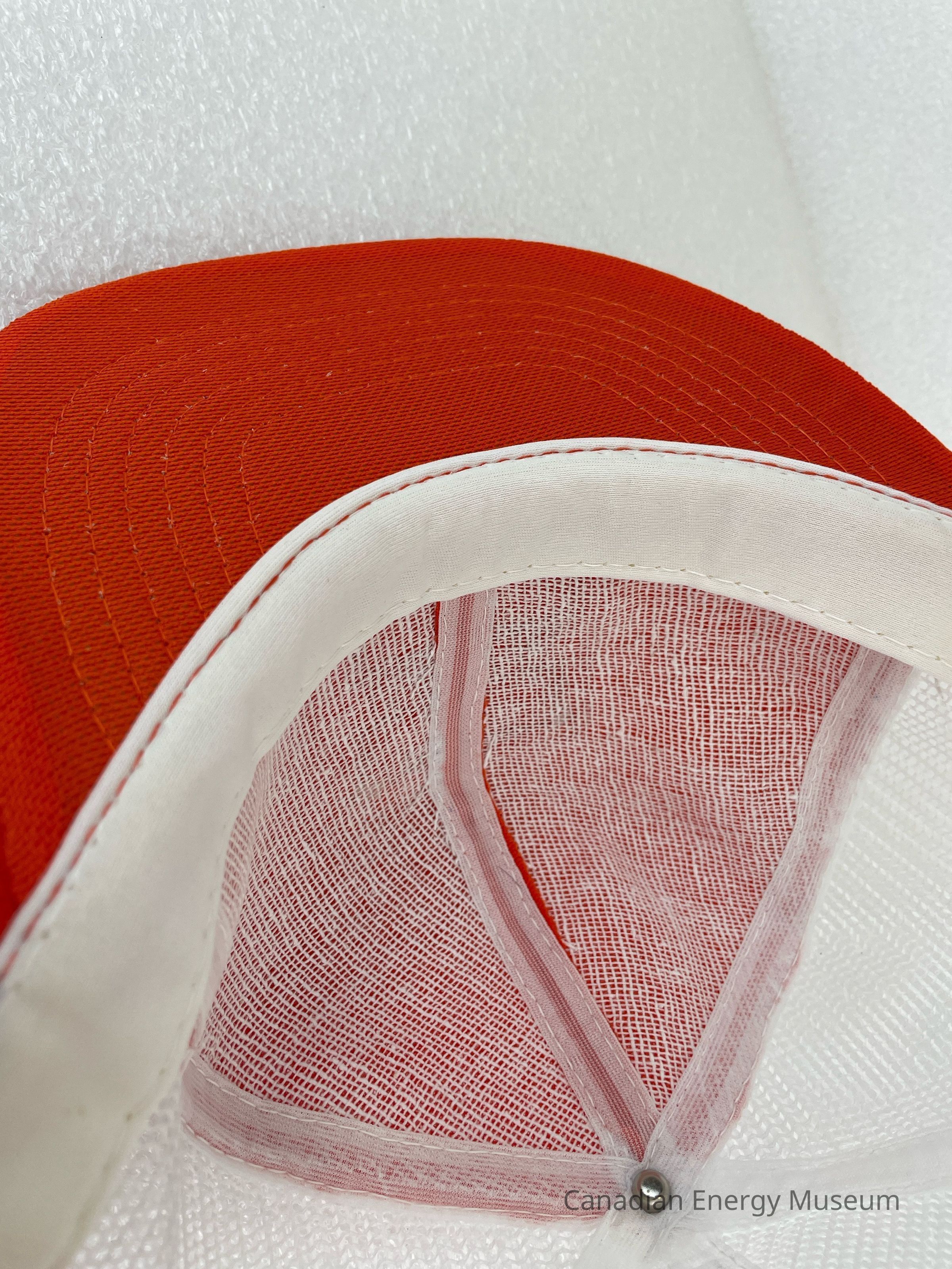 Brim: Fabric-covered, orange with orange stitching.