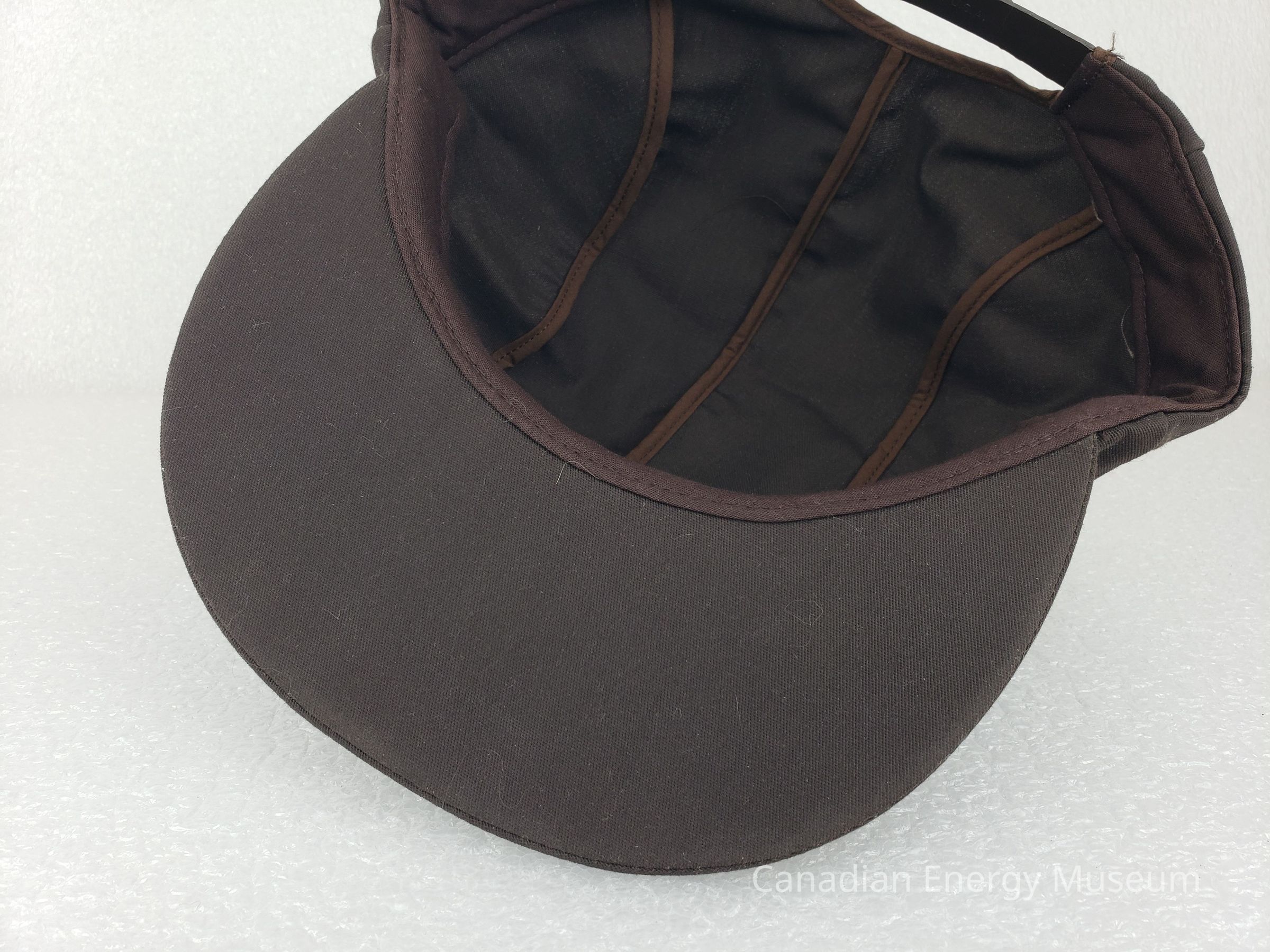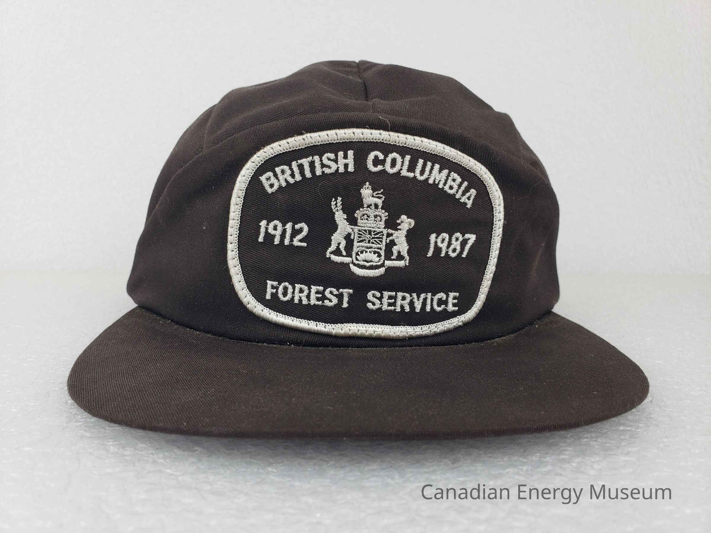 Design: A brown fabric cap with a large embroidered oval patch branded for the British Columbia Forest Service, 1912-1987. The patch features small white text at the top reading, "BRITISH COLUMBIA" at the bottom reading, "FOREST SERVICE", the middle left, "1912", and on the right, "1987". The middle of the patch features a white embroidered British Columbia crest.