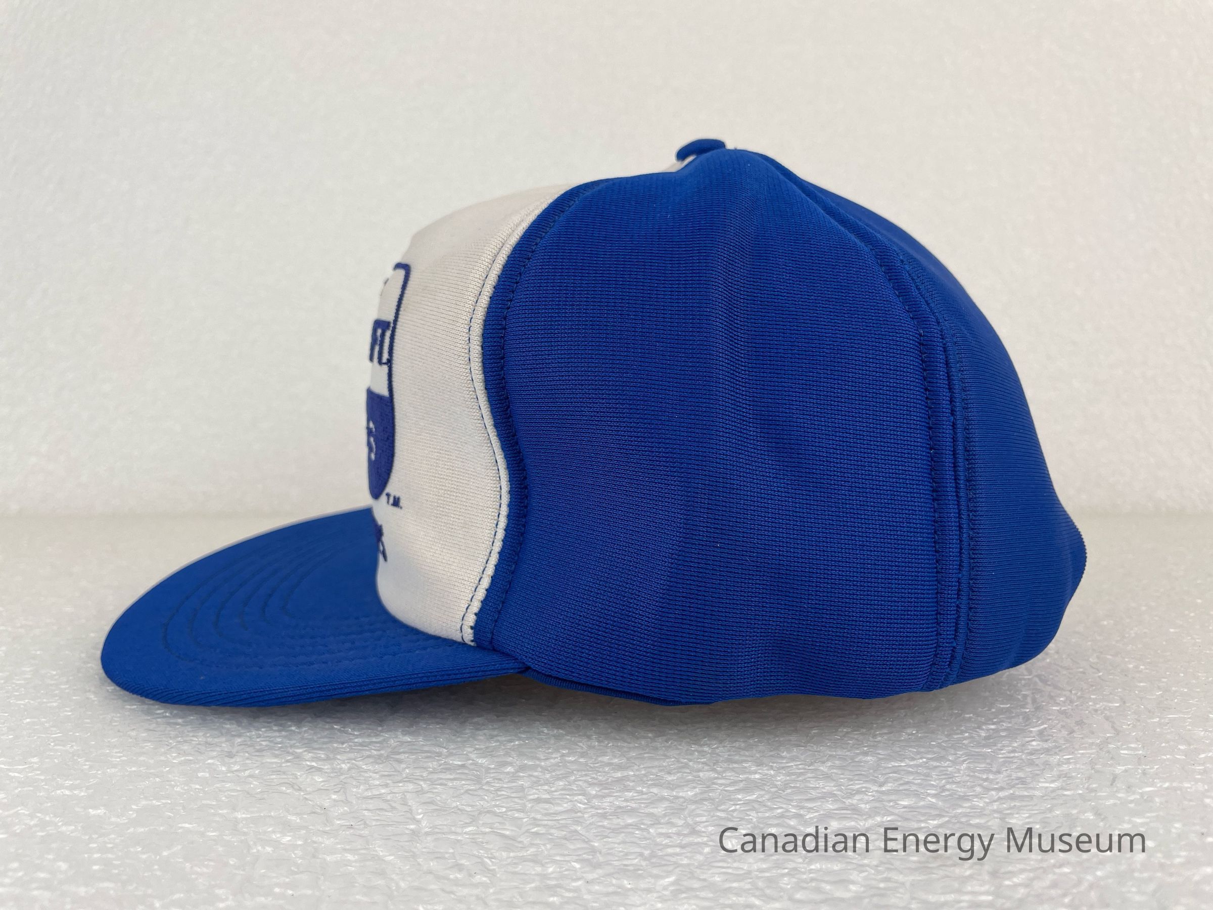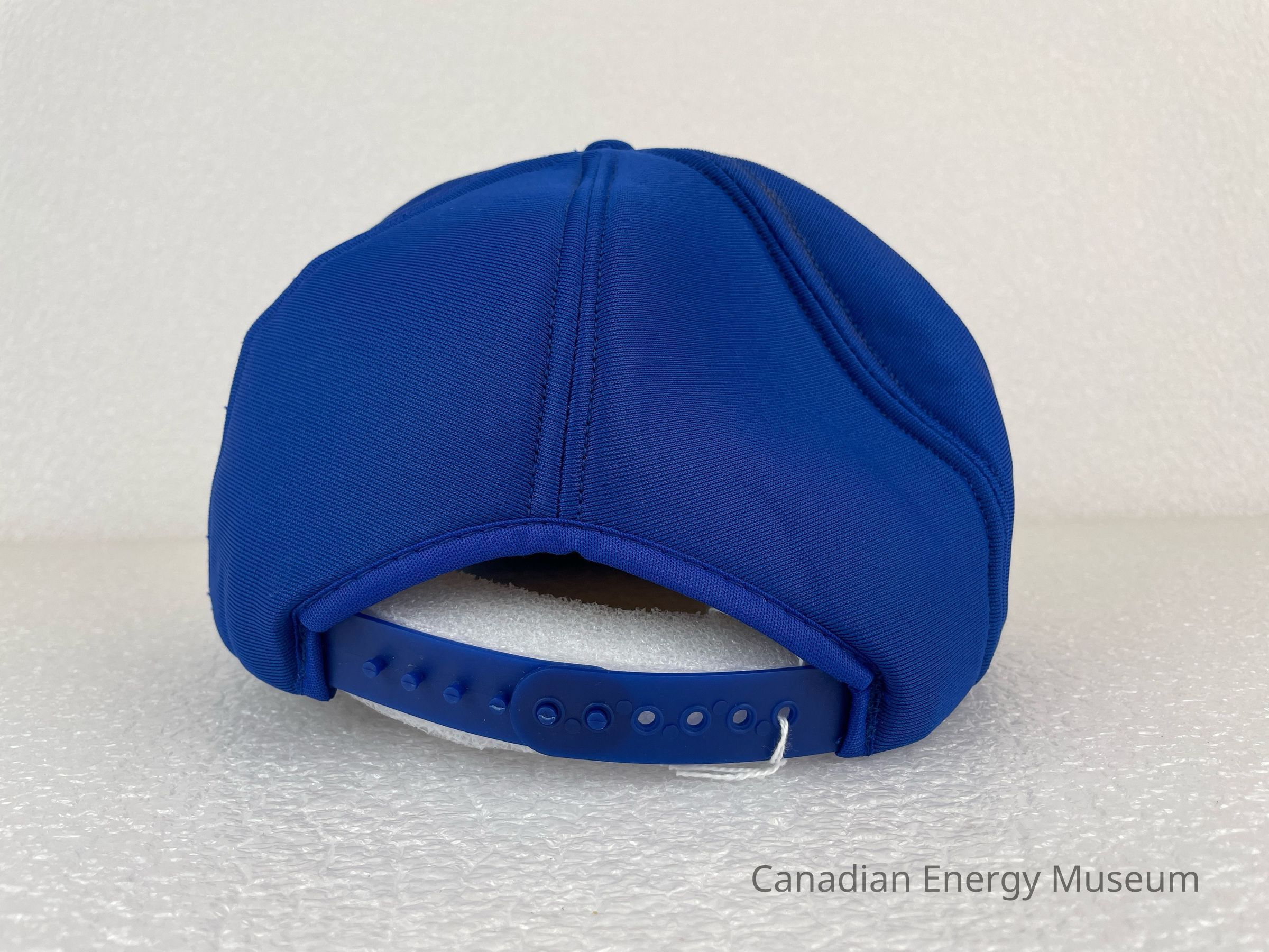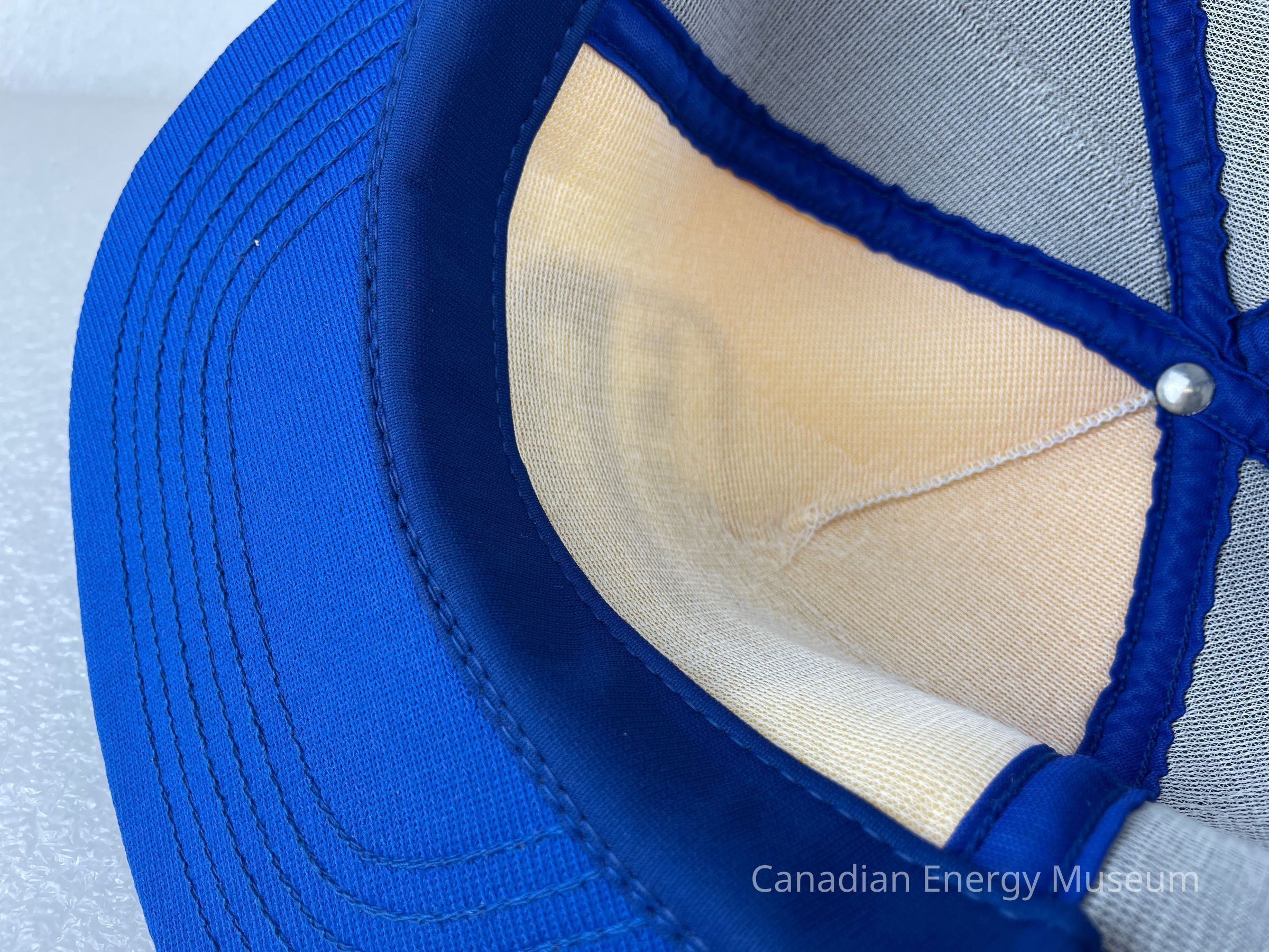 Crown Material: Foam backing with fabric outer, blue with blue stitching.