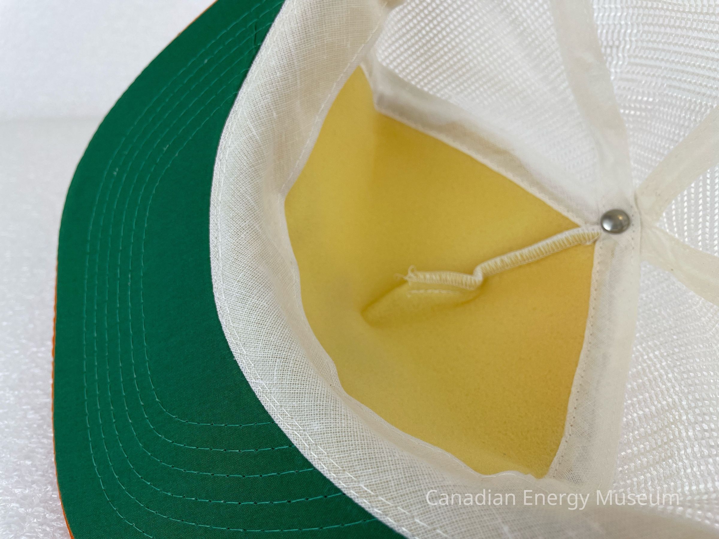 Brim: Fabric-covered, orange with white stitching. On the bottom of the brim is fabric, green with green stitching.