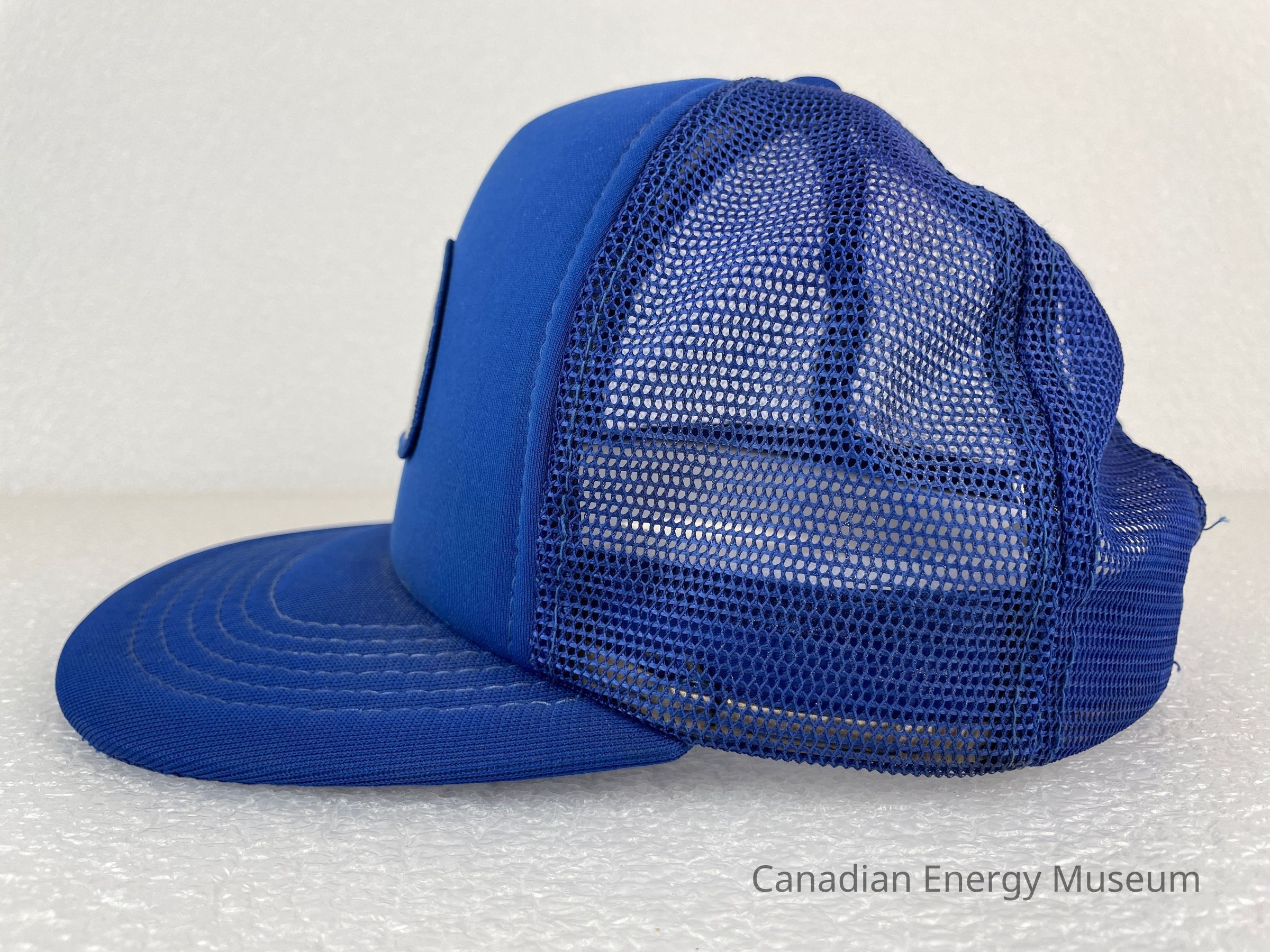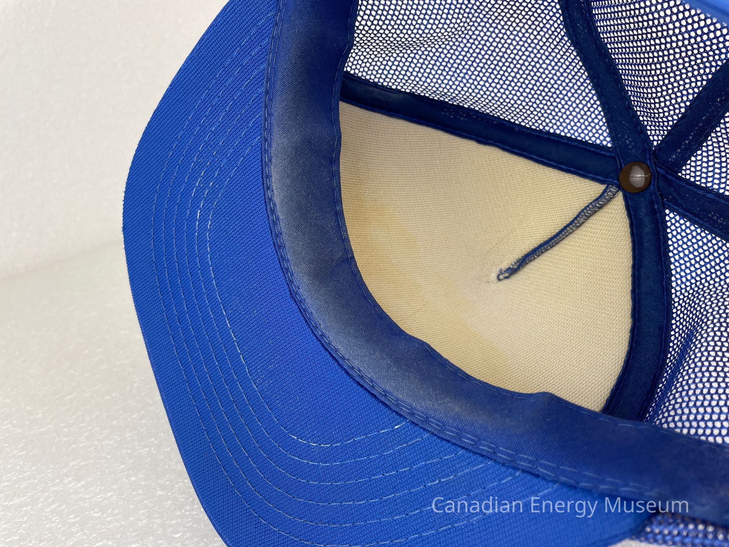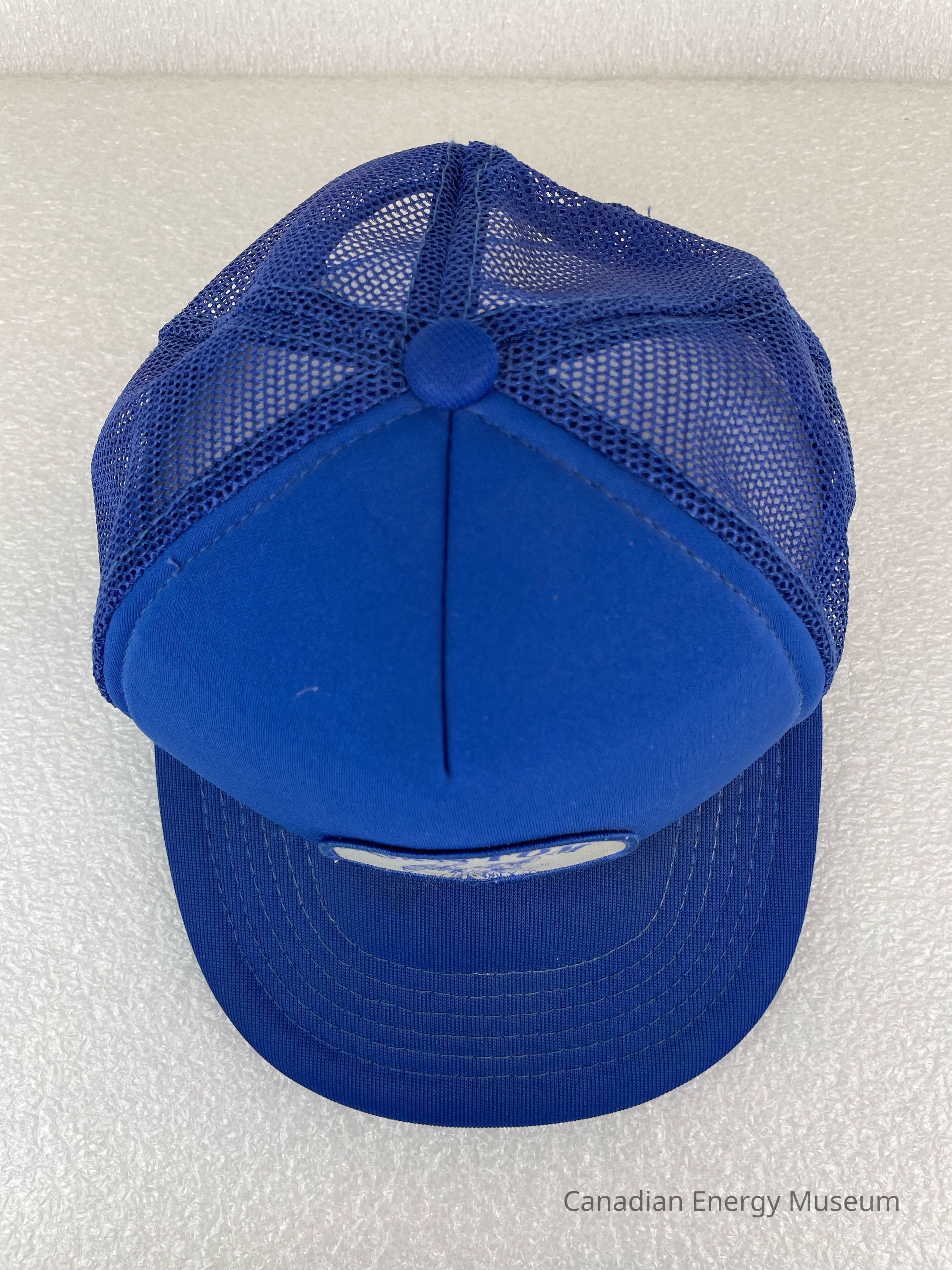 Crown Material: Foam backing with fabric outer, blue with blue stitching.