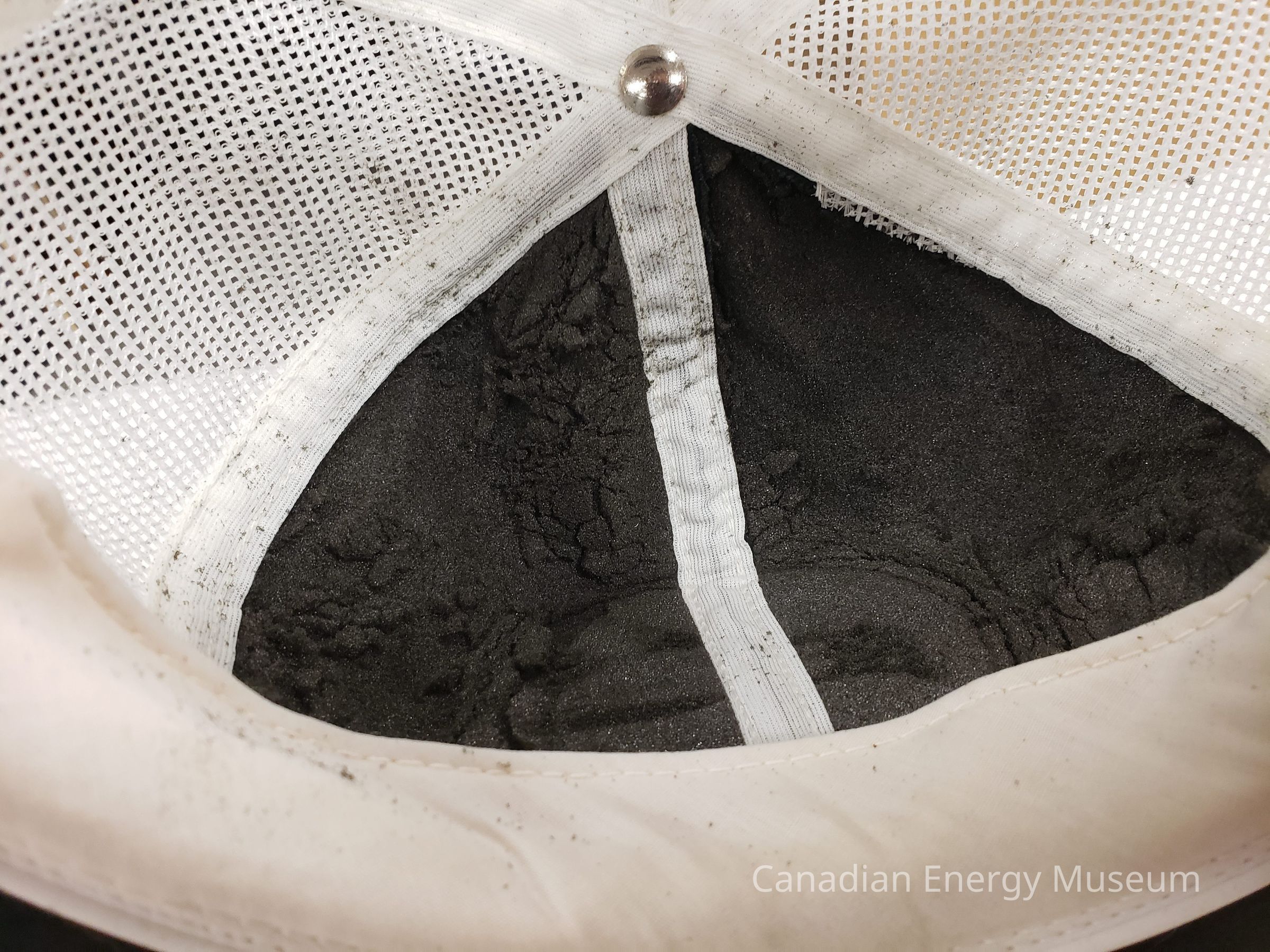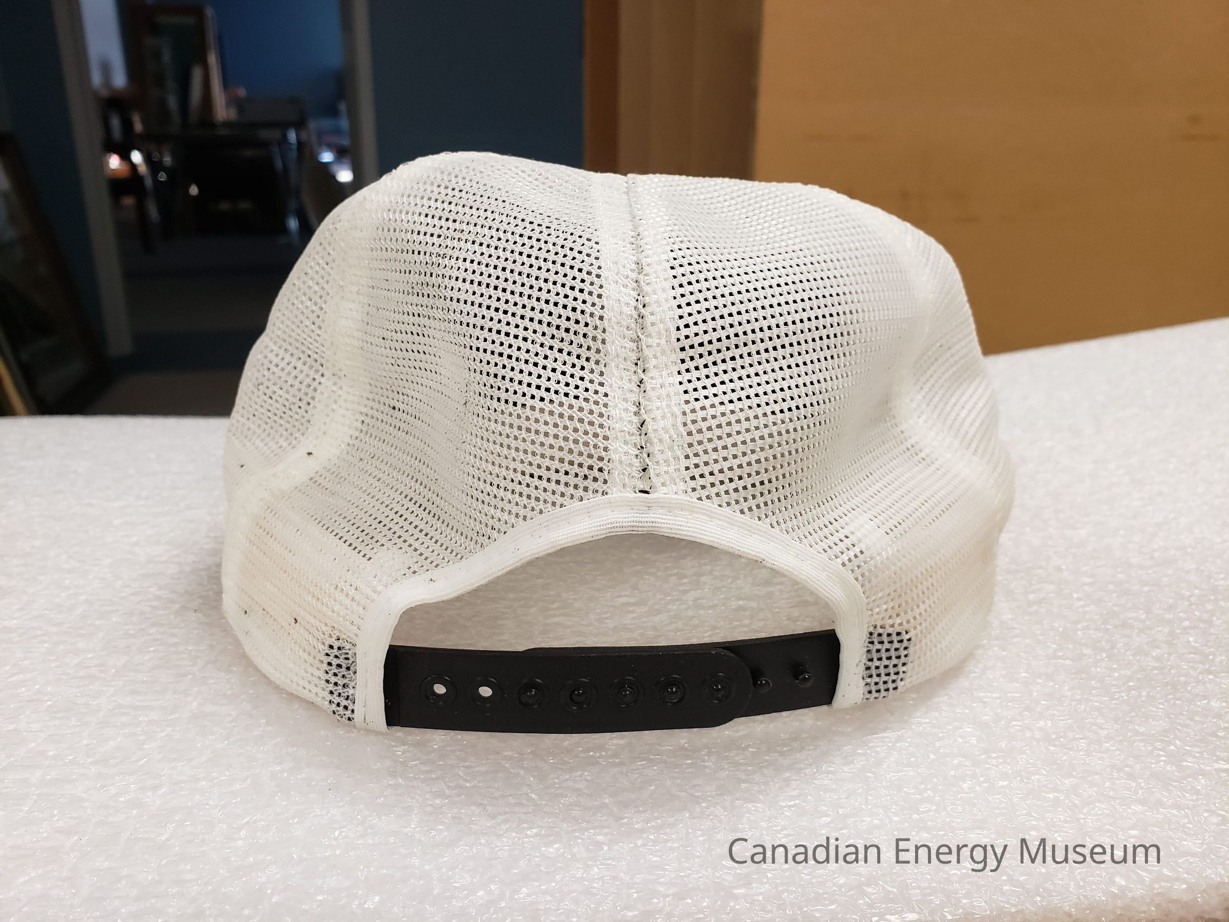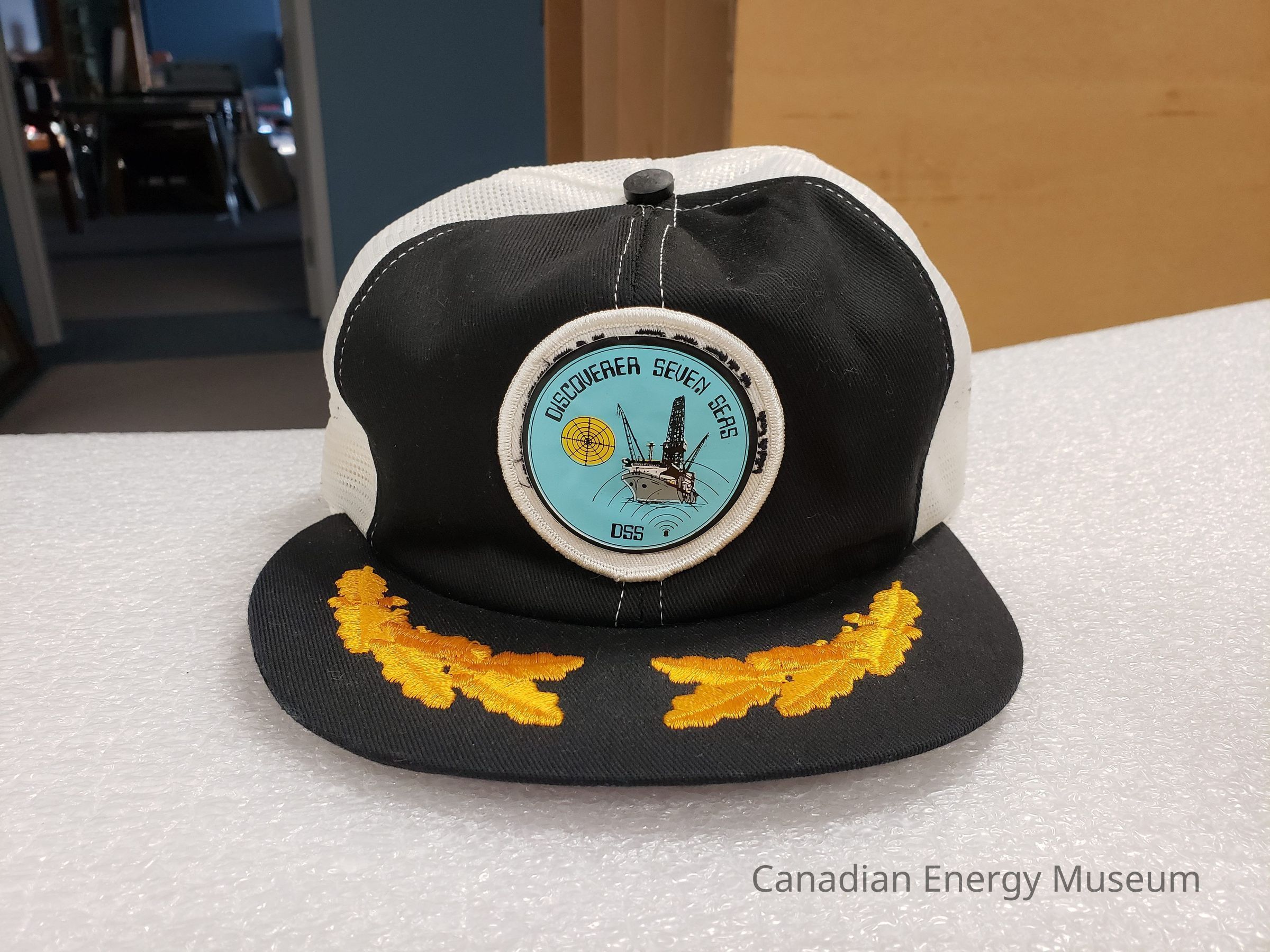 Features: Embroidered cap with a round embroidered badge, over which is adhered a round blue, black, and yellow sticker. Original badge content unknown without removal of the sticker. The sticker has cyan-blue background, with a black double-ring border (thick outer band, thin inner band). Matching the upper curve is the text "Discoverer Seven Seas) in black stylized font, under which is a black lineart of a ship bearing an oil Derrick, overlaid with radiation lines symbolizing sonar, and a yellow-filled image of a sonar display. At the bottom is the text "DSS" in black (same font). The visor and front of the cap are in black fabric, with the rest of the body being white mesh. Visor is embroidered with gold/yellow oak laurel leaves on either side. Metal button covered in black plastic. Black plastic snapback fastening.Collection