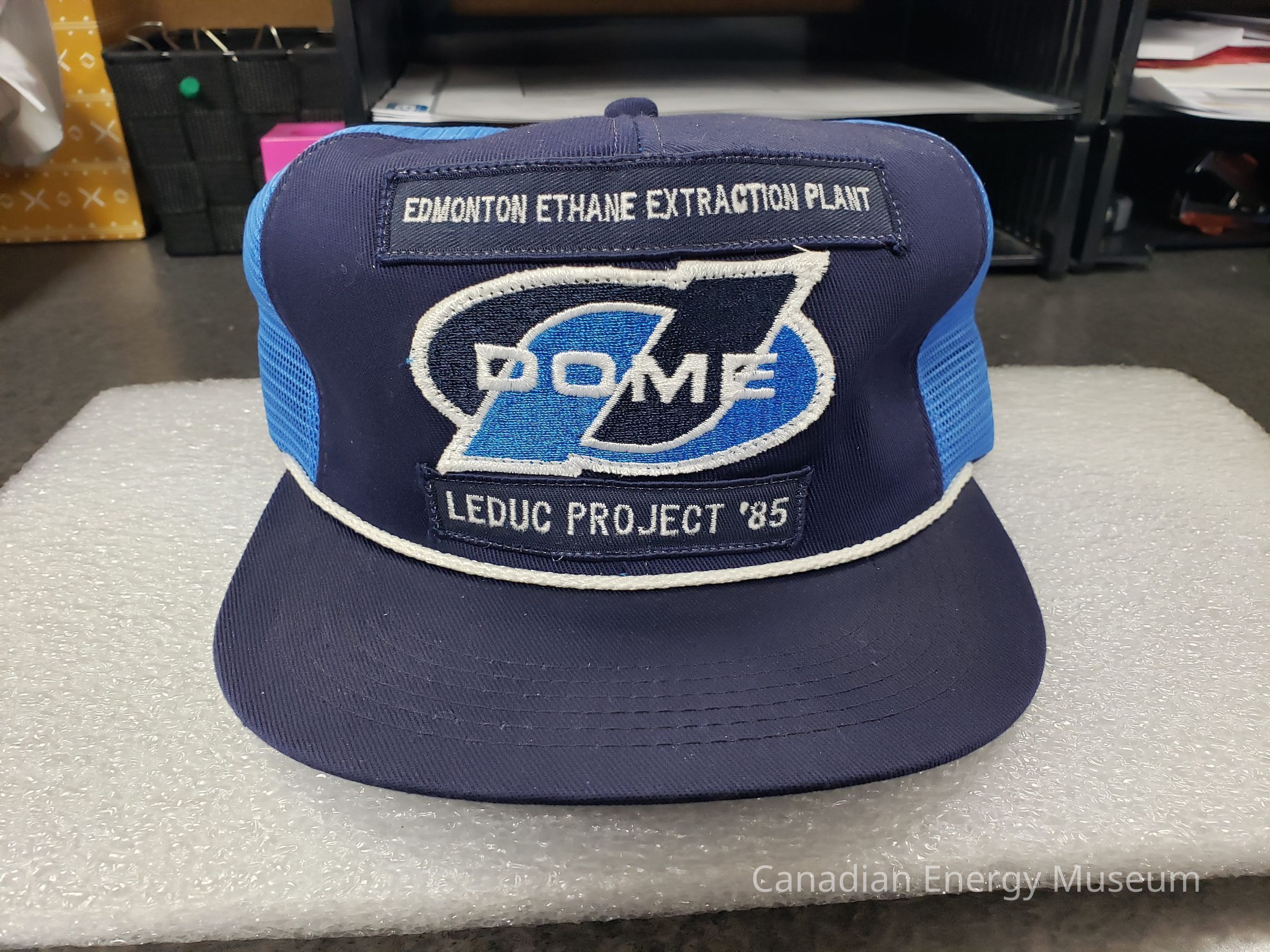 Cap, Trucker Cap, Hat, Headwear, Dome Petroleum, 1980s, Leduc, Edmonton, Ethane, Gas, Textile, Accessory, Blue, Navy, White, Embroidery, Oil IndustryDescription