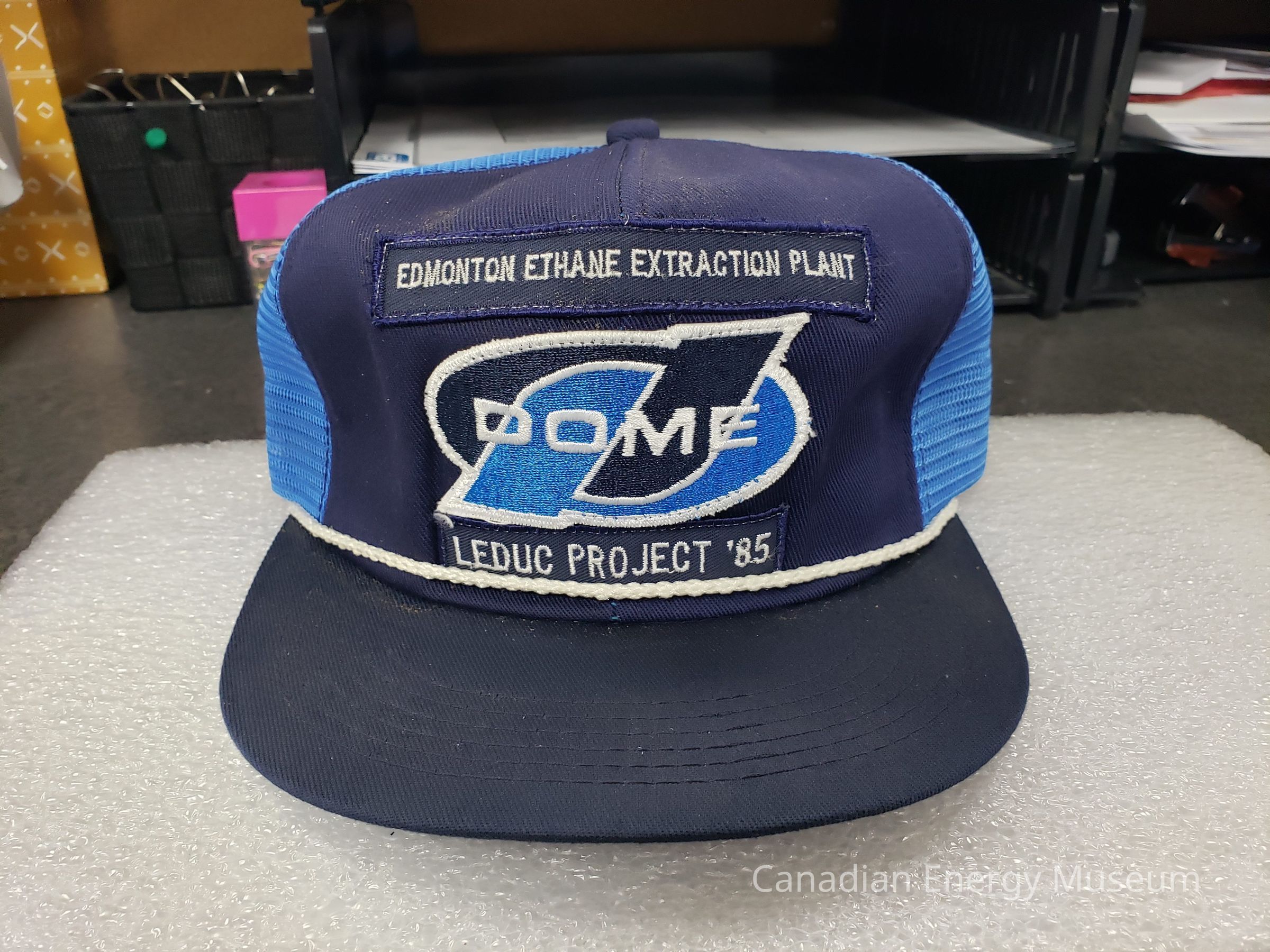 1980s, Accessory, Blue, Navy, Cap, Hat, Headwear, Dome Petroleum, Edmonton, Embroidery, Ethane, Gas, Leduc, Oil Industry, Textile, Trucker Cap, WhiteDescription