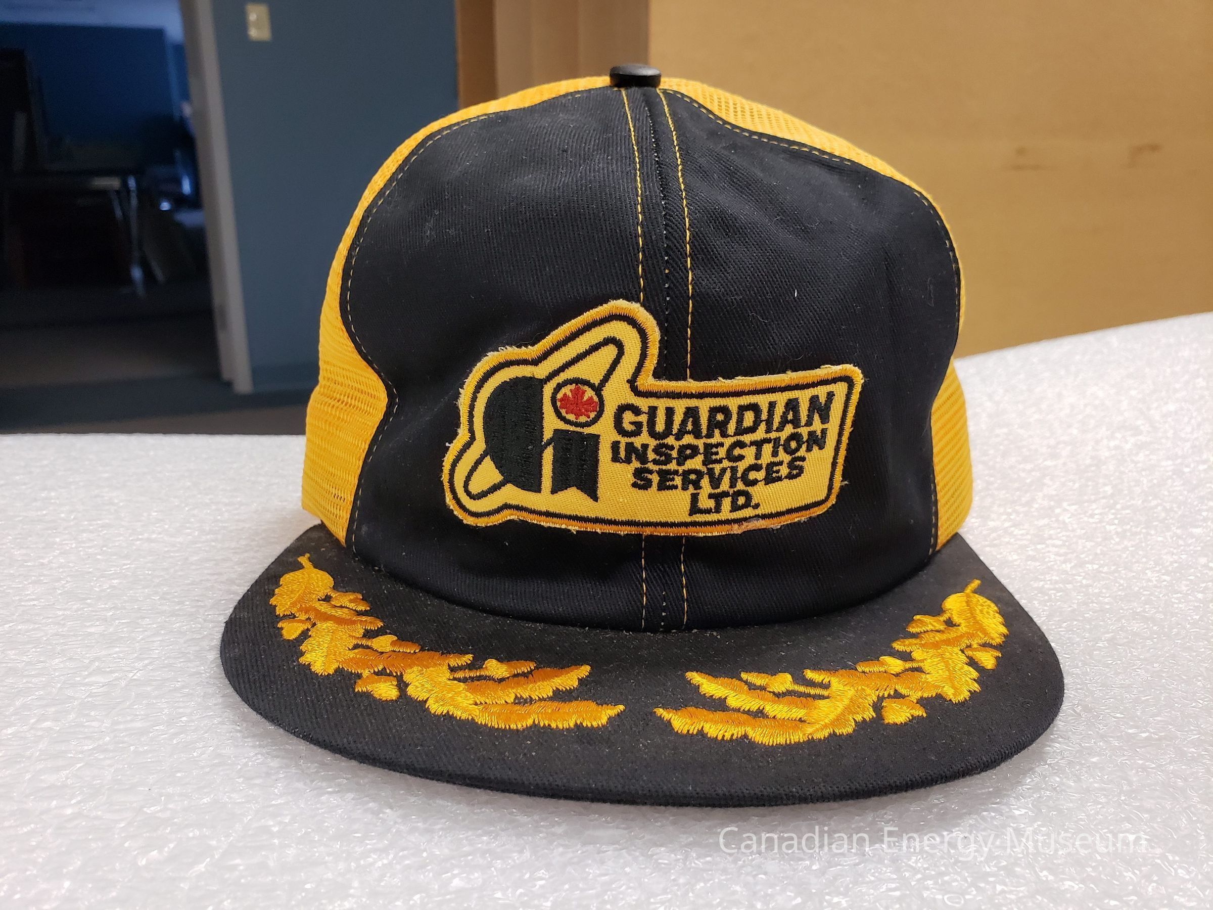 Features: Black fabric front panels and visor, with yellow stitching on front panels. On the front panels is a custom-shaped flat-embroidered patch, with a yellow base, with black embroidery, and a point of red. Around the edge of the patch is an embroidered yellow border, inside of which is a fine black line. To the right is the black text "GUARDIAN INSPECTION SERVICES LTD.", and to the left is the brand's logo of a stylised black "G", with a diagonal orbit line and a ring with a red maple leaf inside. The patch is a narrow horizontal rectangle with a uniquely shaped left to match the shape of the brand's logo. On the top of the visor are embroidered oak leaves in the form of laurels.