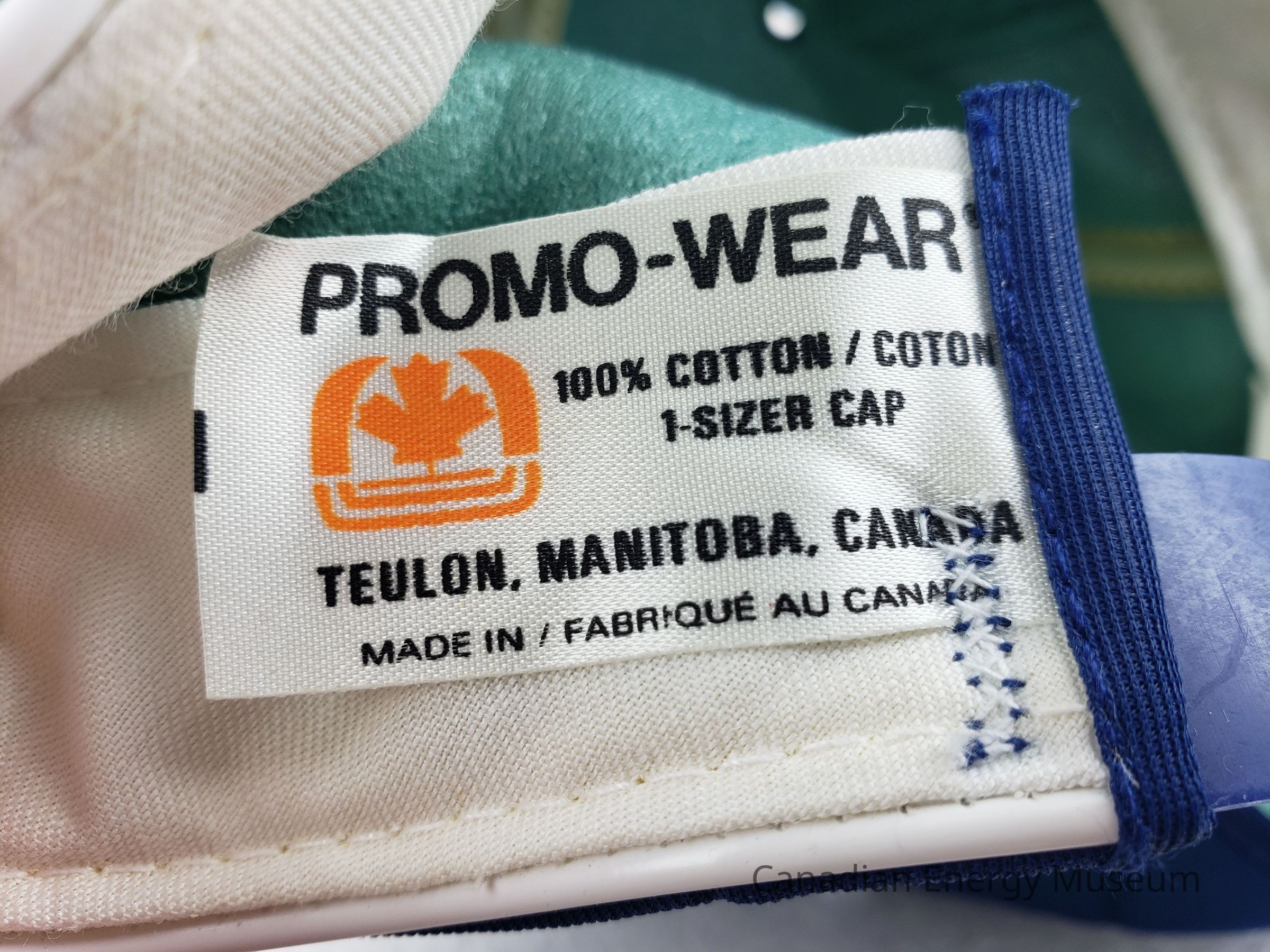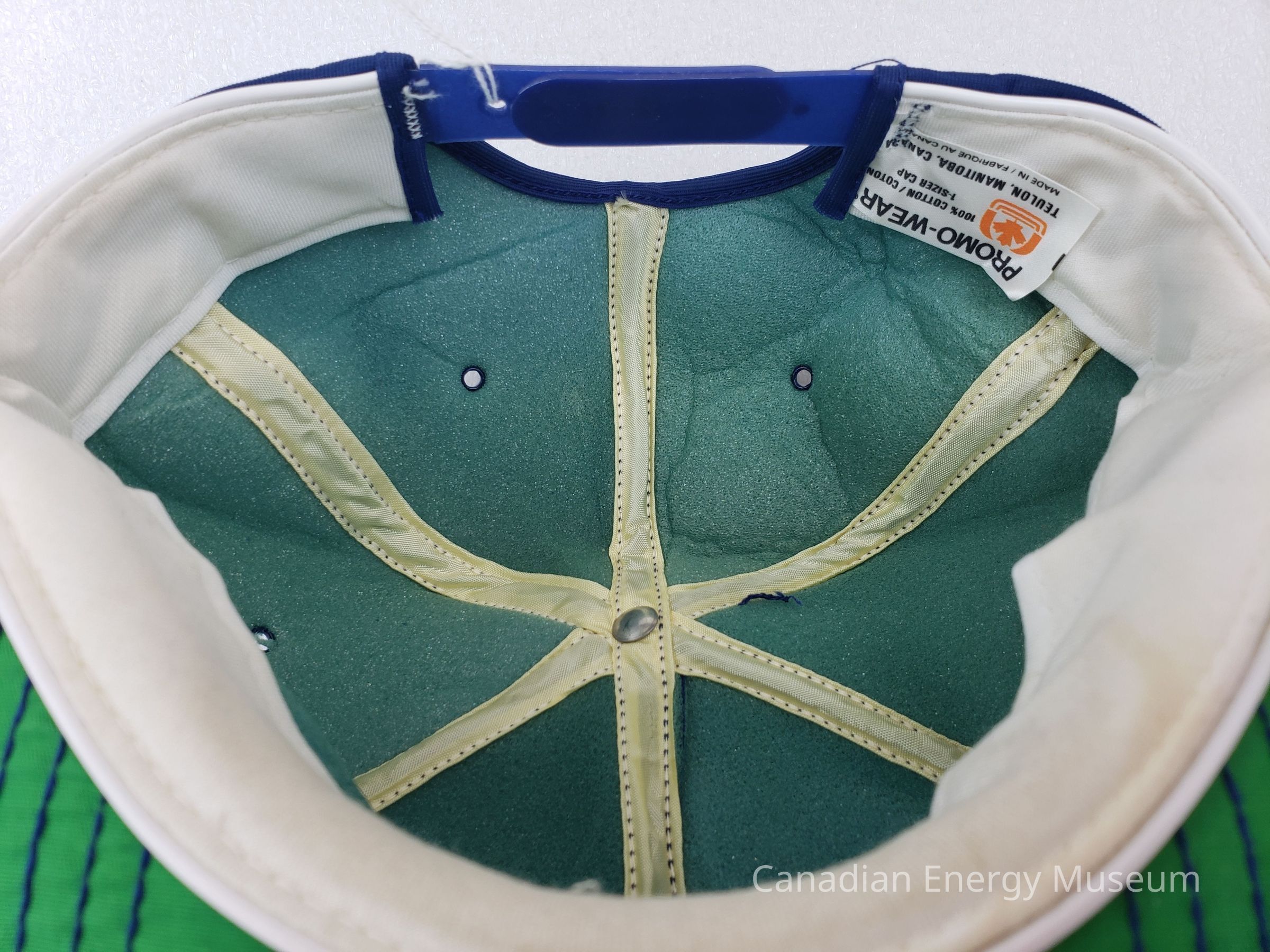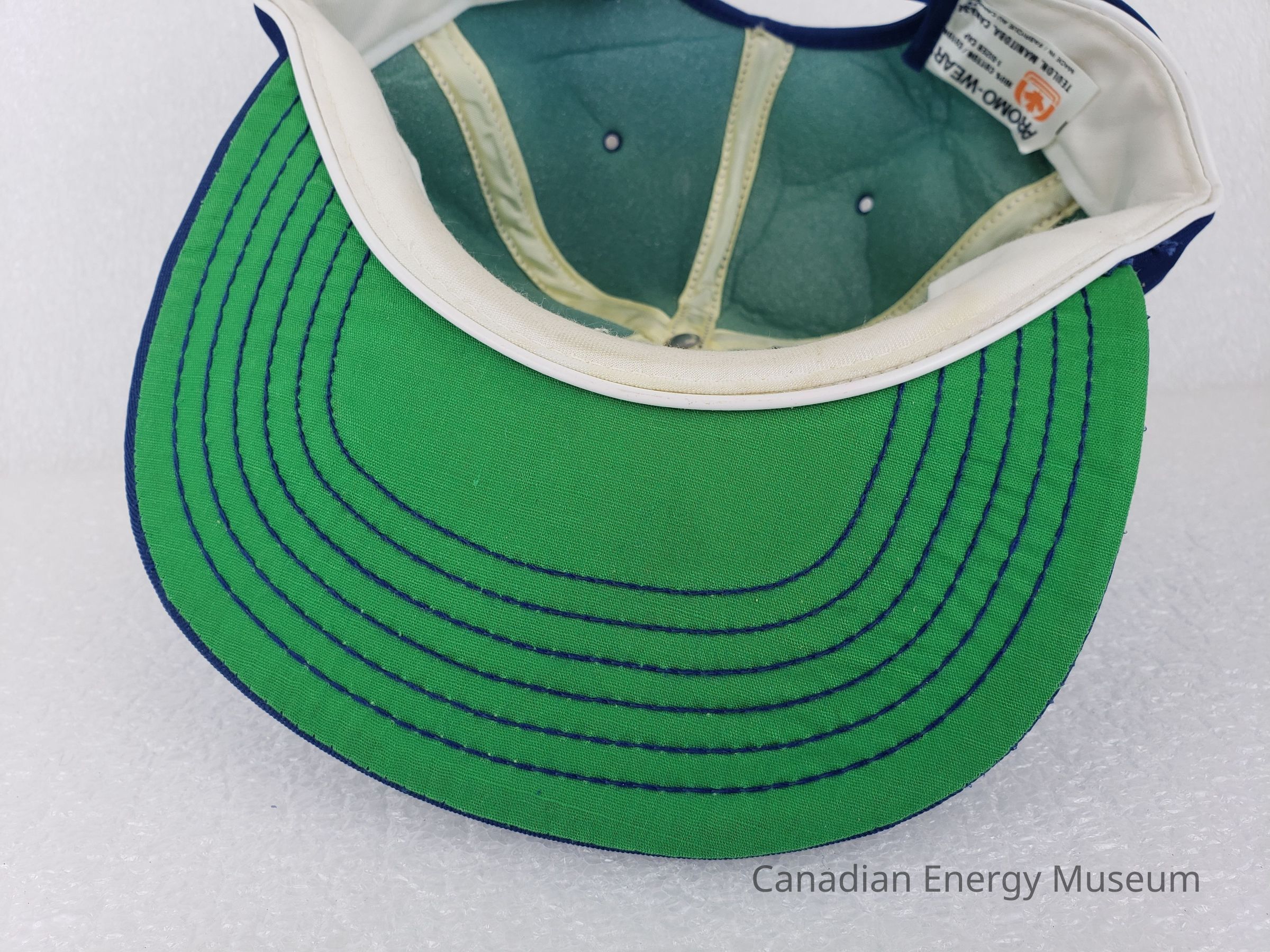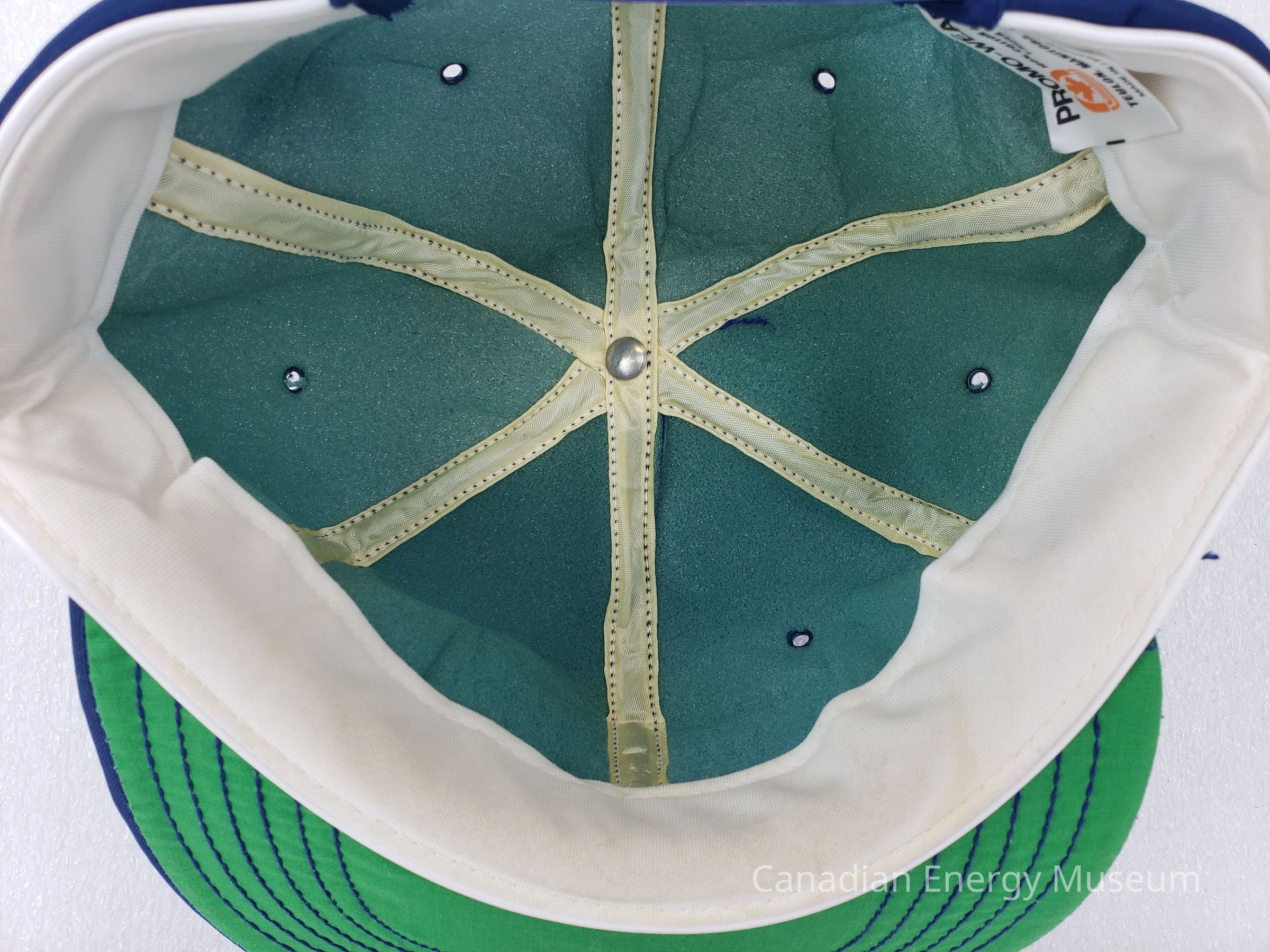 Brim: Fabric-covered, blue with blue stitching. Bottom of brim is fabric-covered, green with blue stitching.