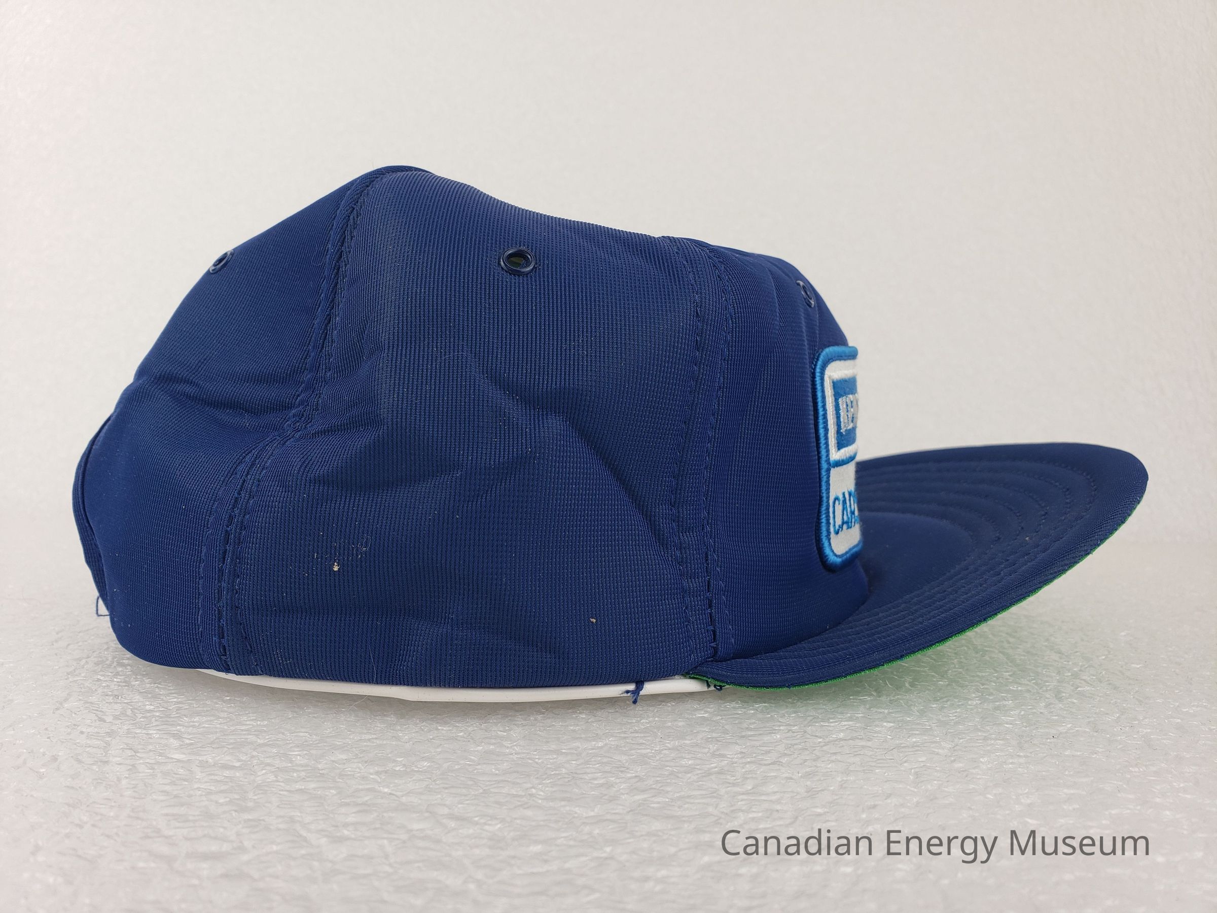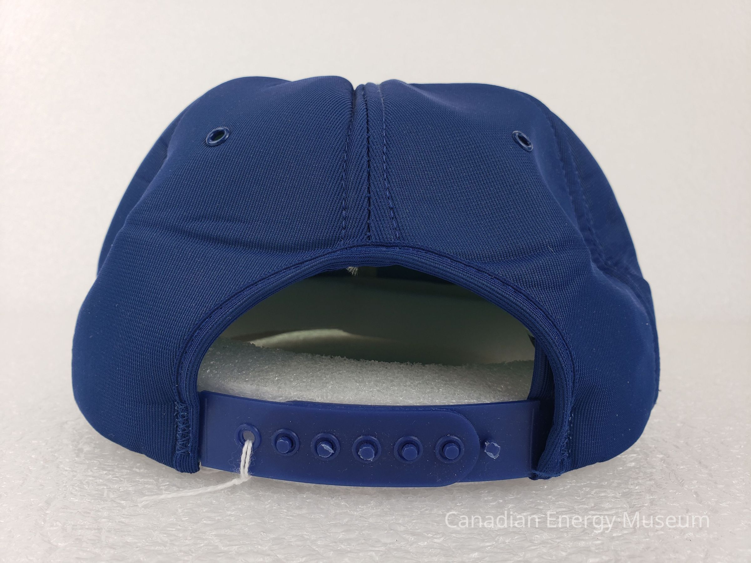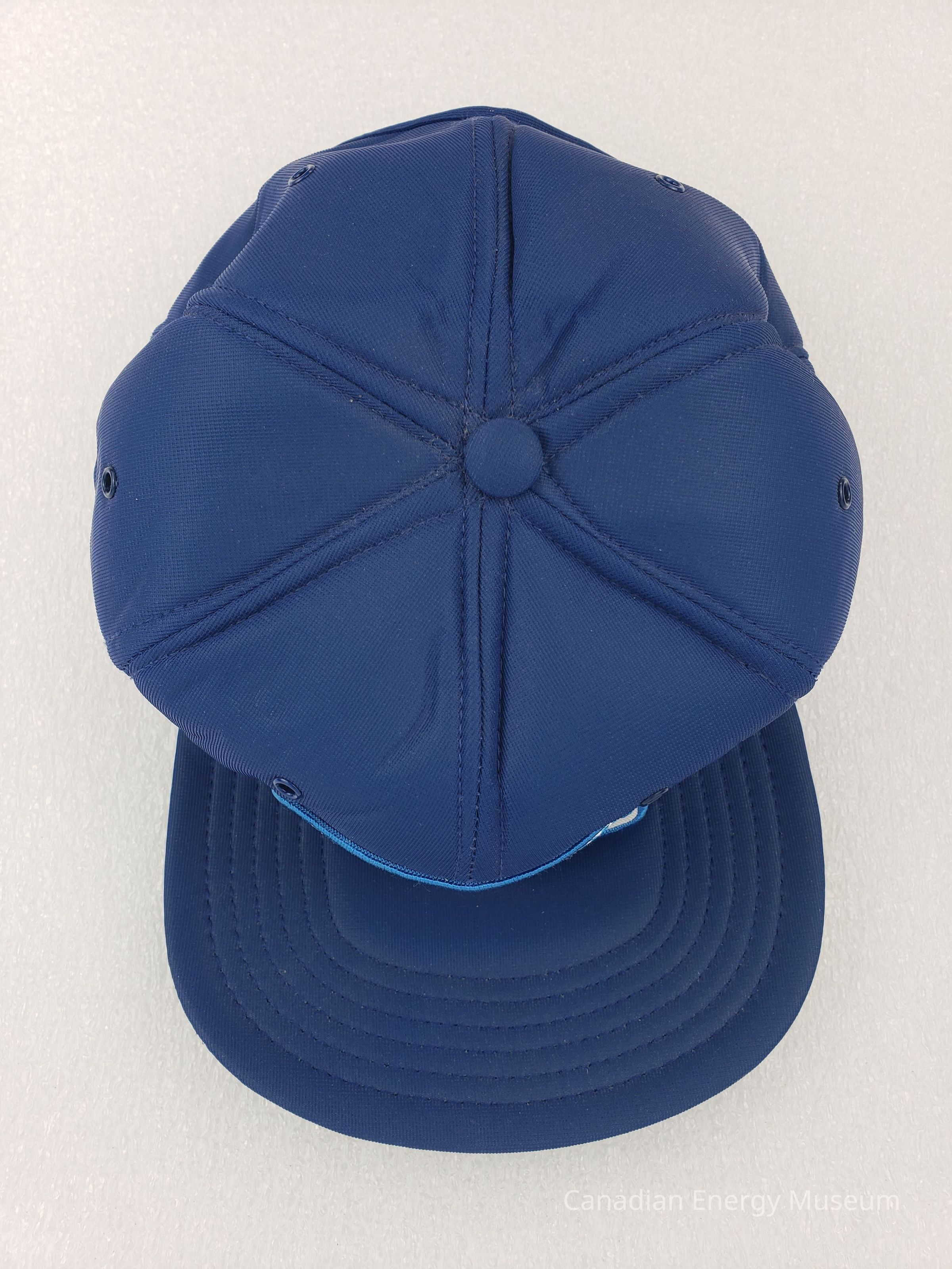 Crown Material: Foam backing with fabric outer, blue with blue stitching.
