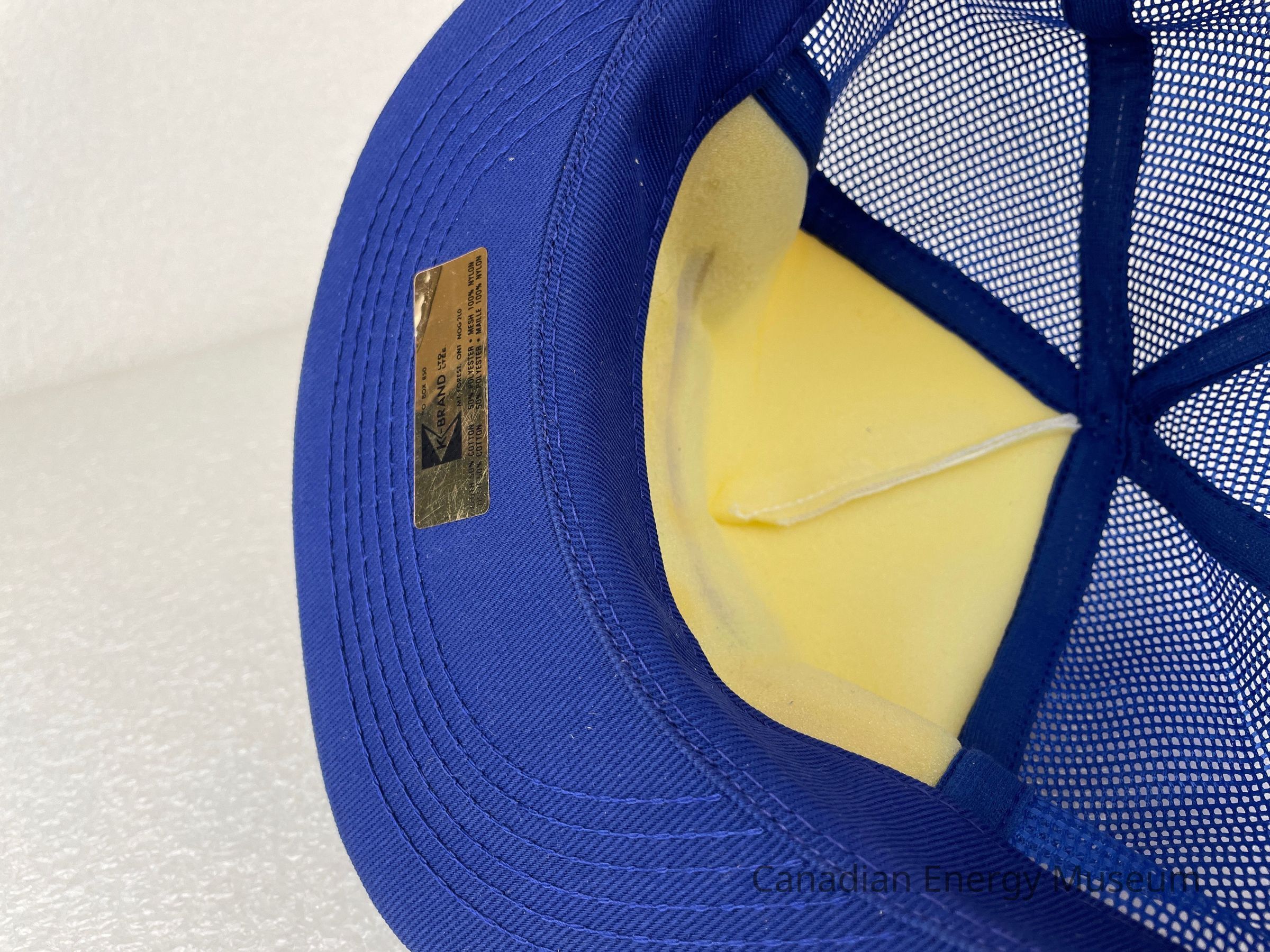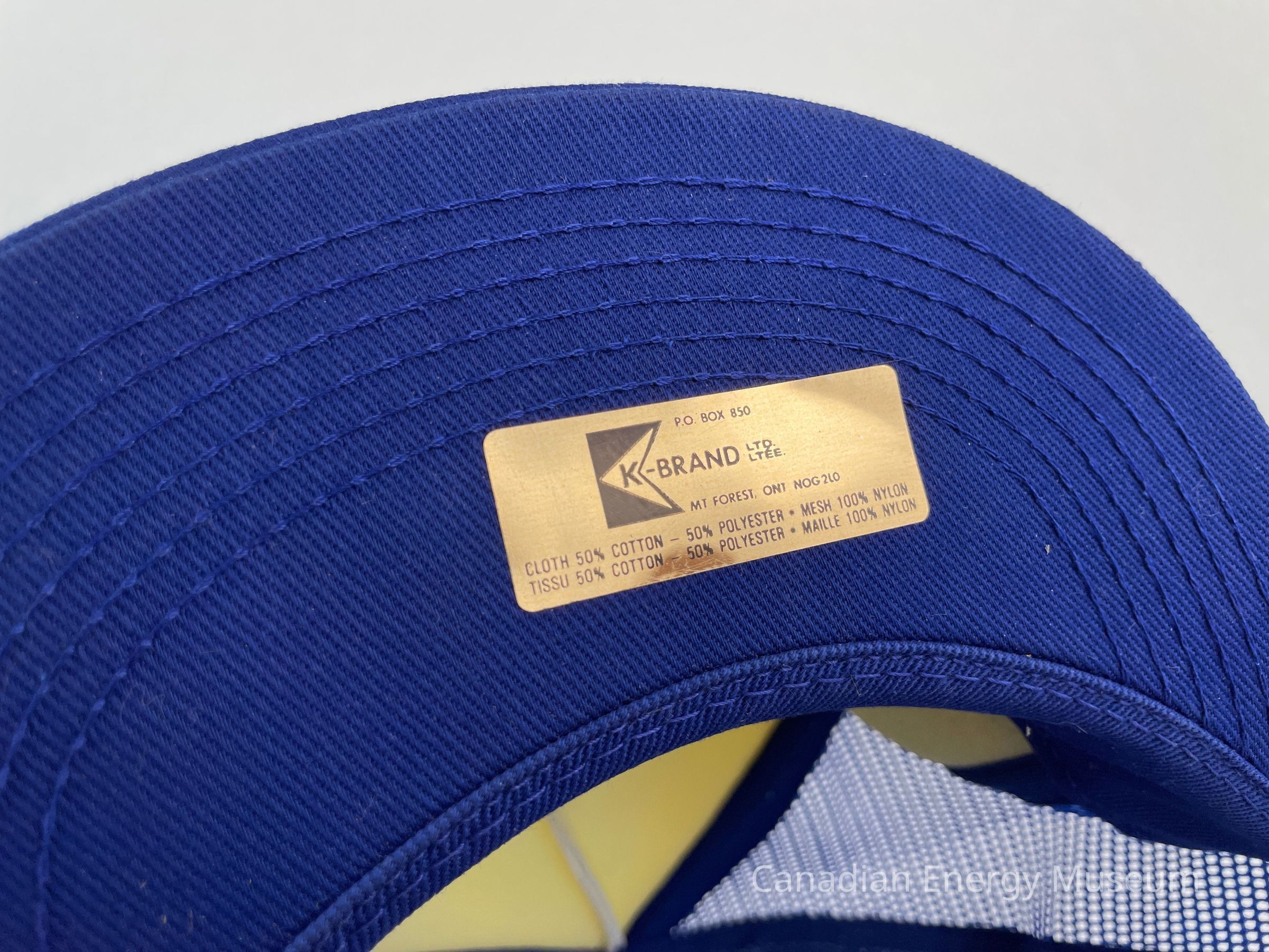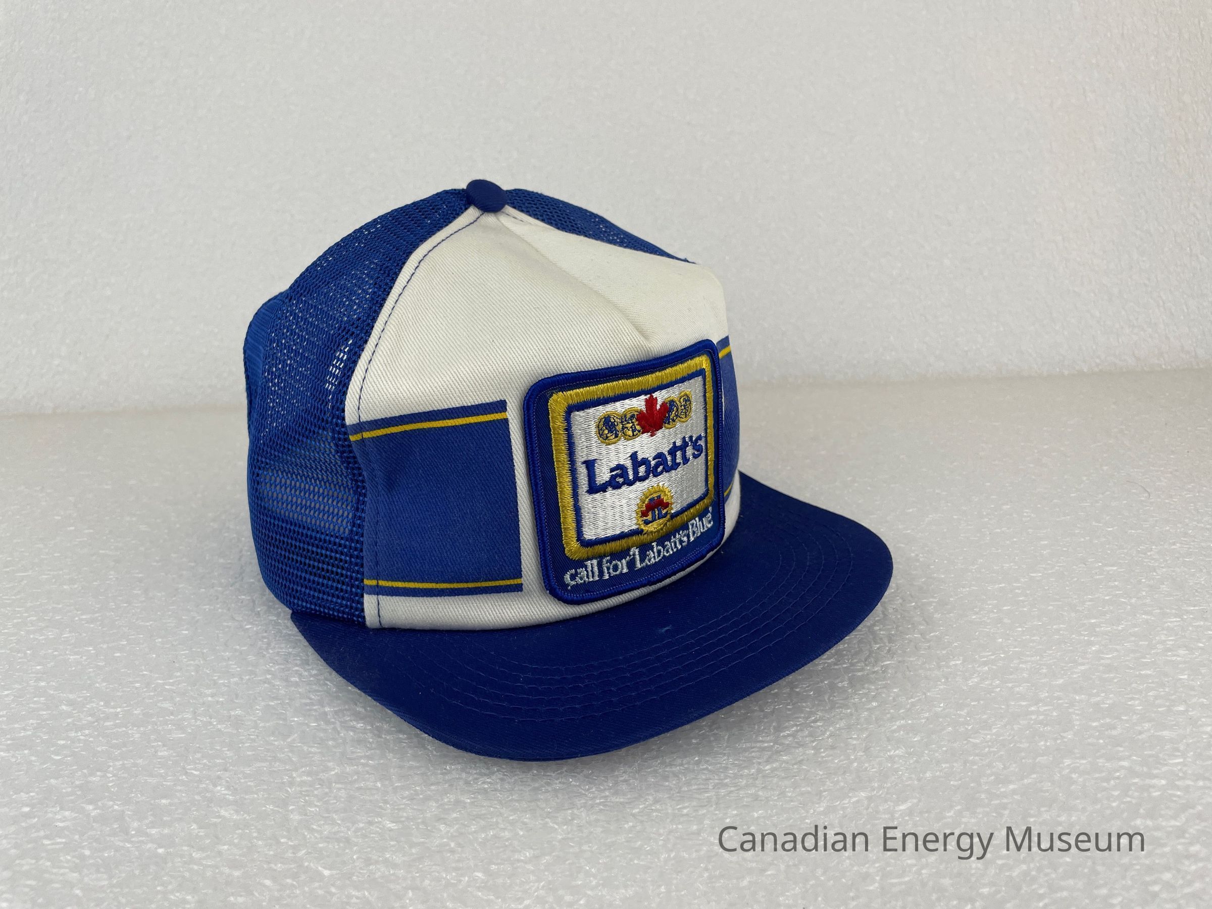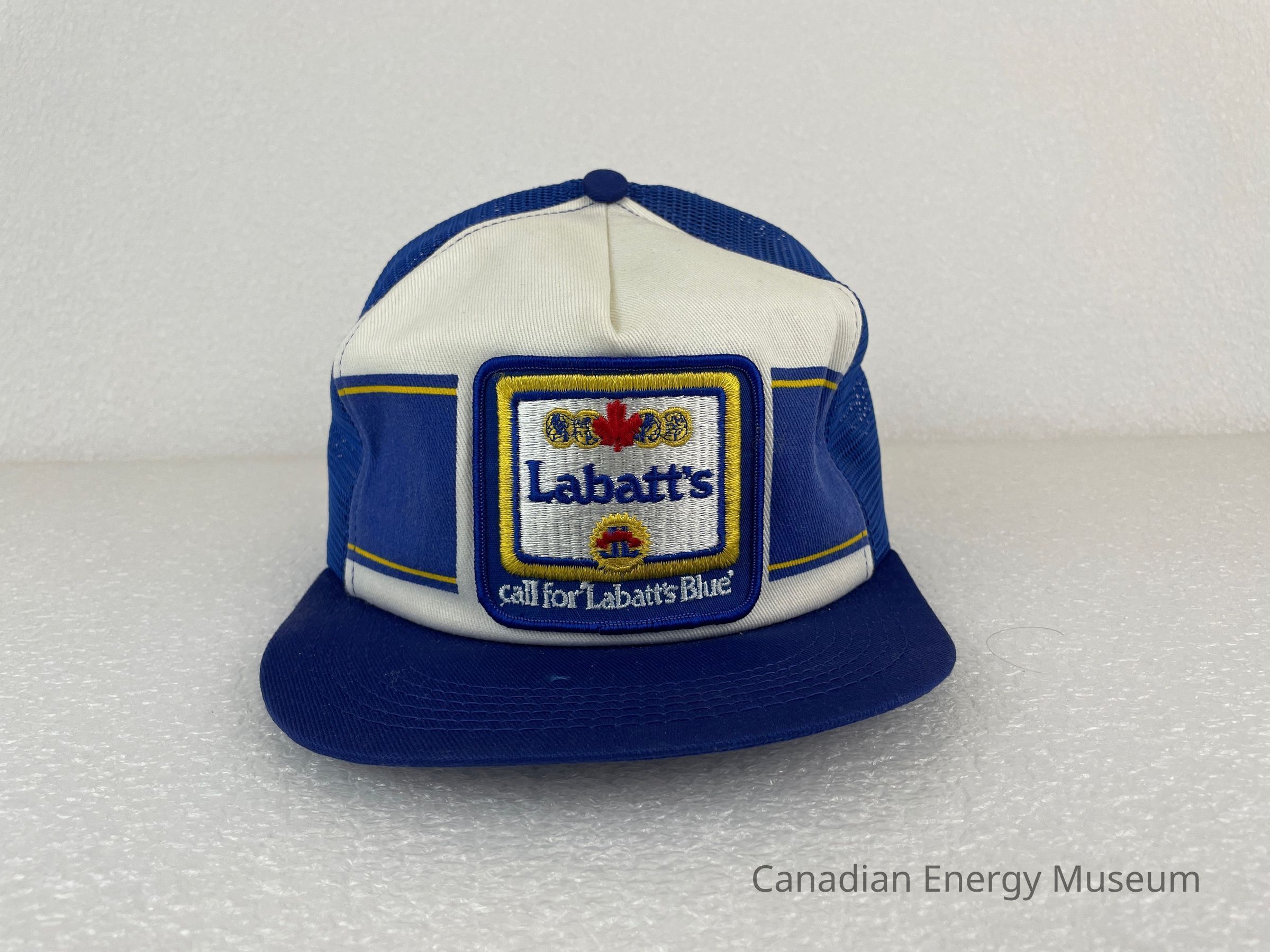 Design: A white padded crown with a large blue rectangle and two thin yellow lines branded to Labatt's. The rounded rectangle patch features a blue base with blue edge embroidery. The top centre of the patch displays a white embroidered rectangle, outlined with blue, and outlined again with yellow. The centre of the white rectangle is blue embroidered text reading, "Labatt's". Above are four yellow circles with blue embroidered designs, and a red maple leaf in the middle. At the bottom of the white rectangle is a yellow embroidered starburst with blue reflecting "L"s and a red banner. At the bottom of the patch, in white embroidered text, reads, "call for 'Labatt's Blue'".