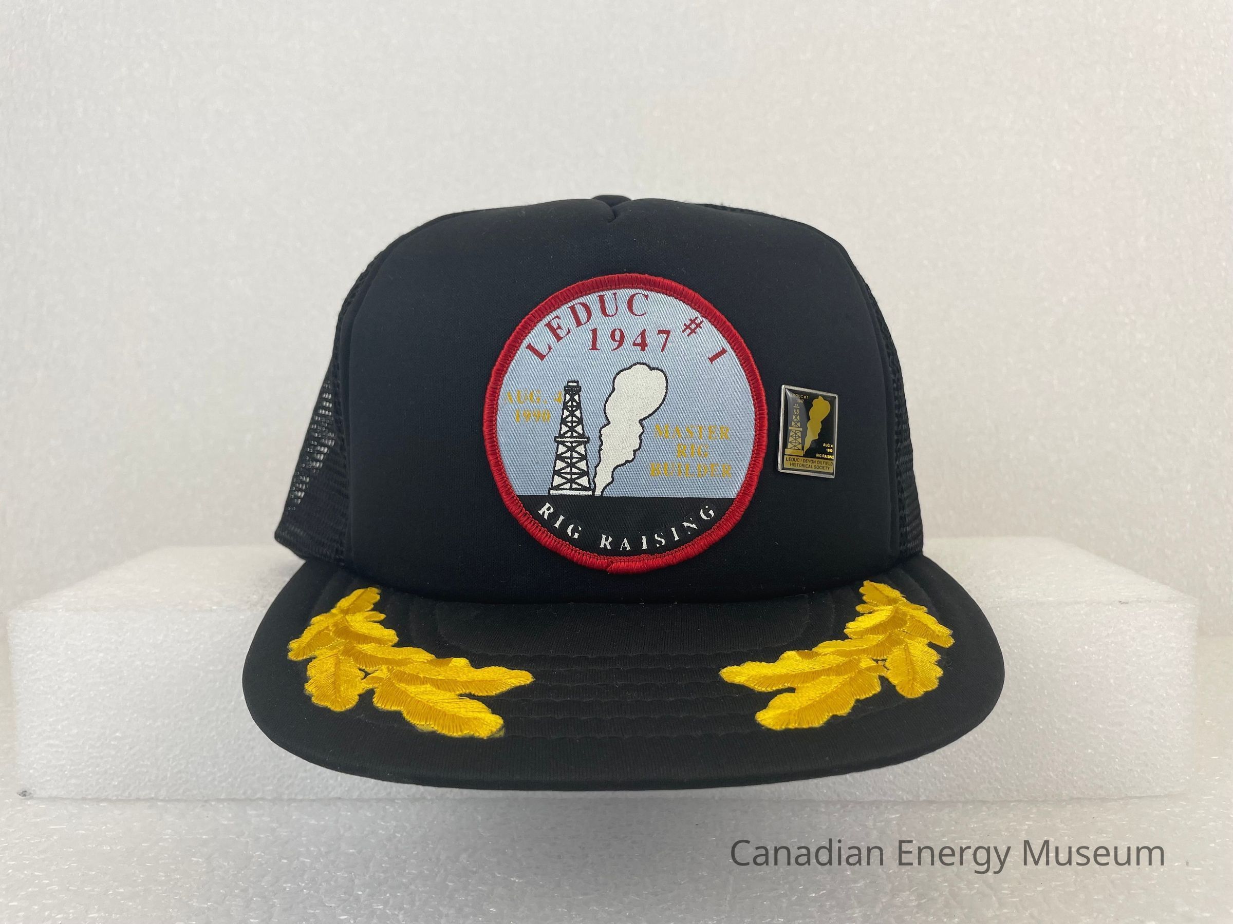 Design: A black padded crown branded to Leduc #1's Rig Raising in 1947. The circular patch features a light blue base with red edge embroidery. The patch features an image of an oil derrick with smoke rising from its base. At the top is red arched text reading, "LEDUC #1 1947", and at the bottom in white text is, "RIG RAISING". Yellow text is placed on either side of the derrick, with the left reading, "AUG. 4 1990", and the right reading, "MASTER RIG BUILDER".