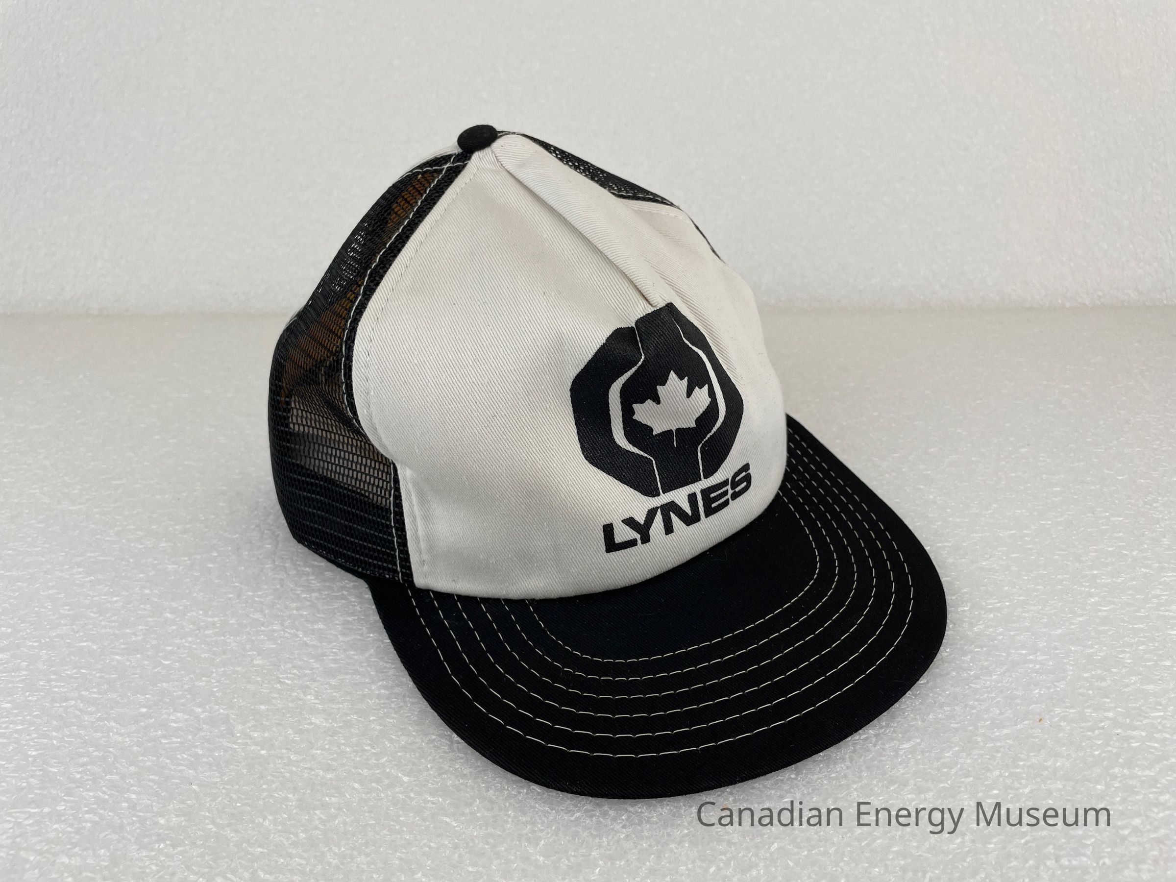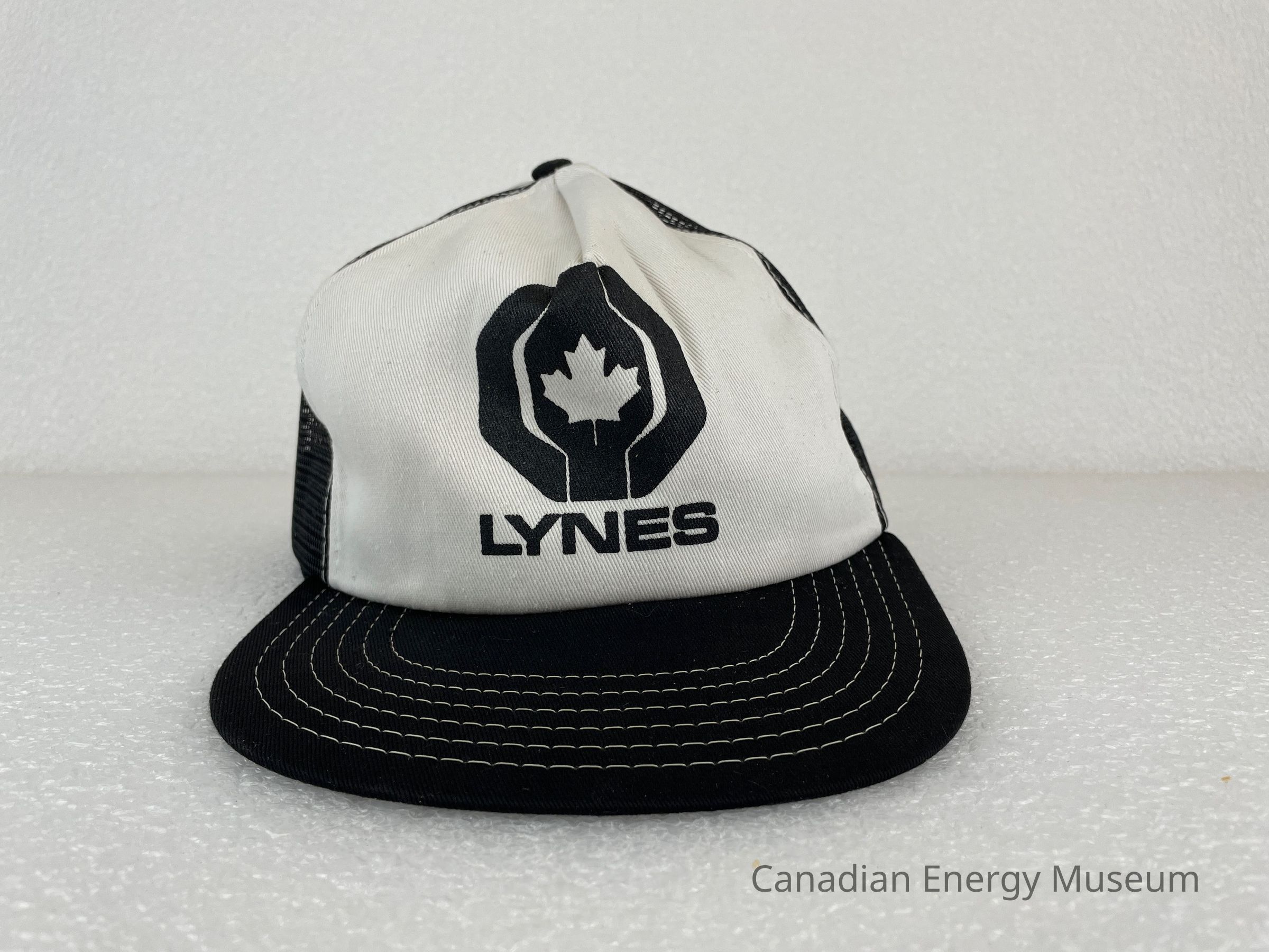 Design: A white padded crown branded to Lynes. The crown features a black logo roughly shaped like a hexagon, two shapely lines running through the middle, and a white maple leaf in the centre. Below is black text, reading, "LYNES".