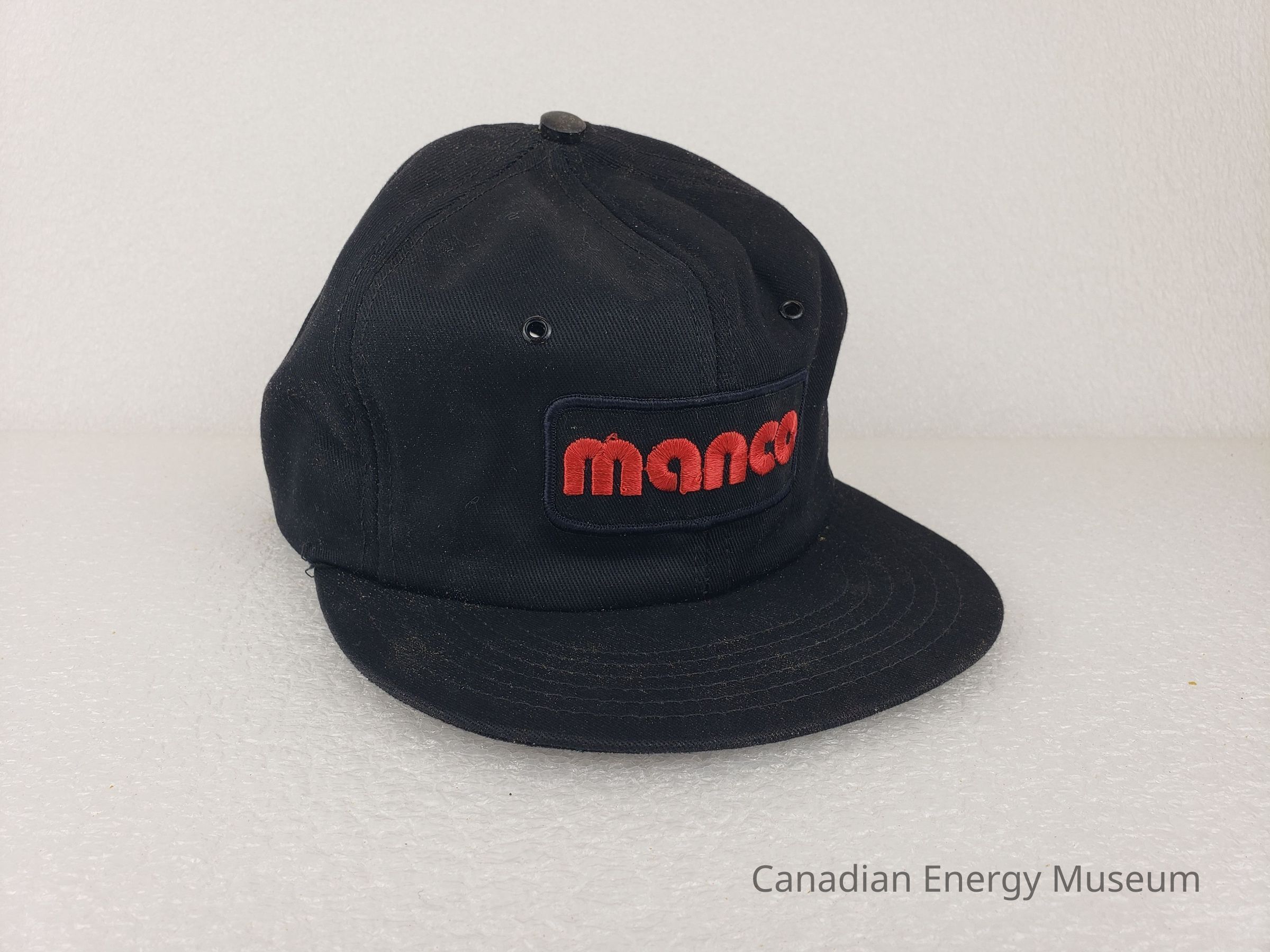A trucker style cap with an embroidered patch branded for Manco.