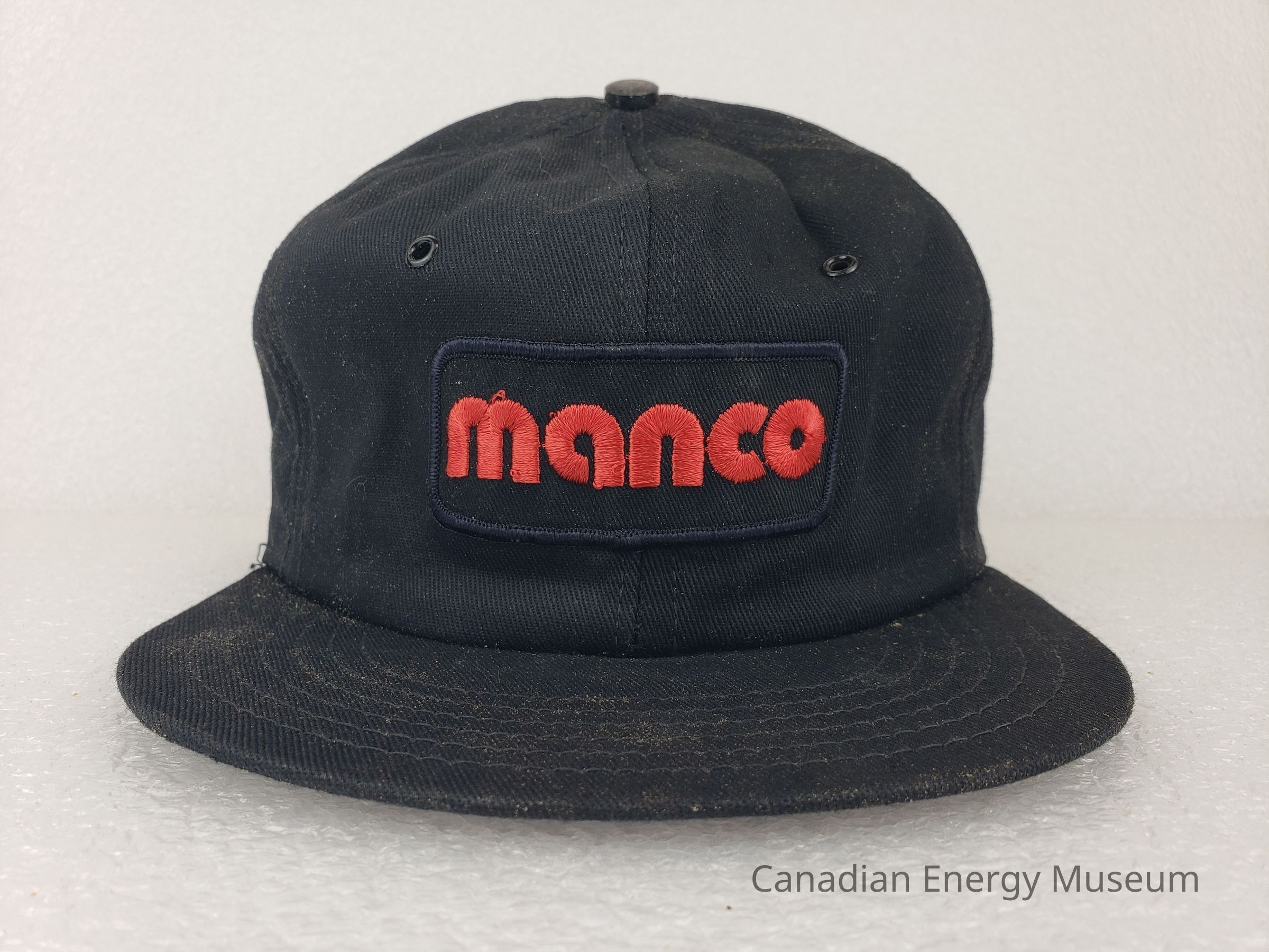 Design: A black padded fabric cap with an embroidered patch branded for Manco. The patch features a black base with black edge embroidery. The patch displays a rounded sans-serif font that reads, "manco" in red embroidery.