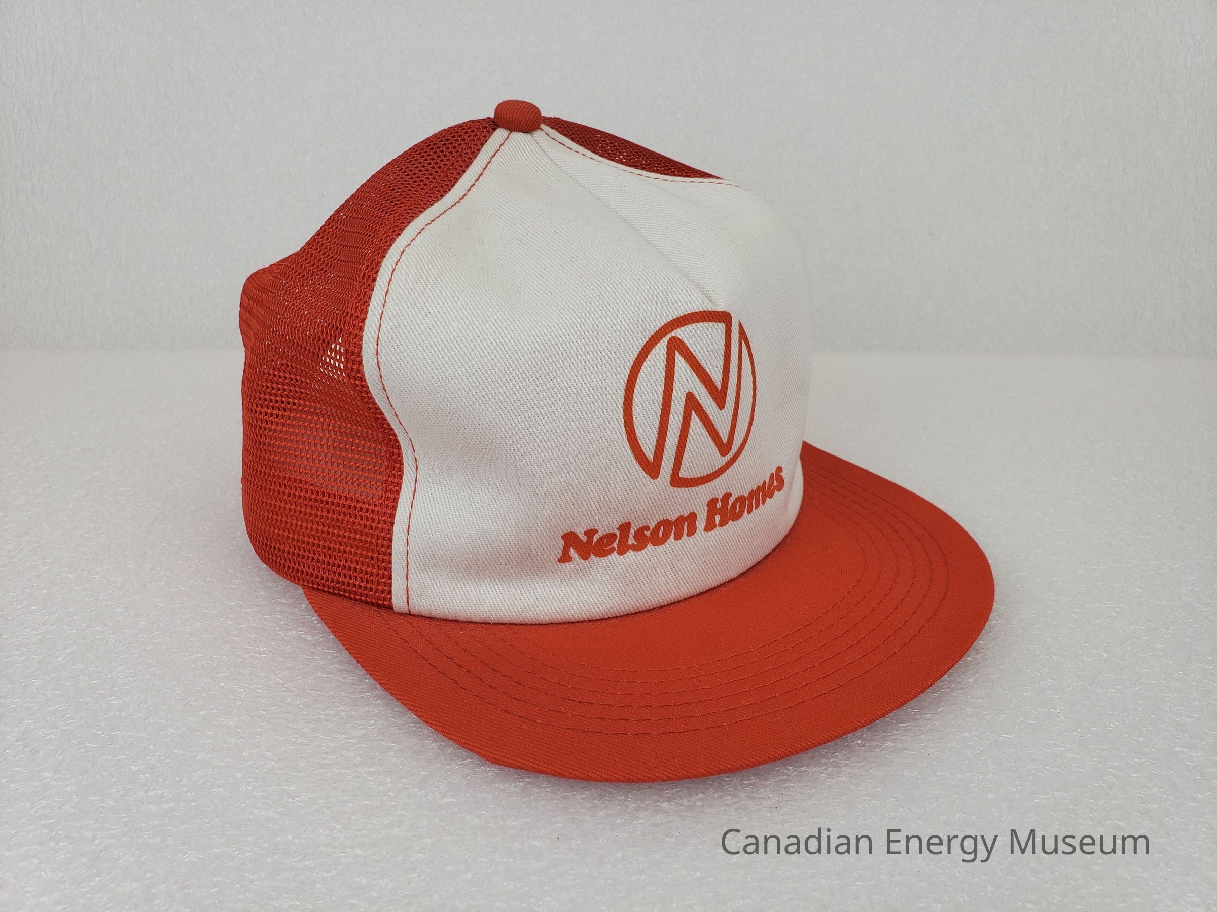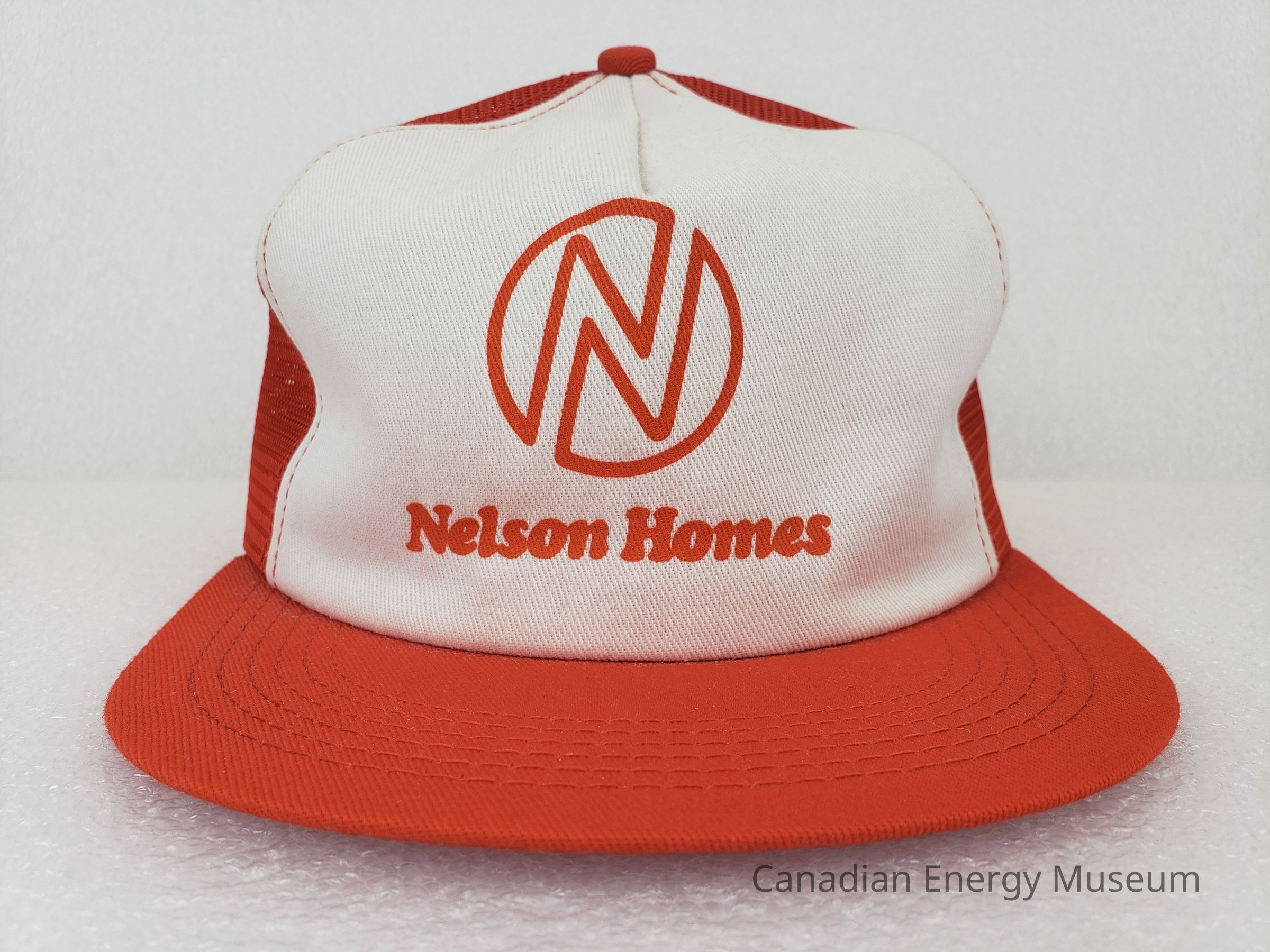 Design: On the front (crown) of the cap is printed a large, simple logo in the upper-centre, in orange-red; with the rounded serif text "Nelson Homes" below the logo.