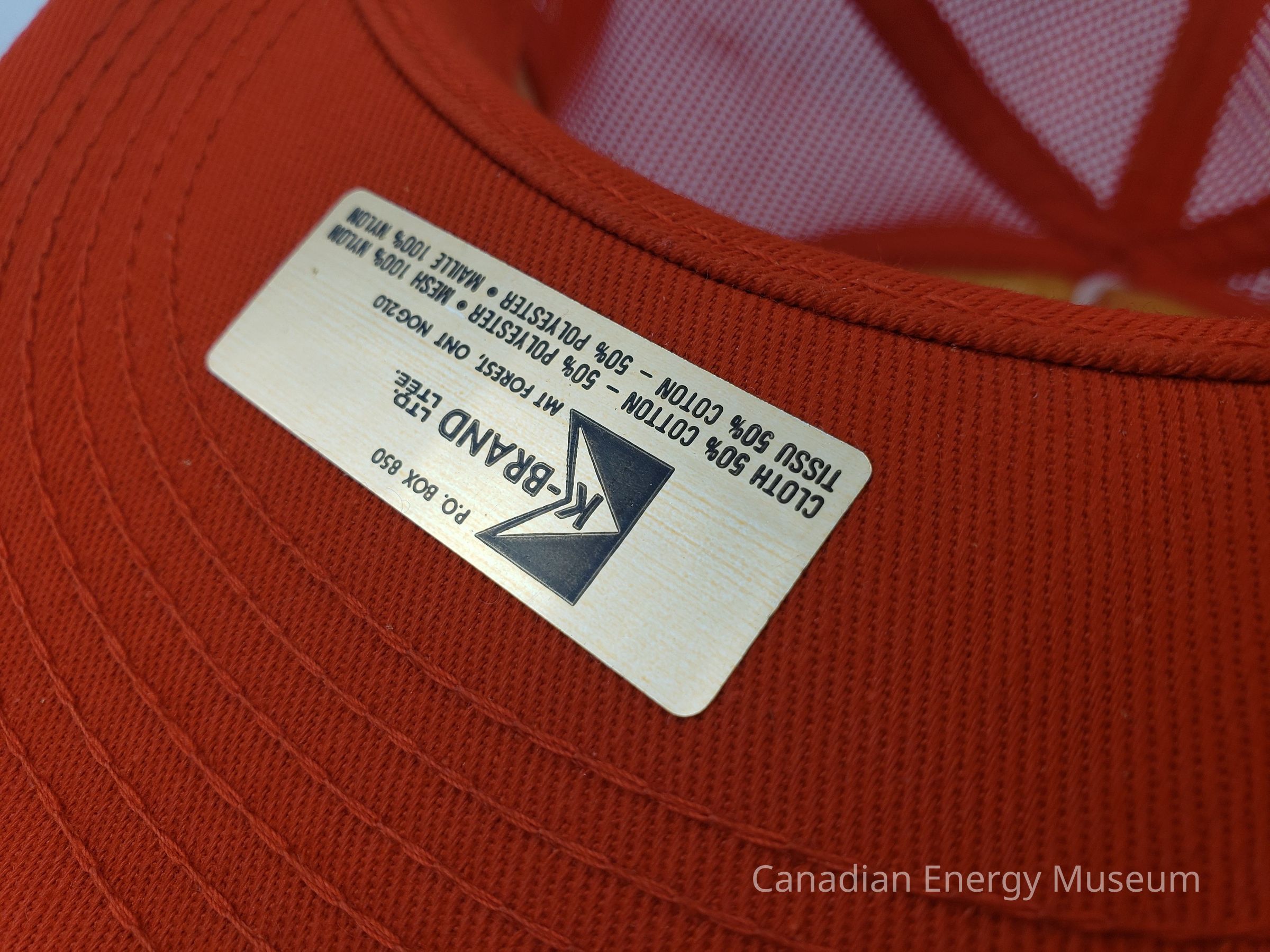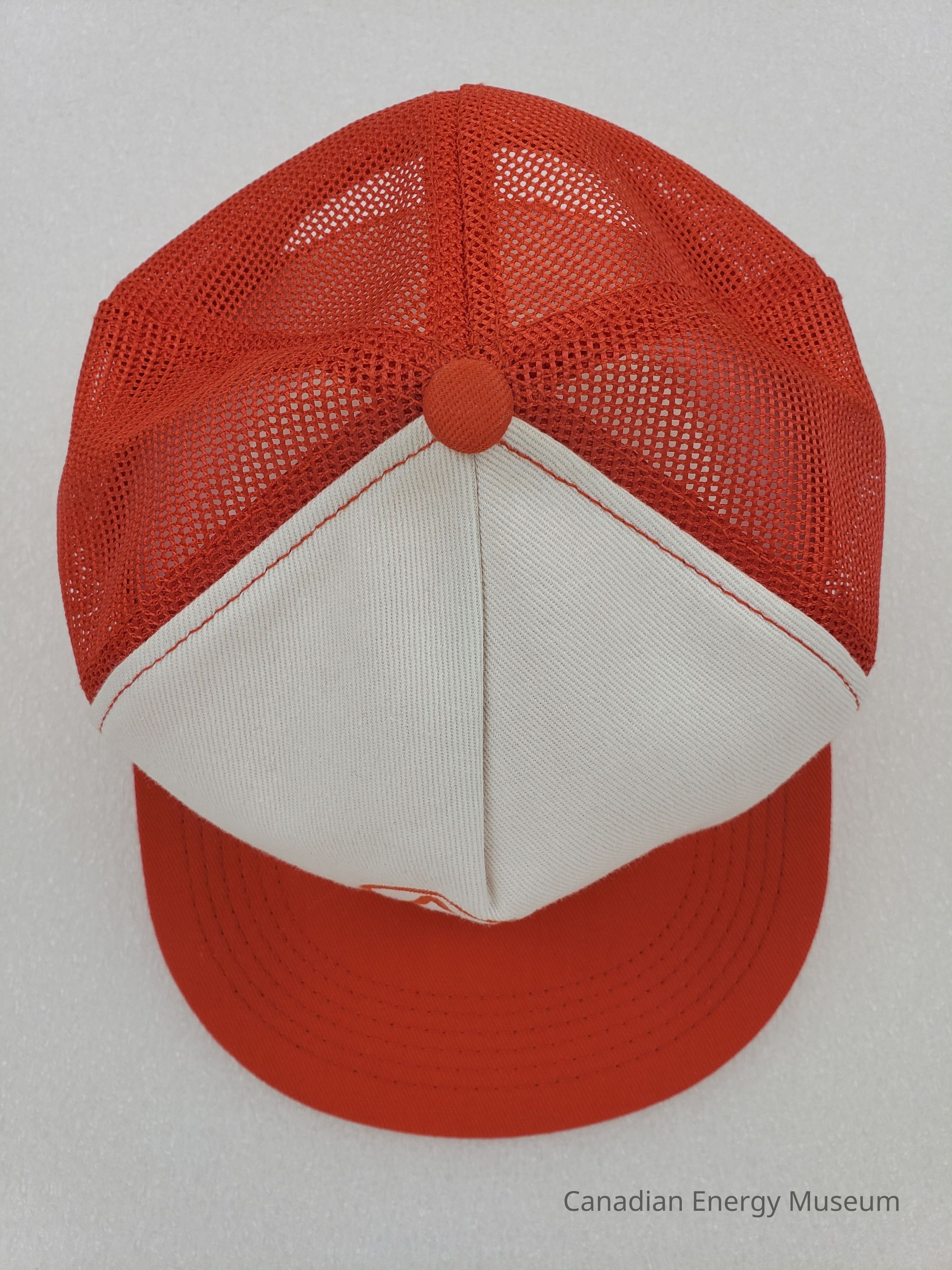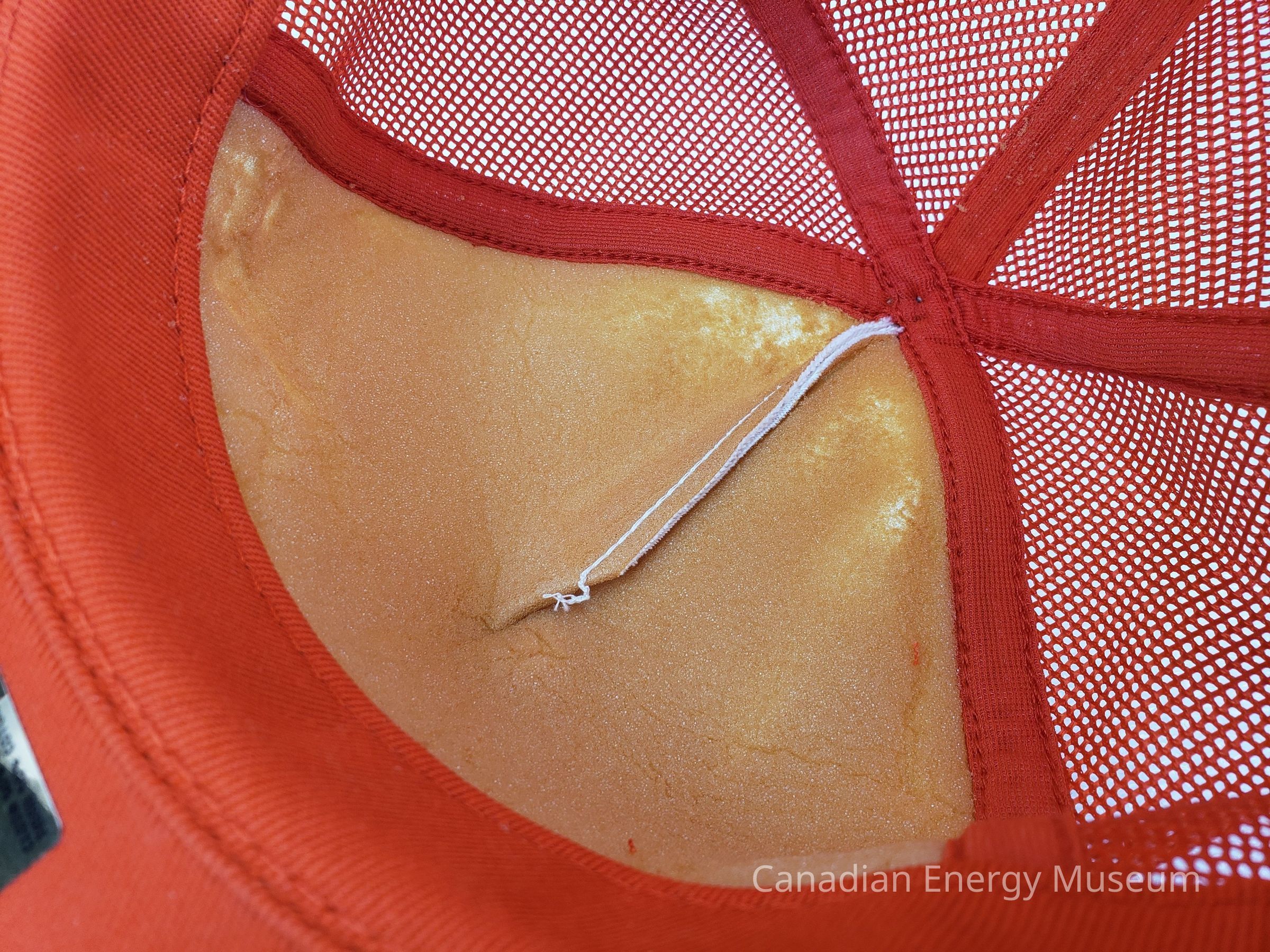 Brim: Fabric, denim orange-red with orange-red stitching.