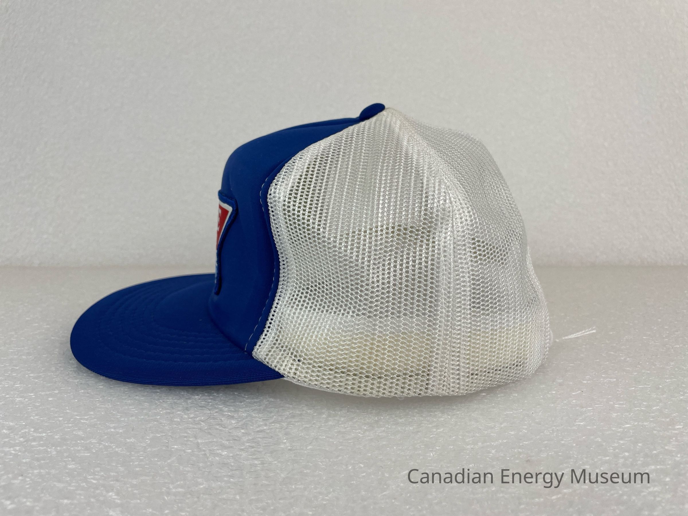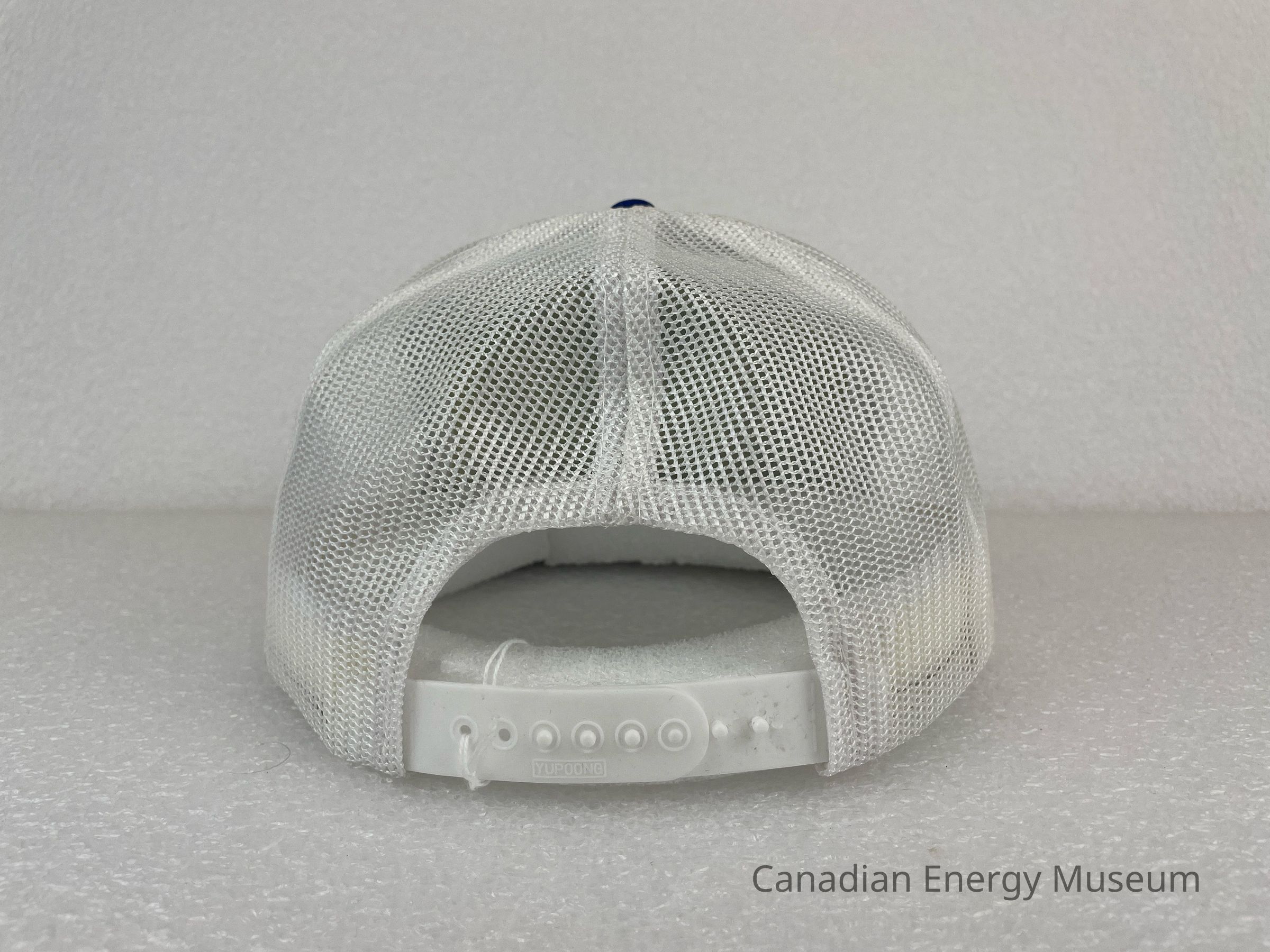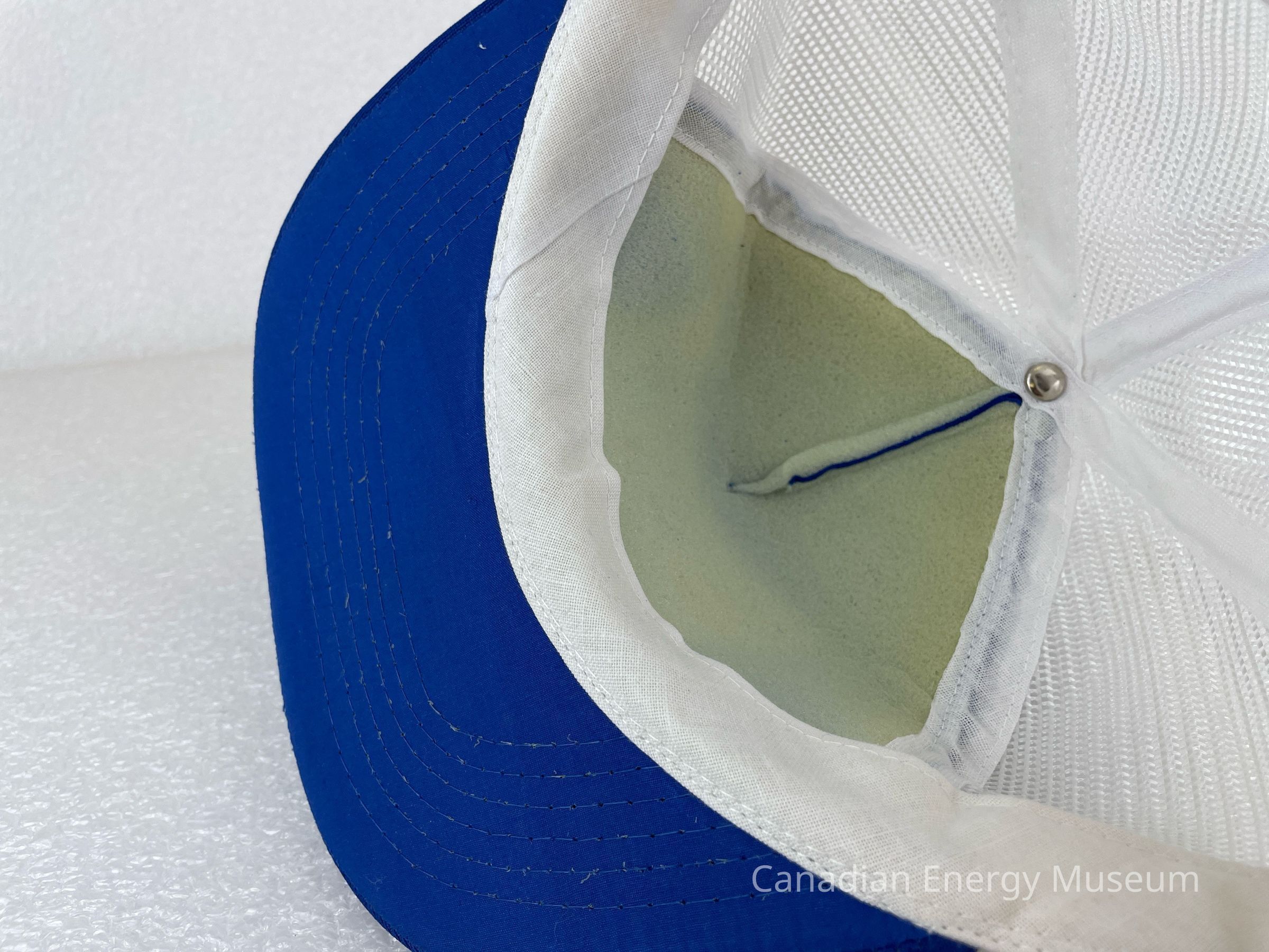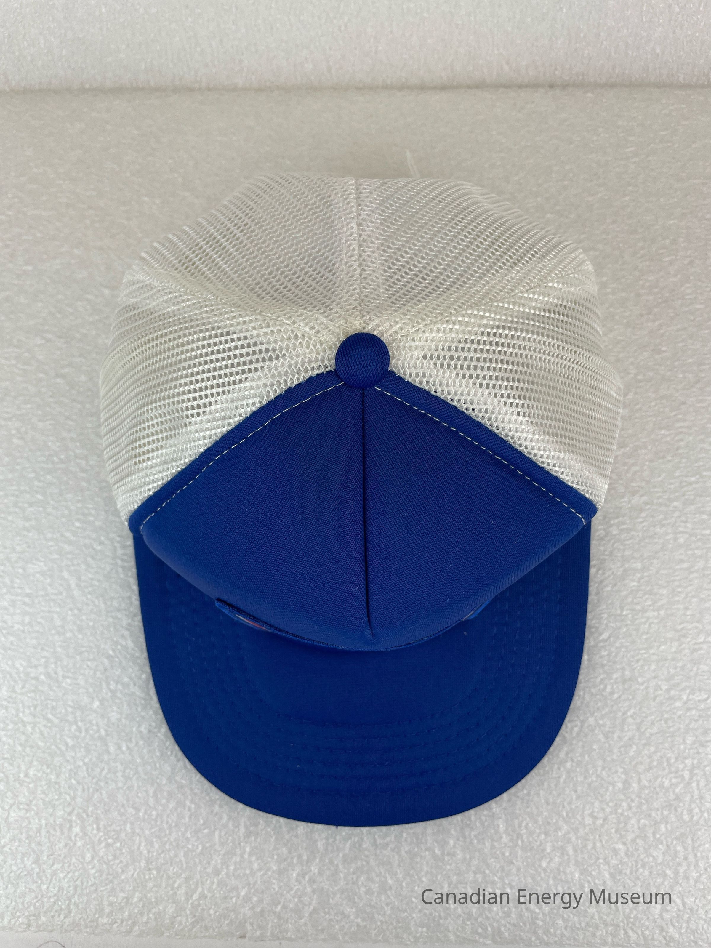 Crown Material: Foam backing with fabric outer, blue with white stitching.