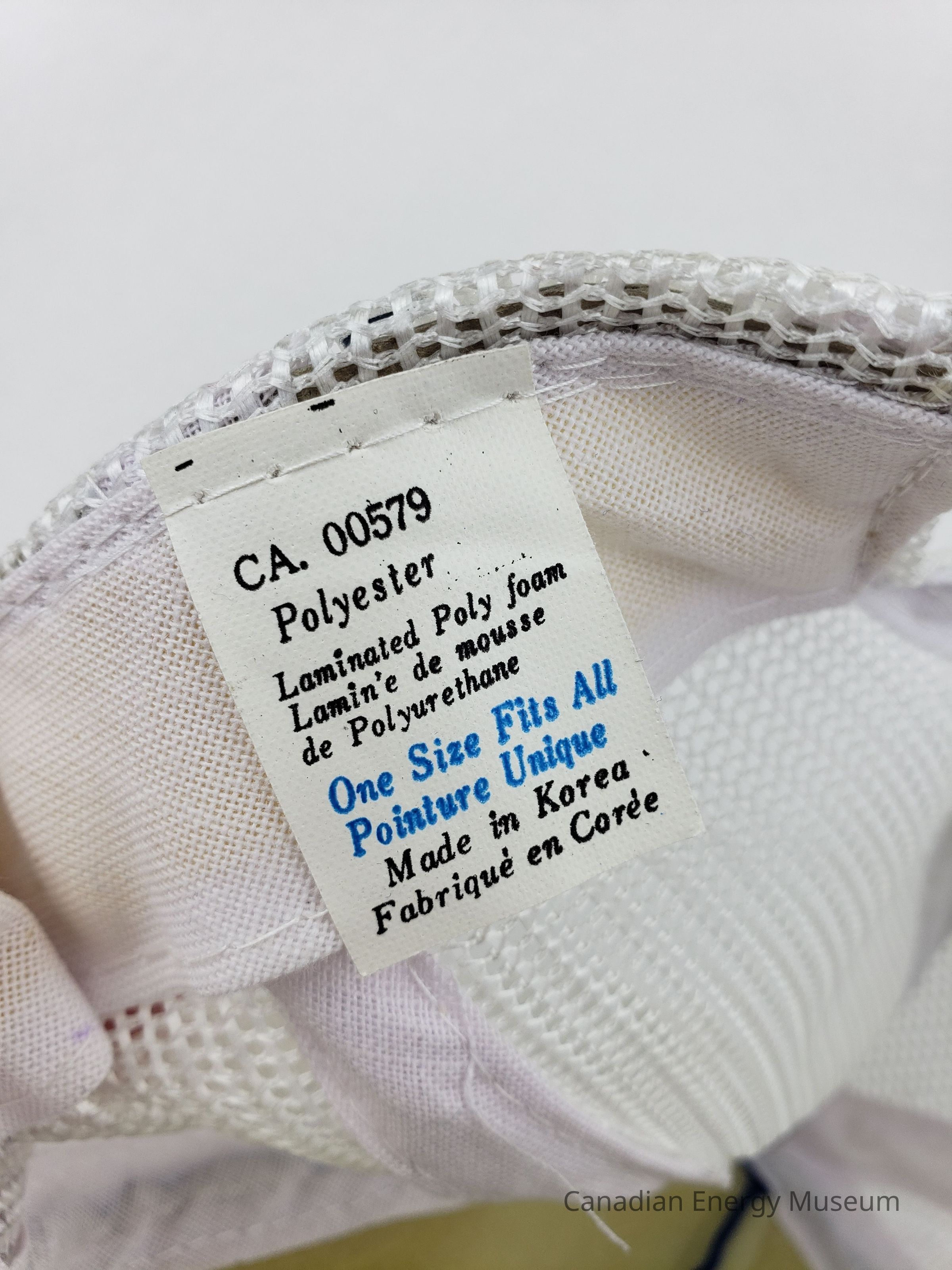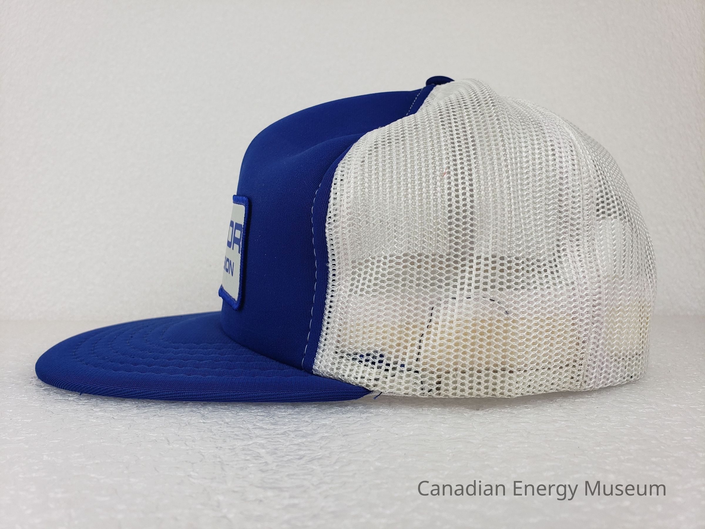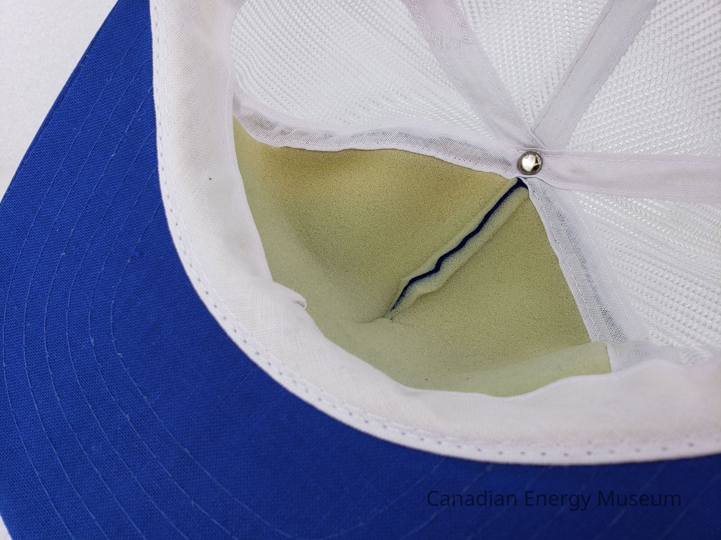 Crown Material: Foam backing with fabric outer, blue with white stitching.