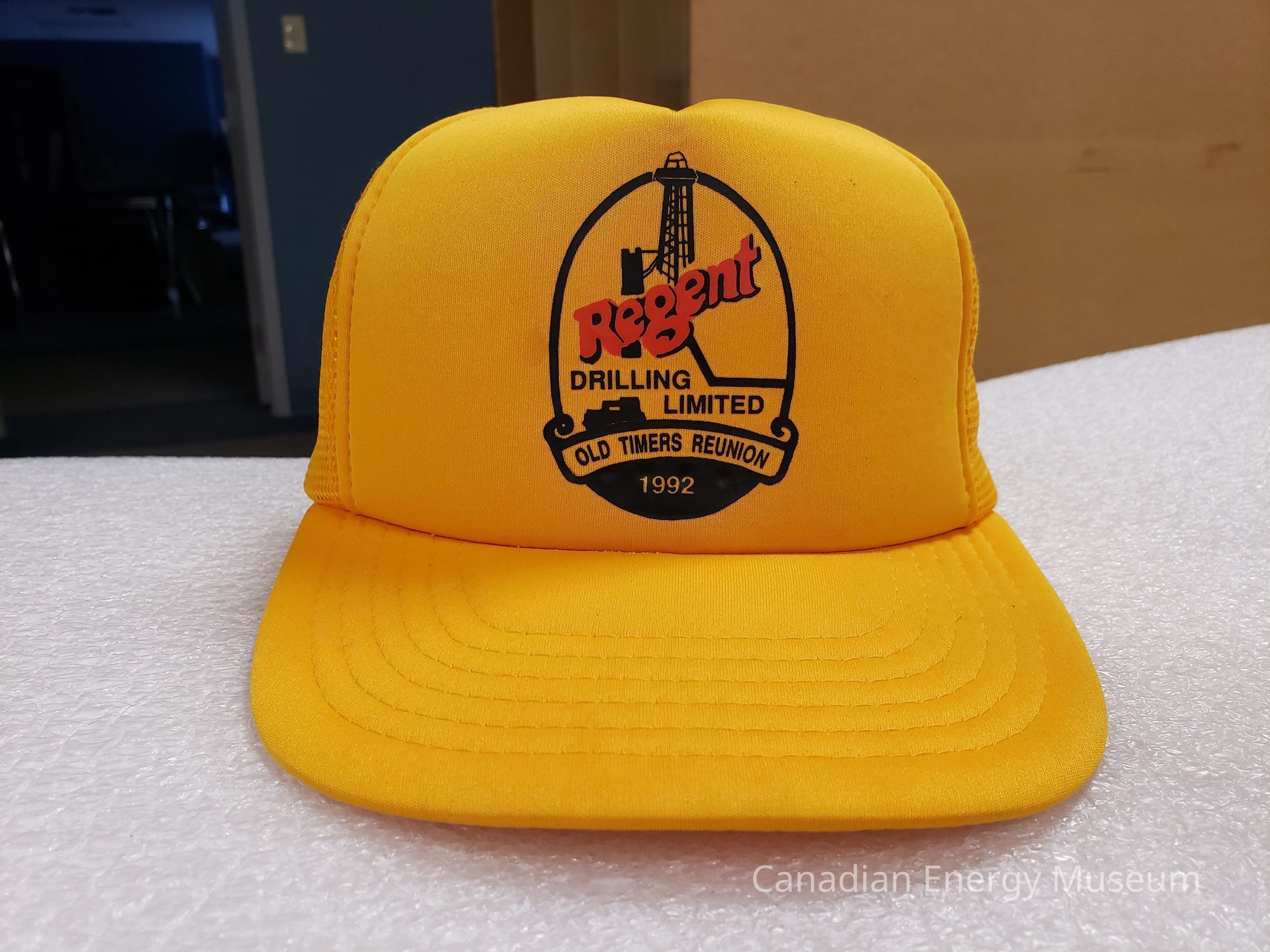 Trucker cap, branded to Regent Drilling Ltd for the occasion of the 1992 "Old Timers Reunion". Yellow visor and front panels, with yellow mesh body.