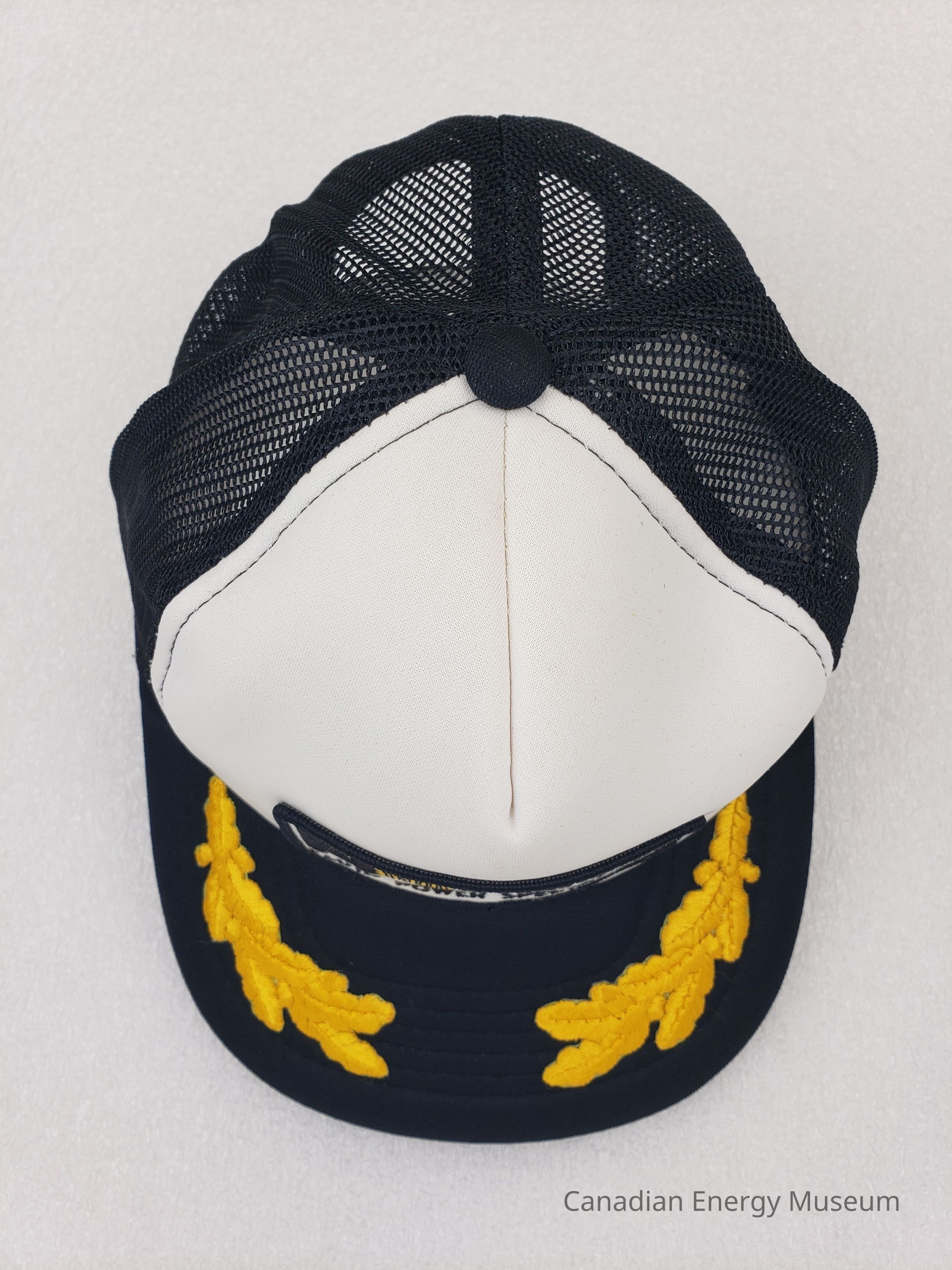 Crown Material: Foam backing with fabric outer, white with black stitching.