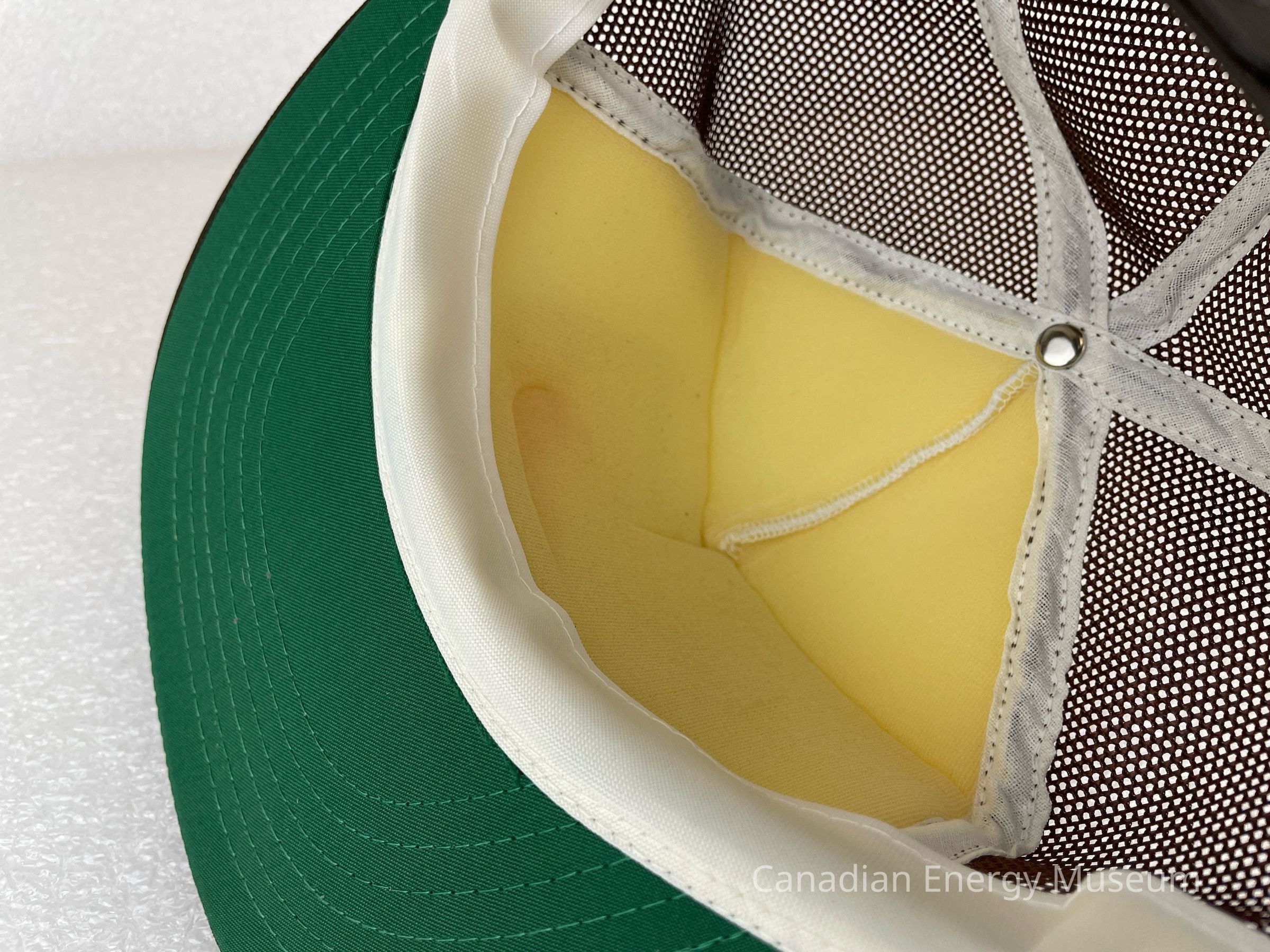 Crown Material: Foam backing with fabric outer, white with brown stitching.