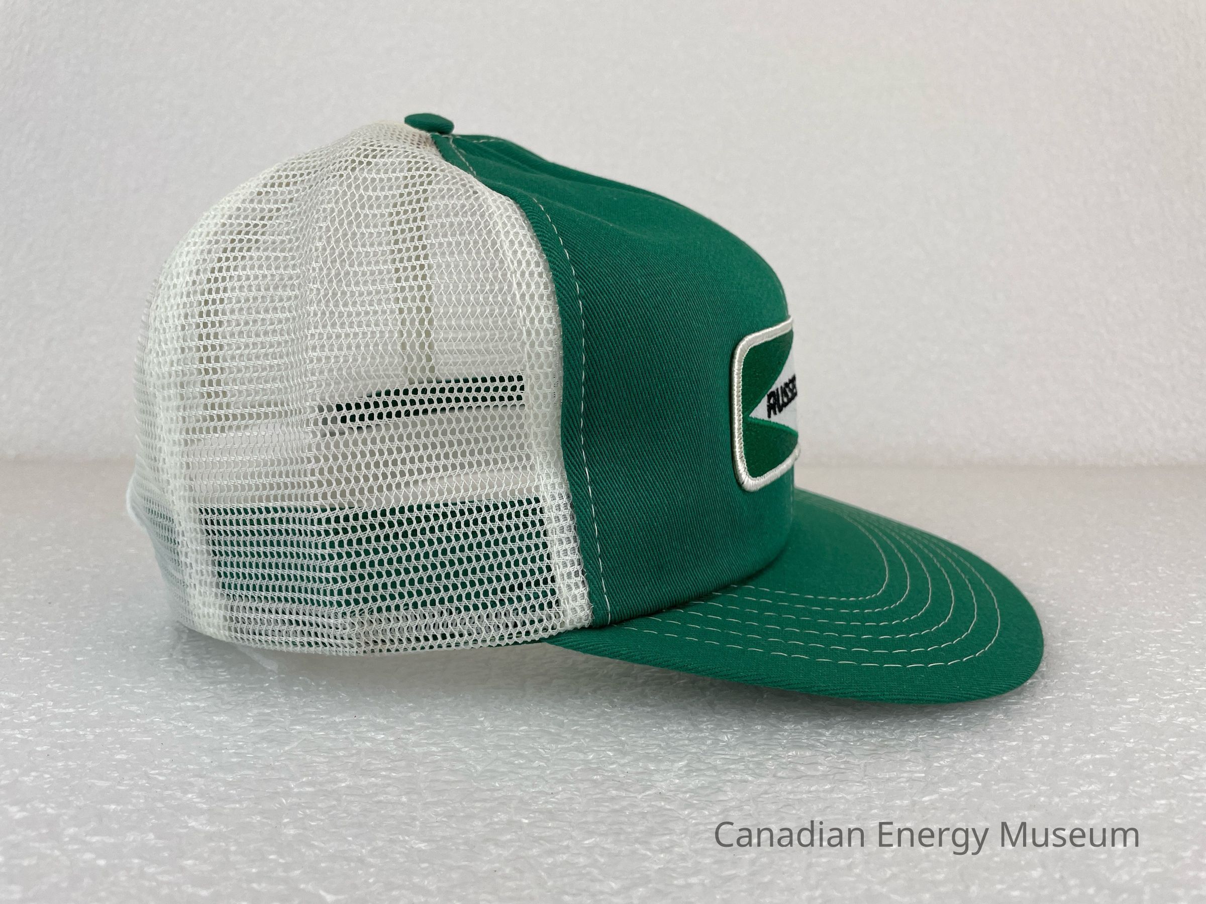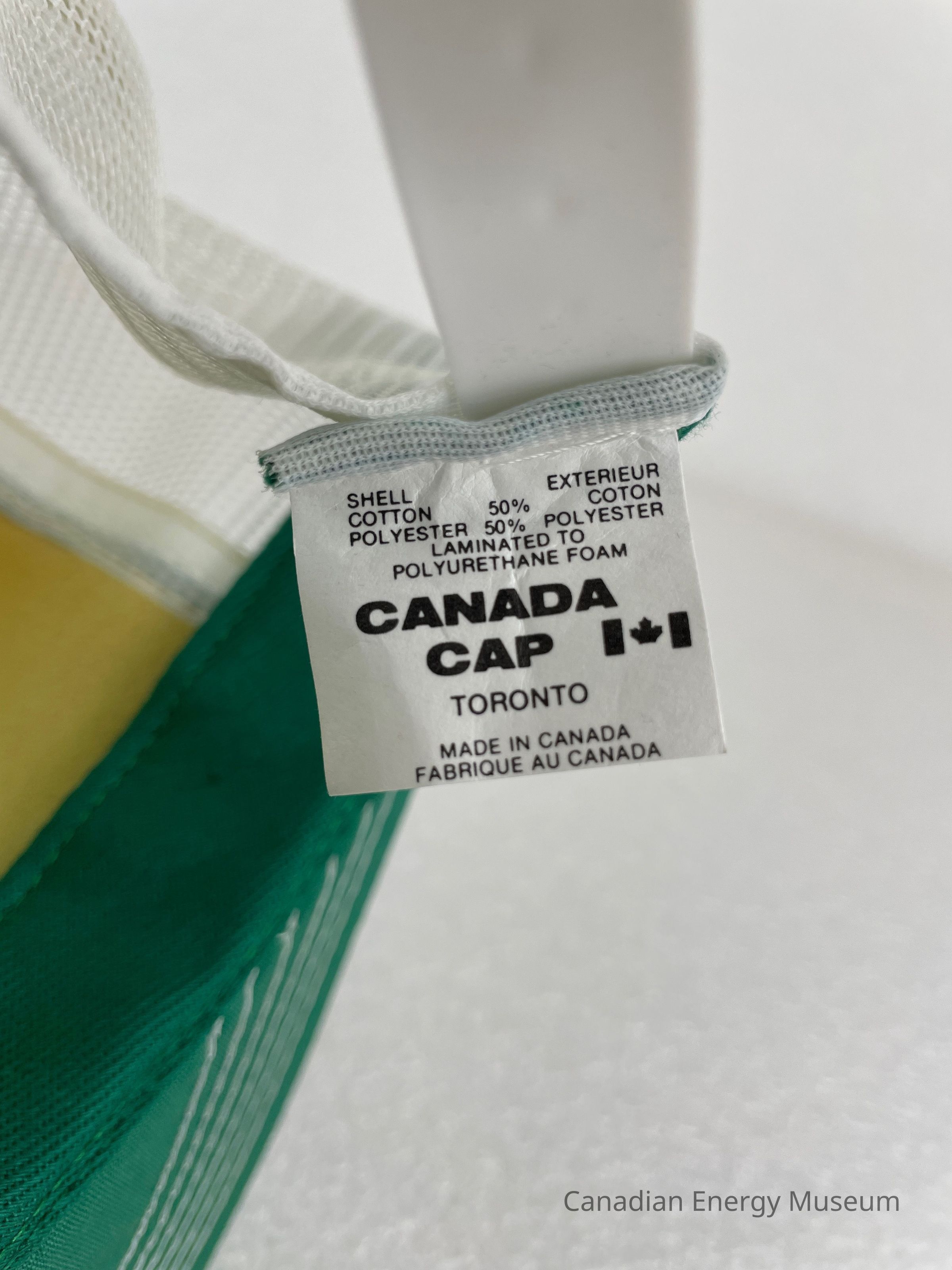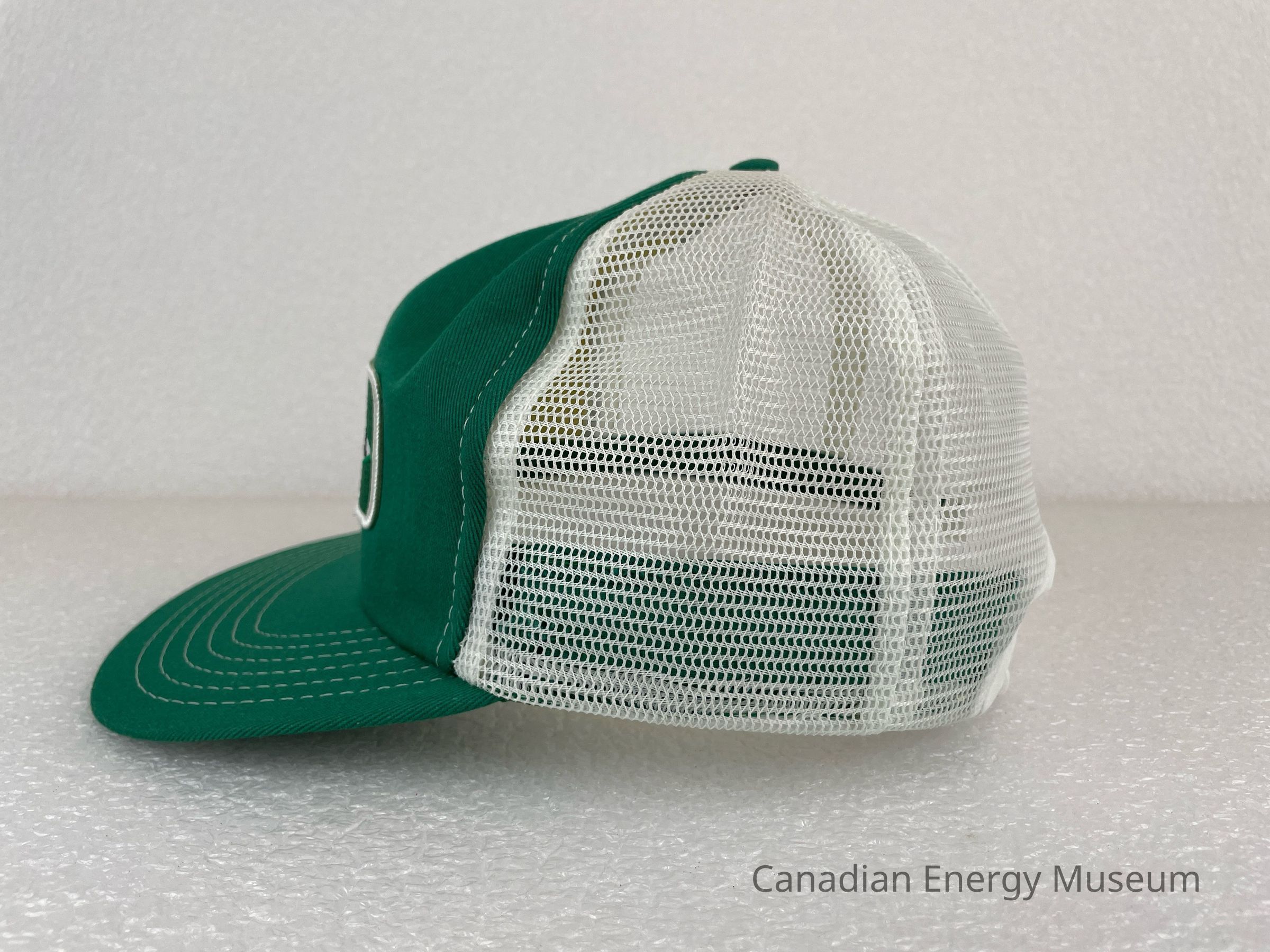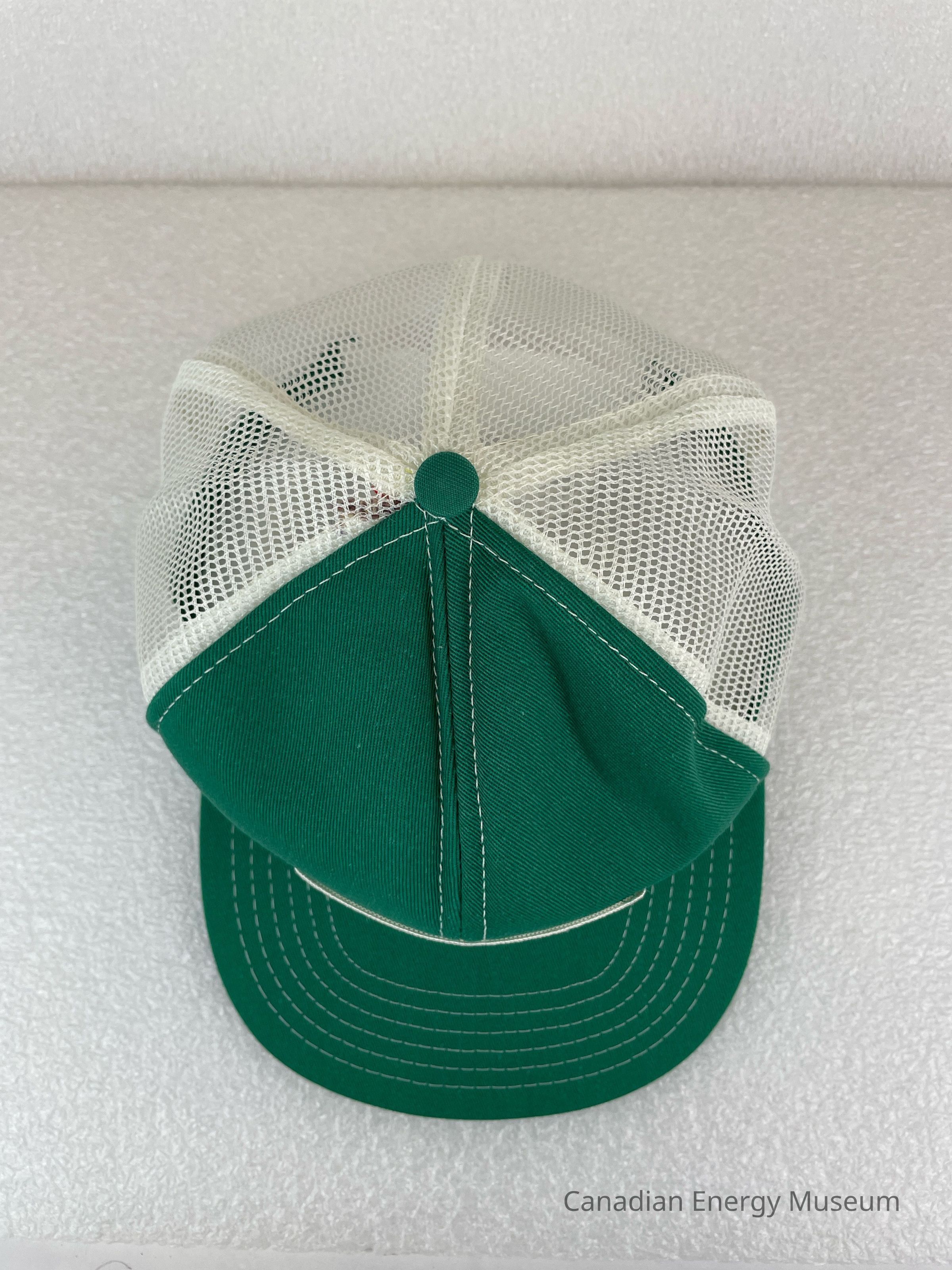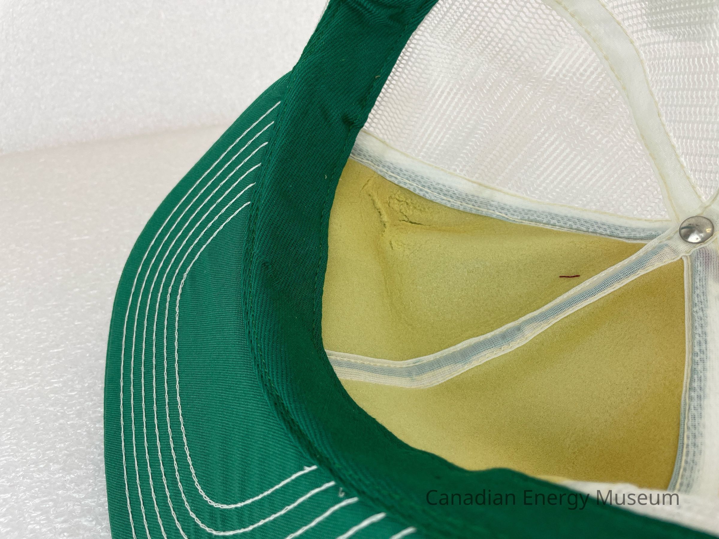 Crown Material: Foam backing with fabric outer, green with white stitching.
