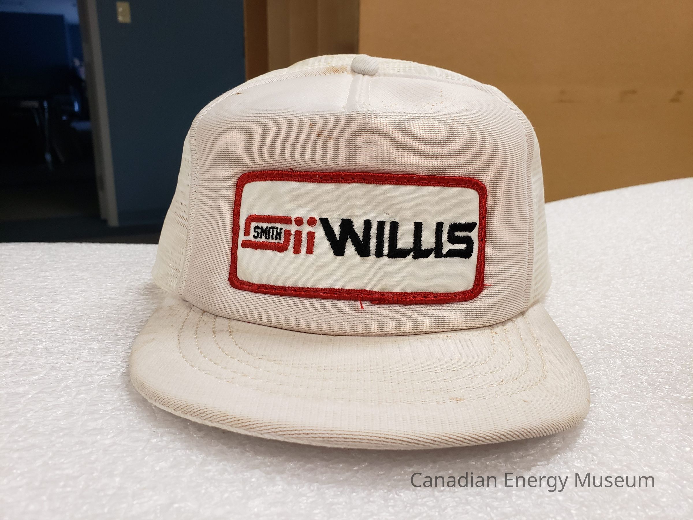 Trucker cap, branded to Smith Willis. White front panels, mesh body, and visor.