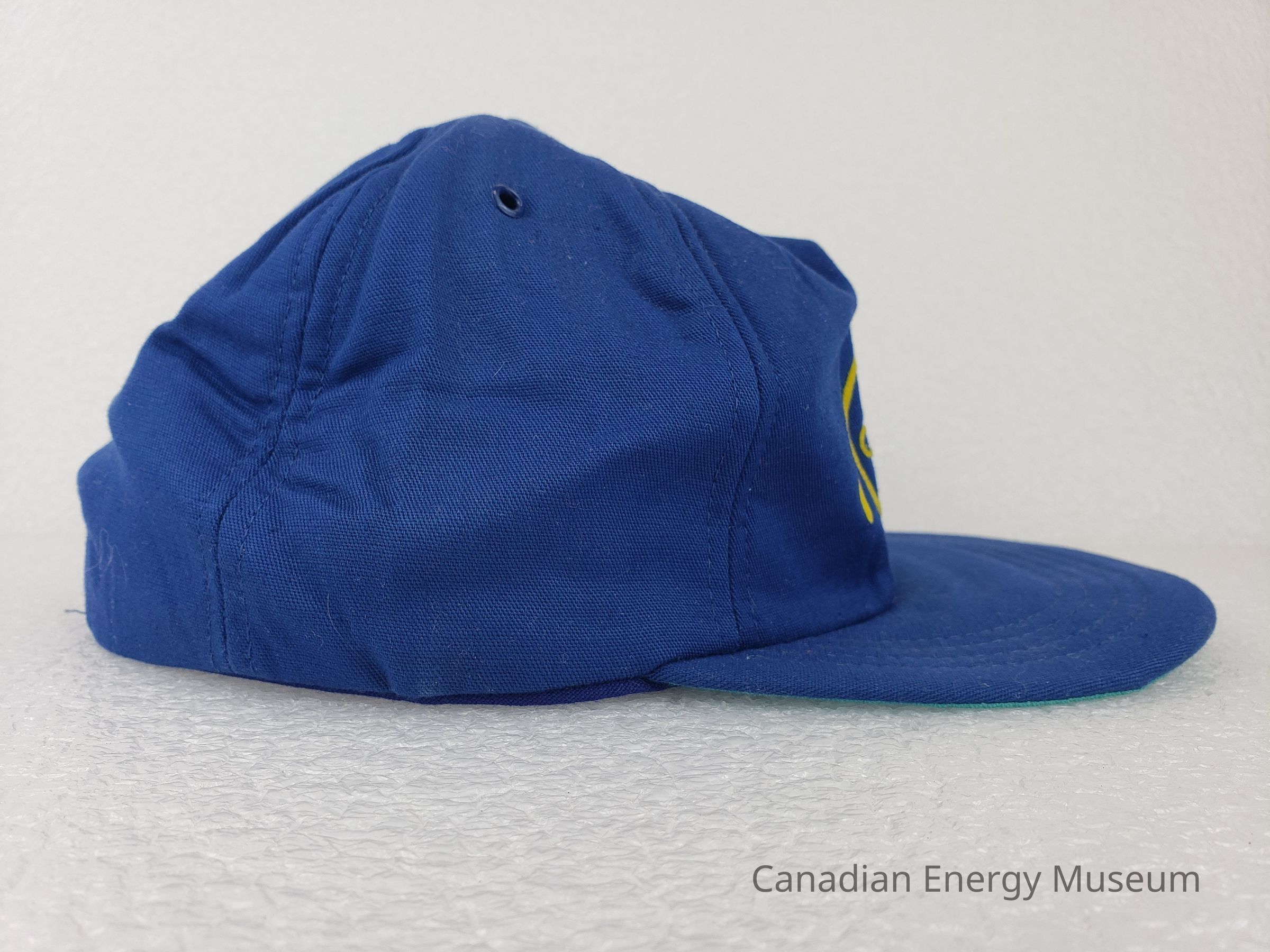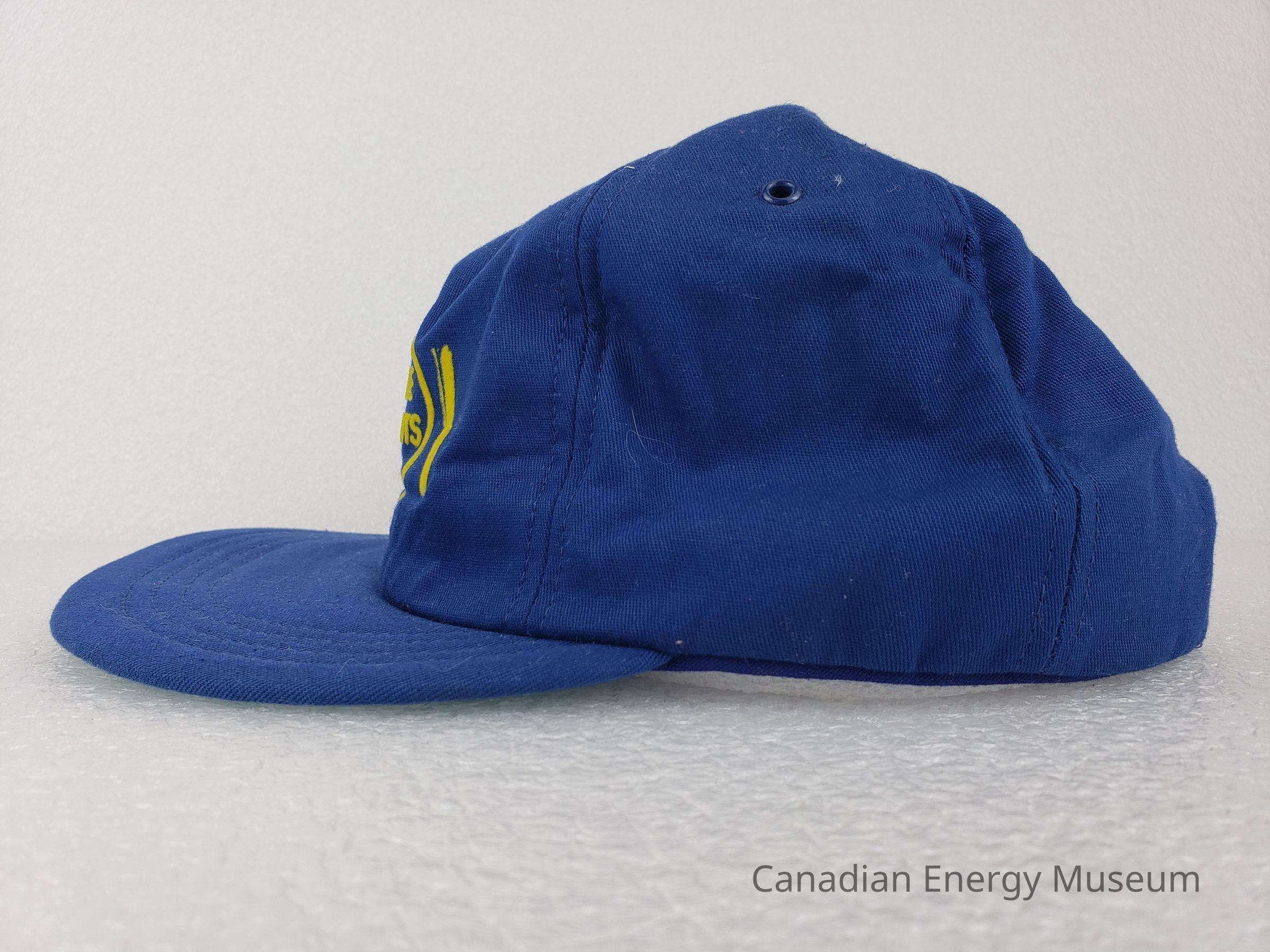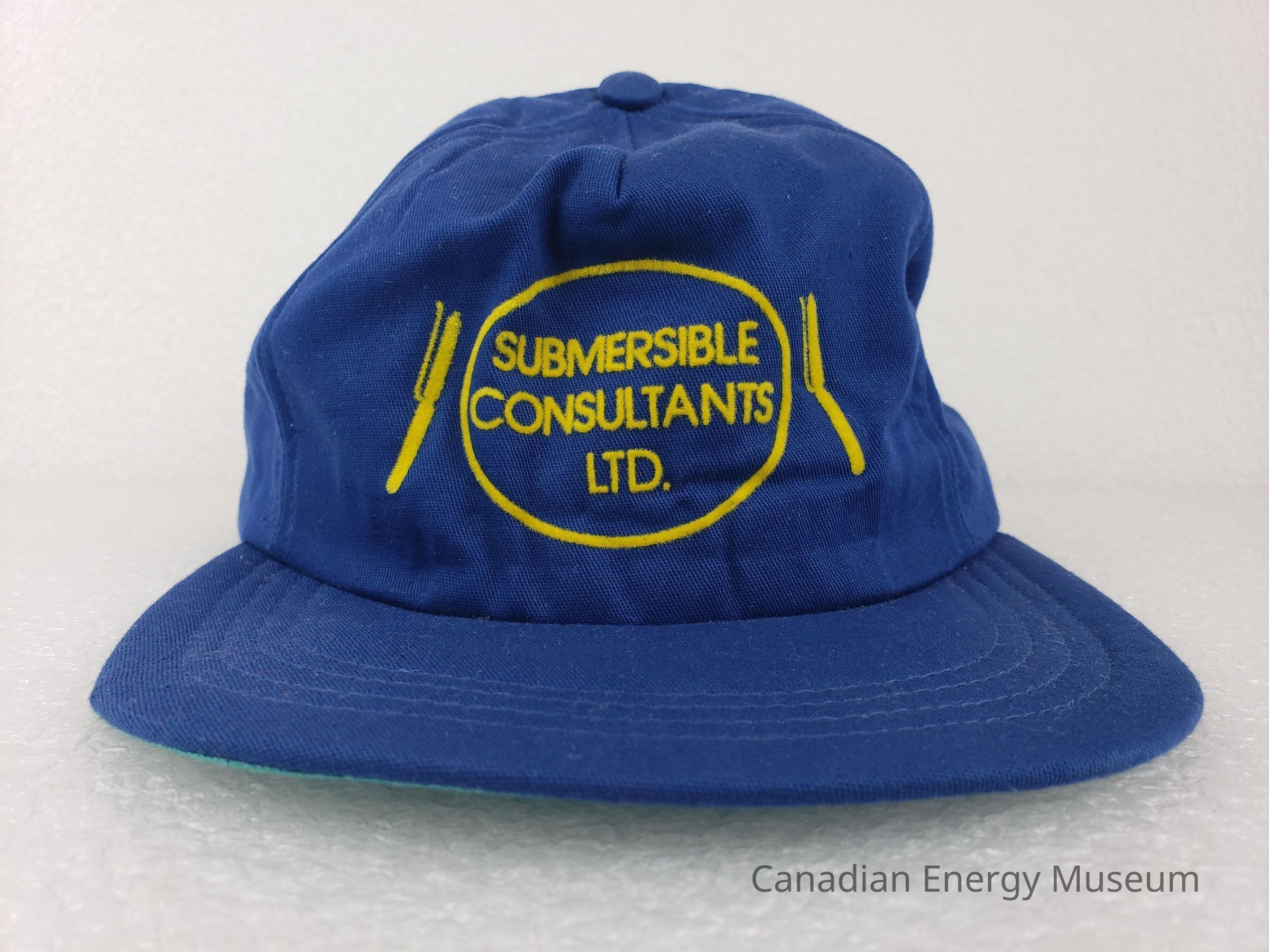 Design: A blue fabric cap with a flocked logo design branded for Submersible Consultants Ltd. The design features a yellow circle outline with yellow text, "SUBMERSIBLE CONSULTANTS LTD." Outside of the circle, on both the left and right, are mirrored yellow tube-shaped objects.