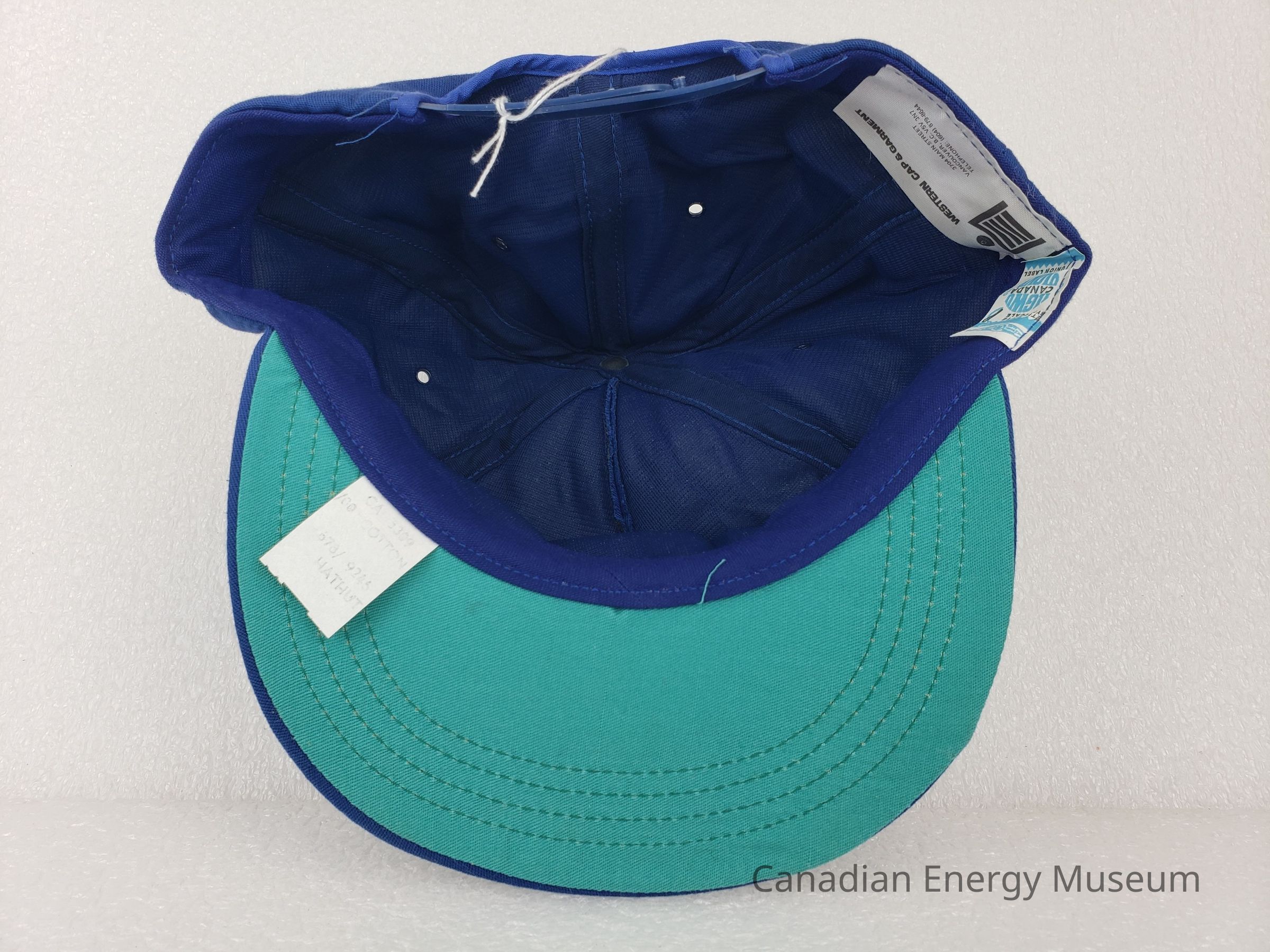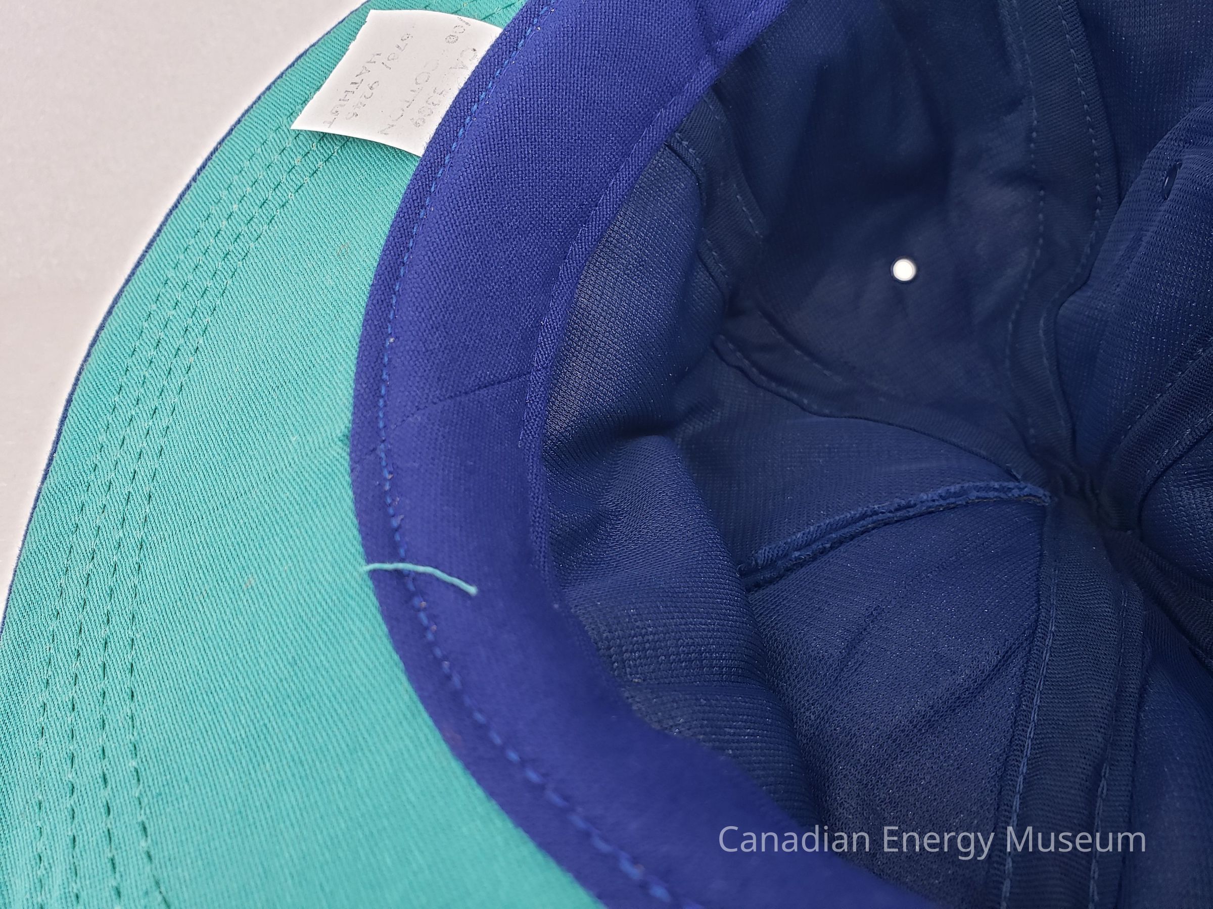 Brim: Fabric-covered, blue with blue stitching. Bottom of brim is fabric covered, green with green stitching