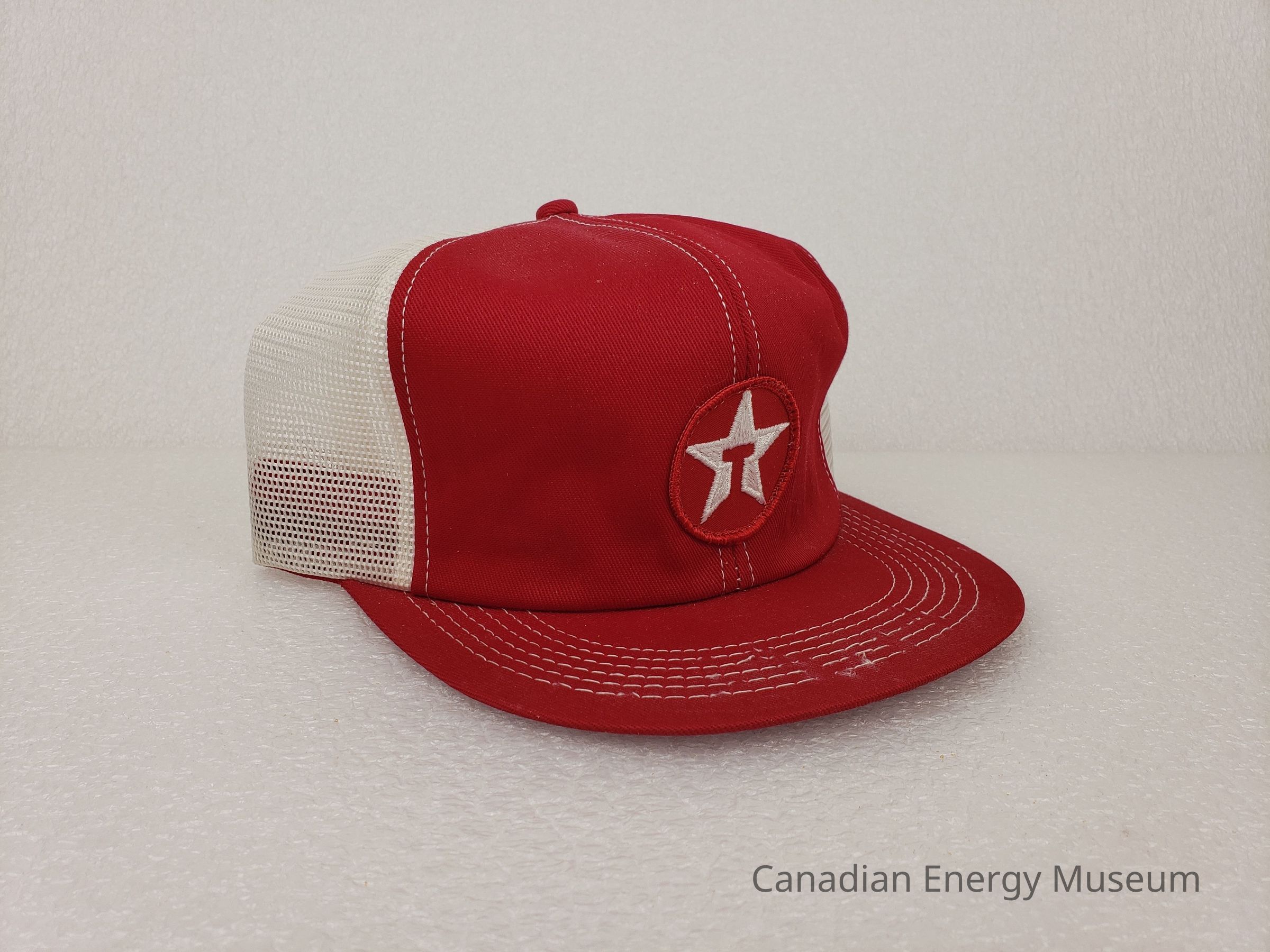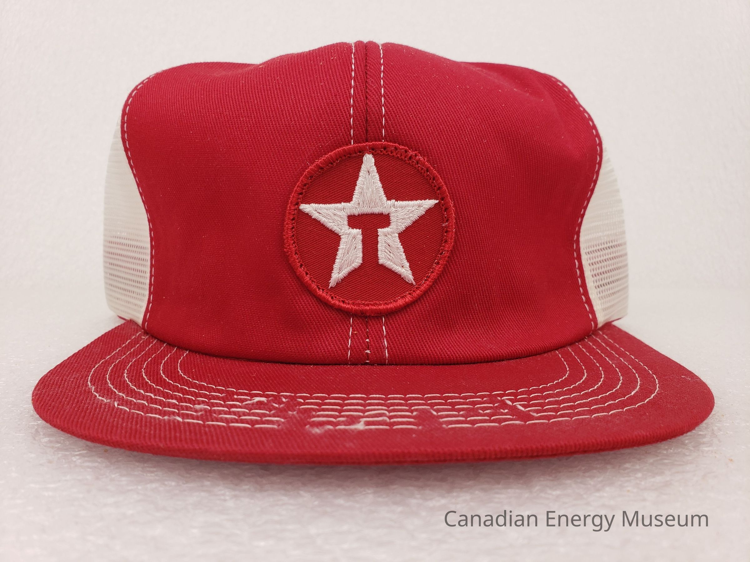 Textile, Texaco, Cap, Hat, White, Red, Plastic, Accessory, Clothing, Oil, Oil Industry, Promotional Item, Trucker Cap, Patch, EmbroideryDescription
