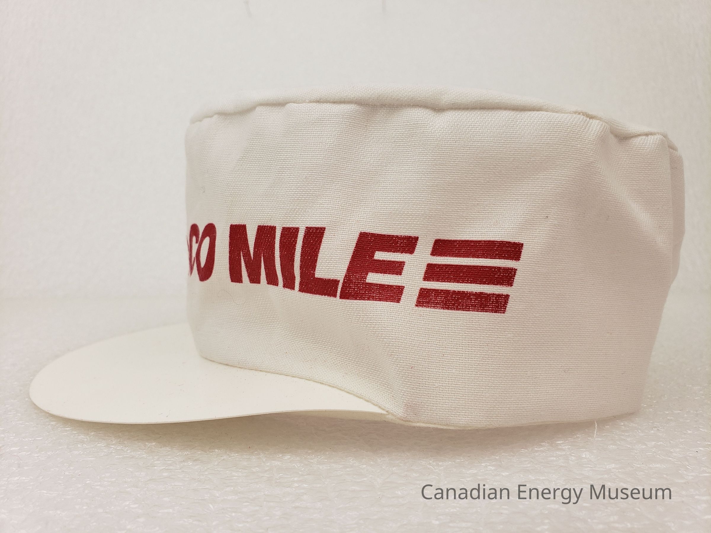 Design: Across the front, in red text "TEXACO MILE" with the round star Texaco logo in red to the left of the text; and three stripes to either side of the above elements (coming to a point on the left, and rectangular to the right). On the flat top of the cap is a larger version of the round star Texaco logo.