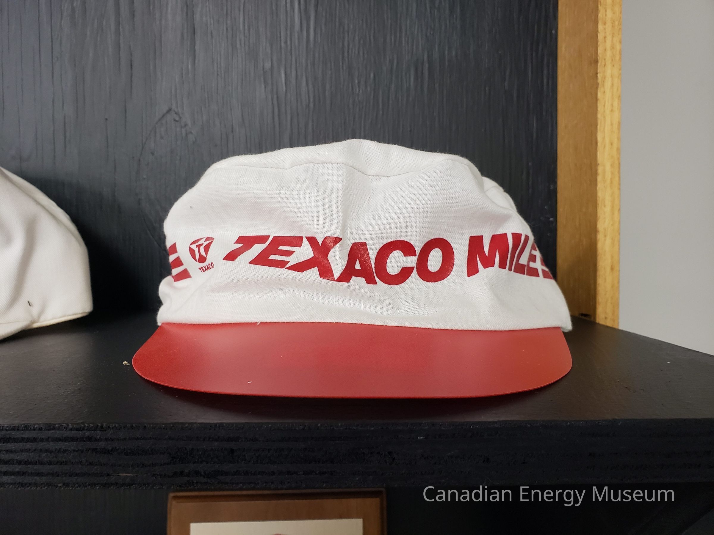 Light white canvas cap, with a red plastic brim. Across the front is the red block text "TEXACO MILES" with tri-lines either side and the round star Texaco logo to the left. Back has an elastic strip.Collection