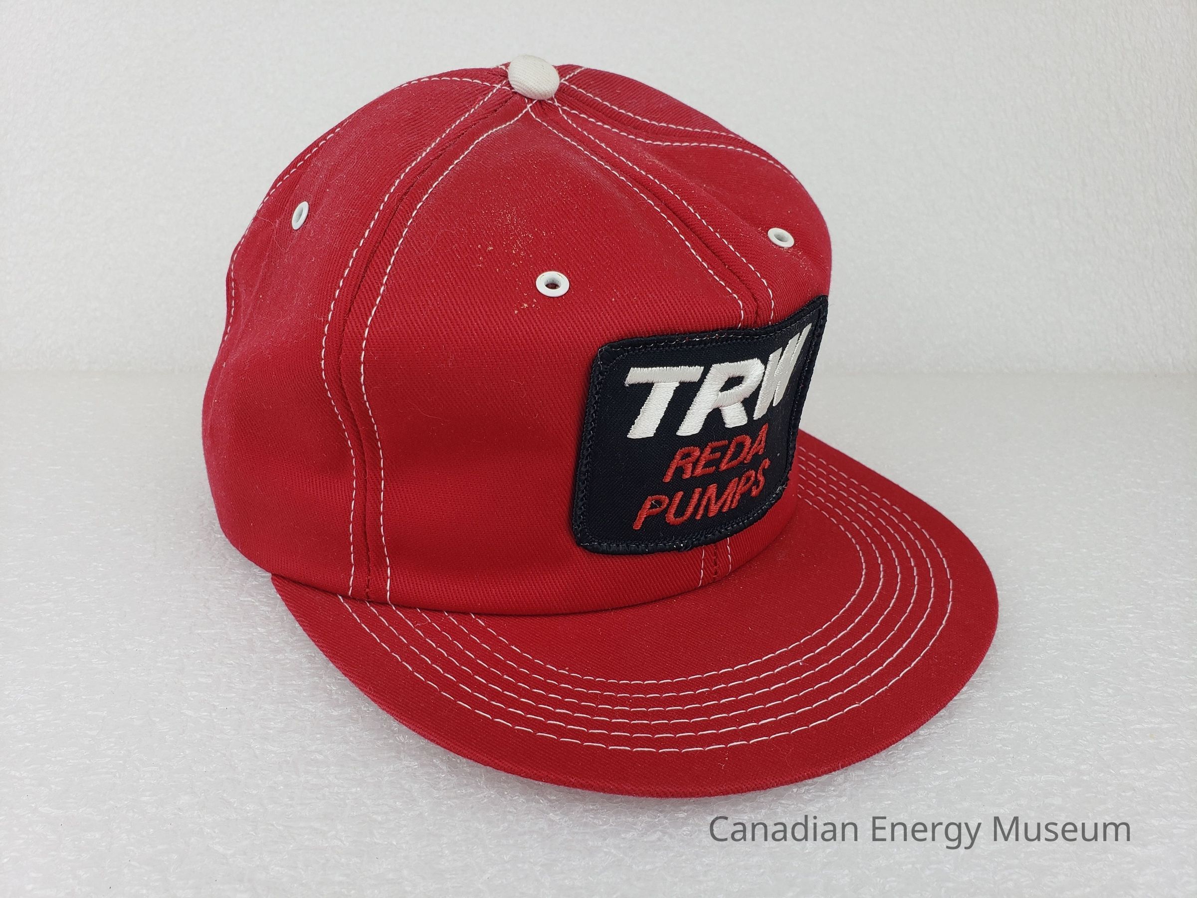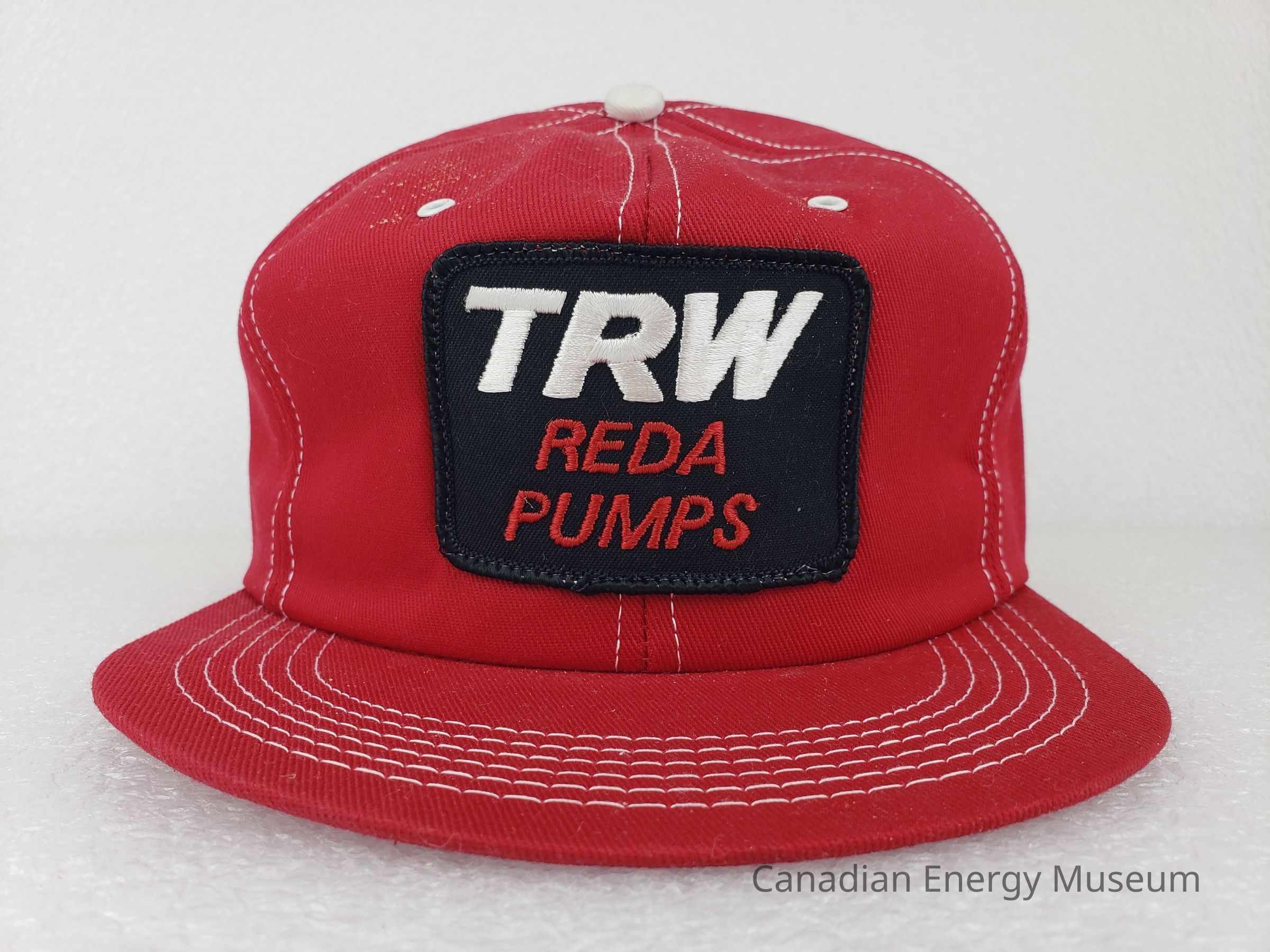 Design: A red padded cap with a rectangular embroidered patch branded for TRW Reda Pumps. The patch design features a black base with black edge embroidery. The patch features large white embroidered text reading, "TRW" with smaller red text underneath reading, "RDA PUMPS".
