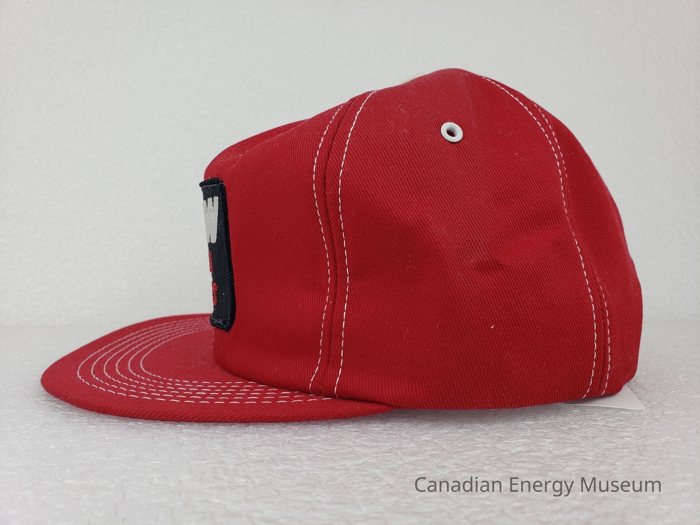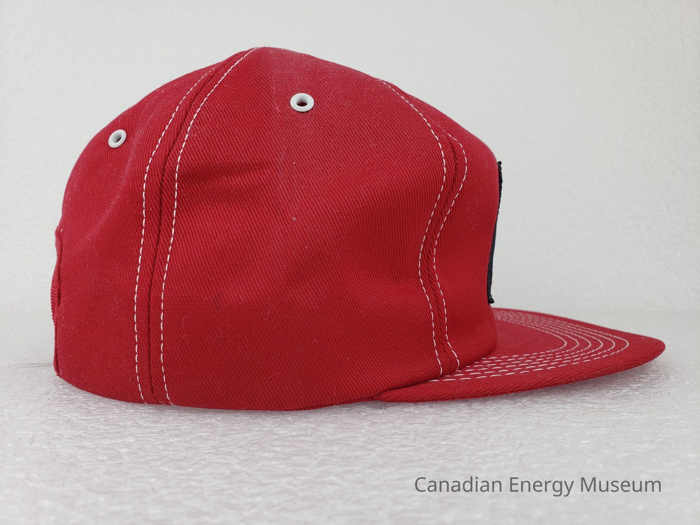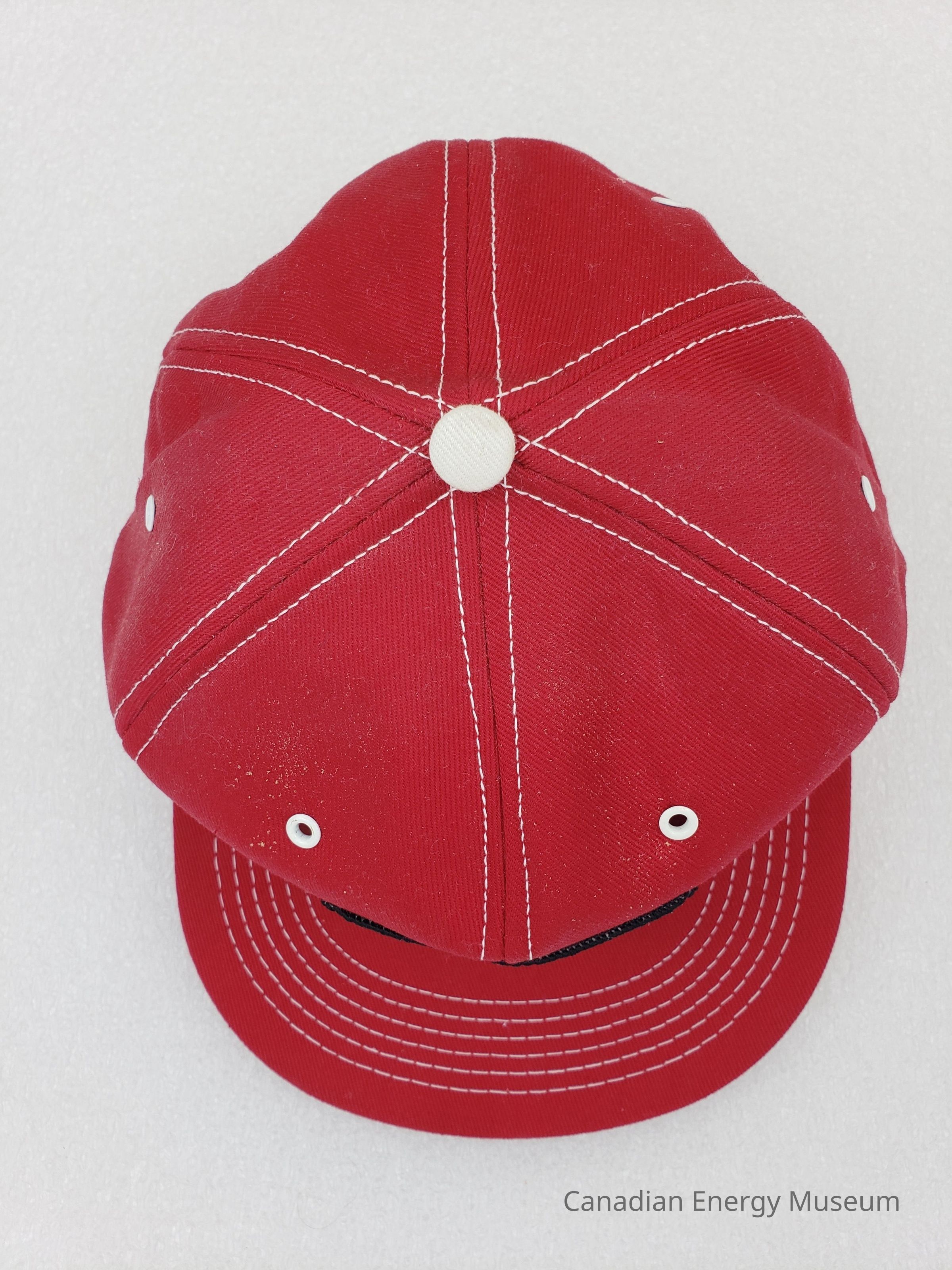 Crown Material: Foam backing with fabric outer, red with white stitching.