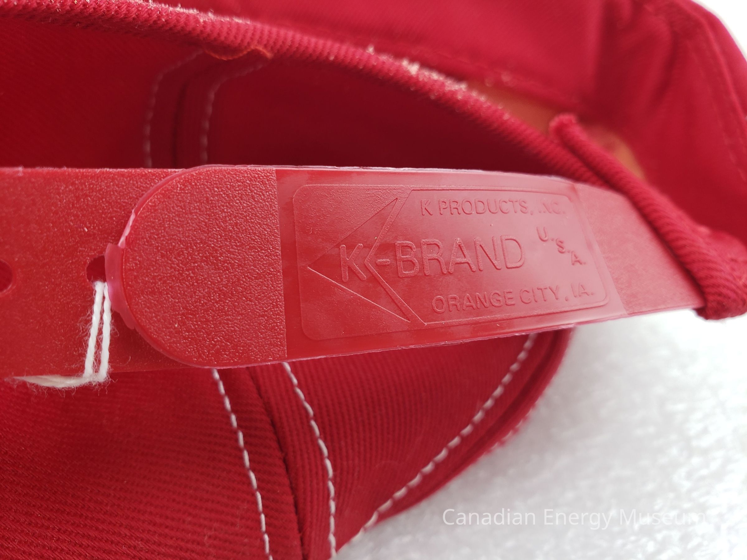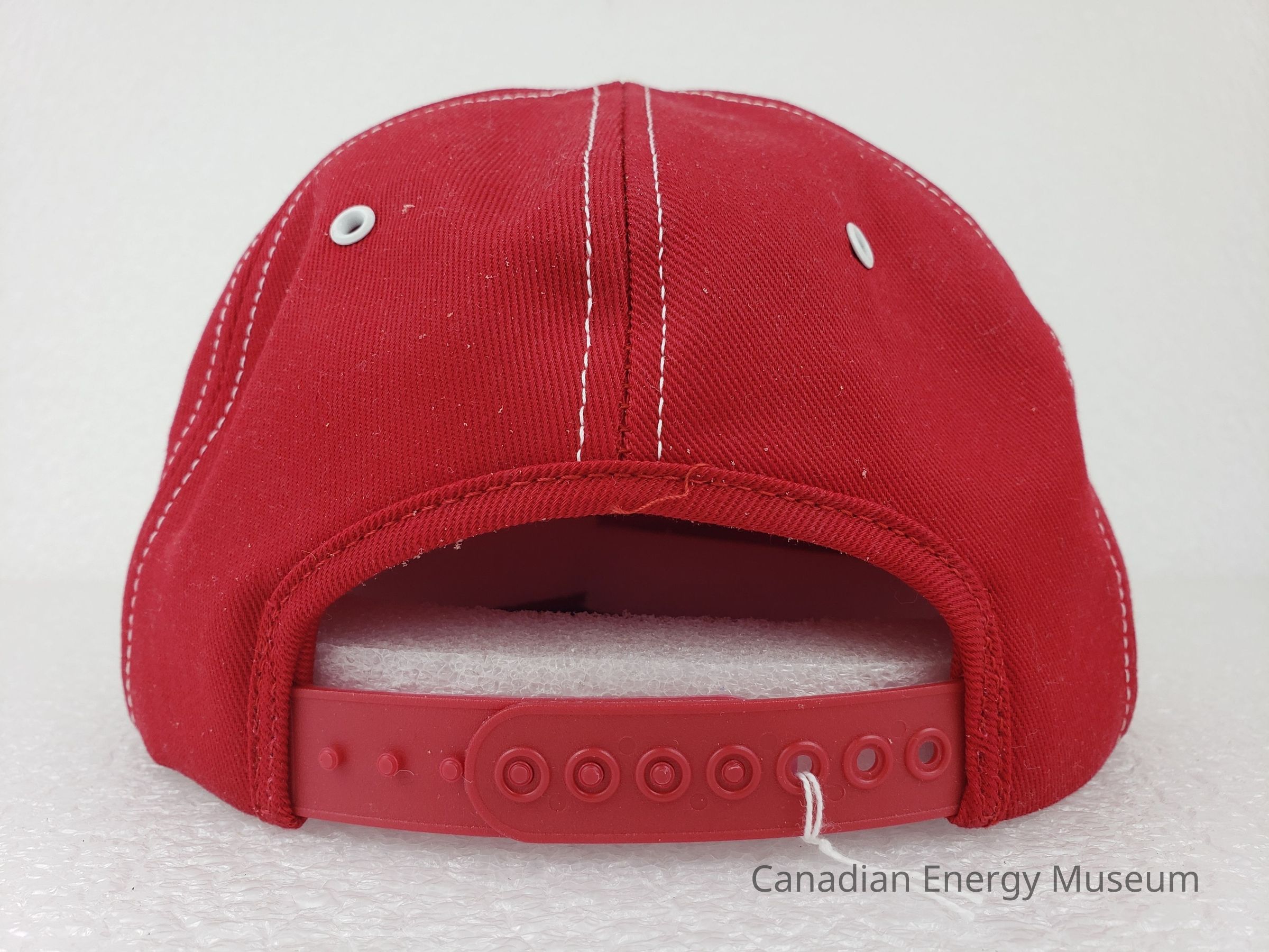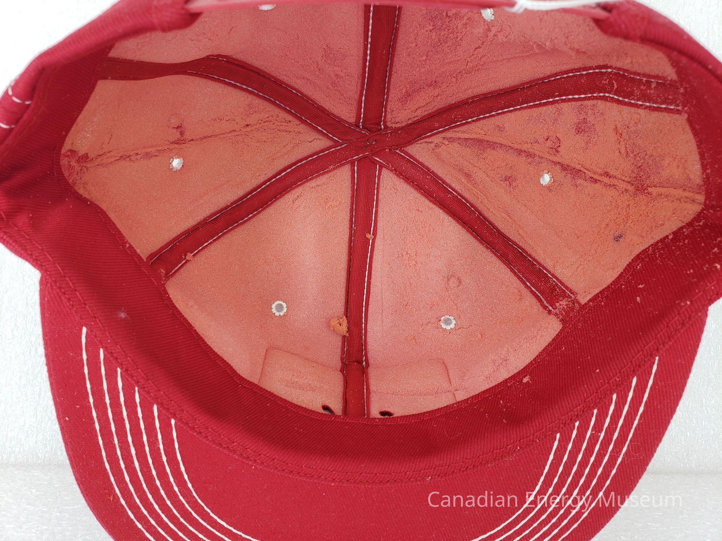 Crown Material: Foam backing with fabric outer, red with white stitching.