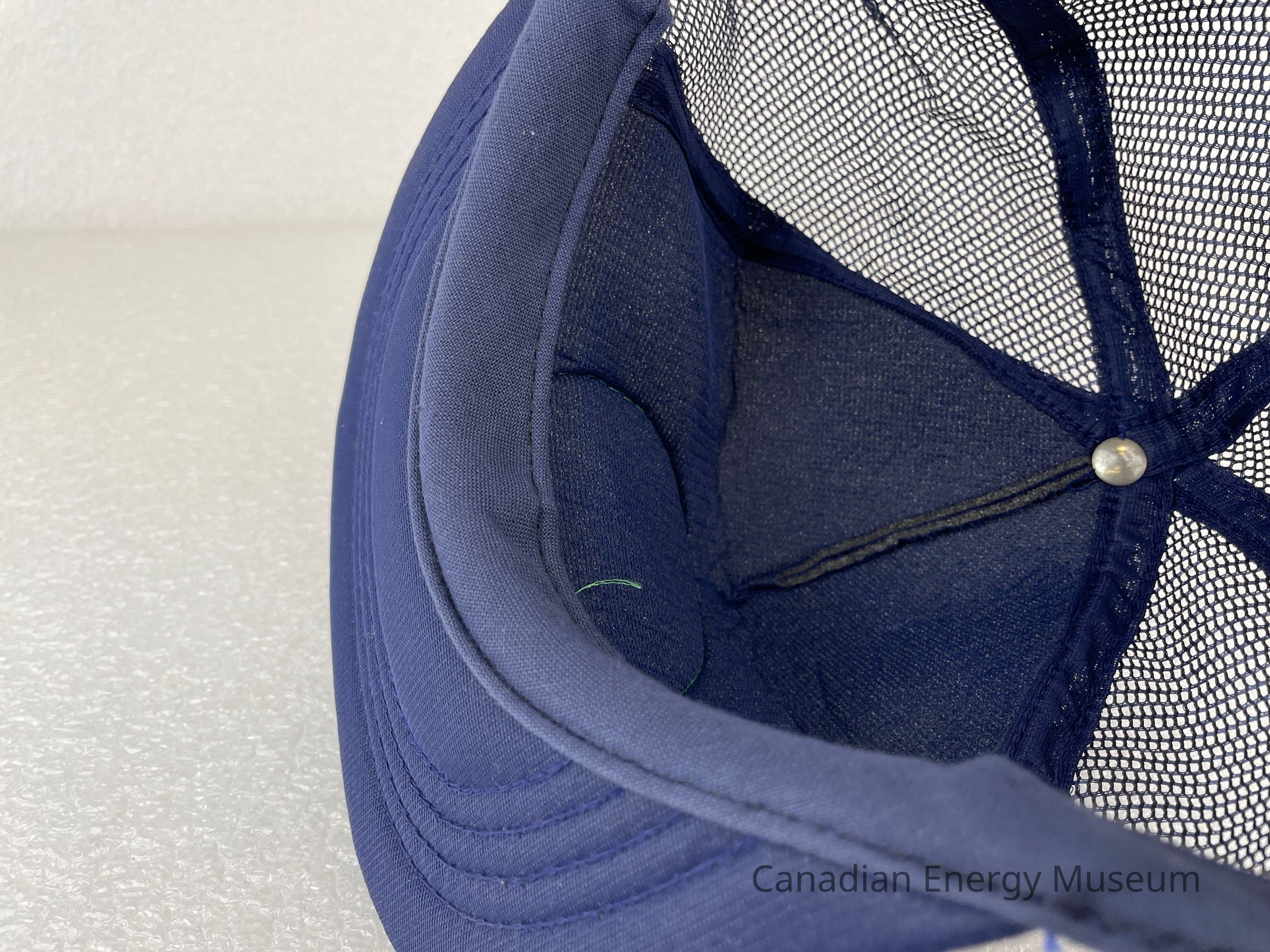 Brim: Fabric-covered, navy with navy stitching.