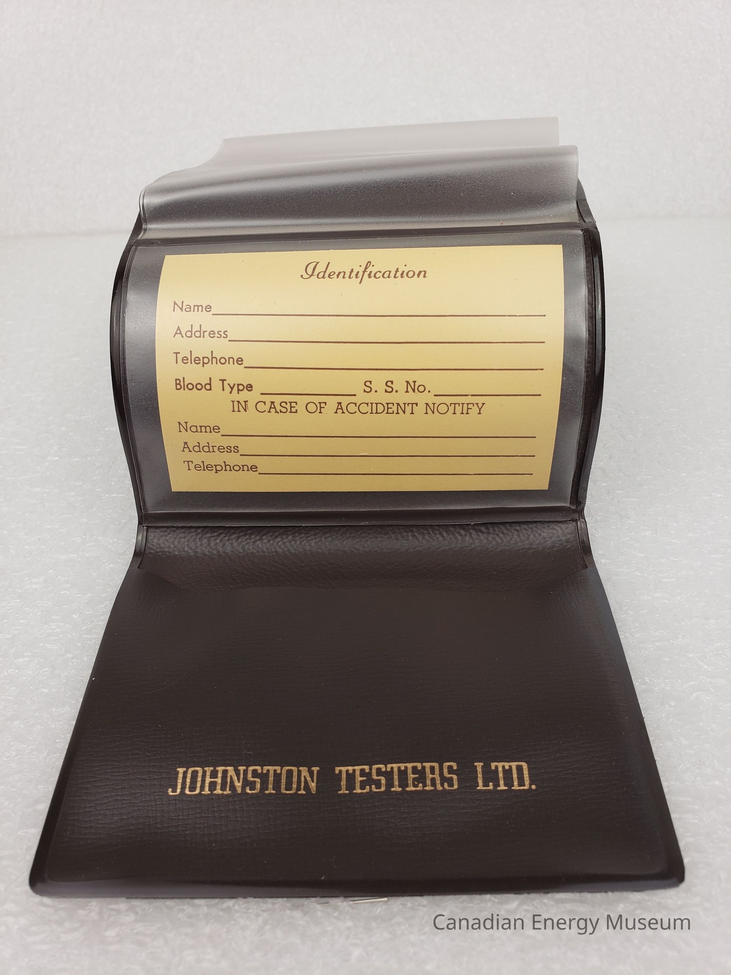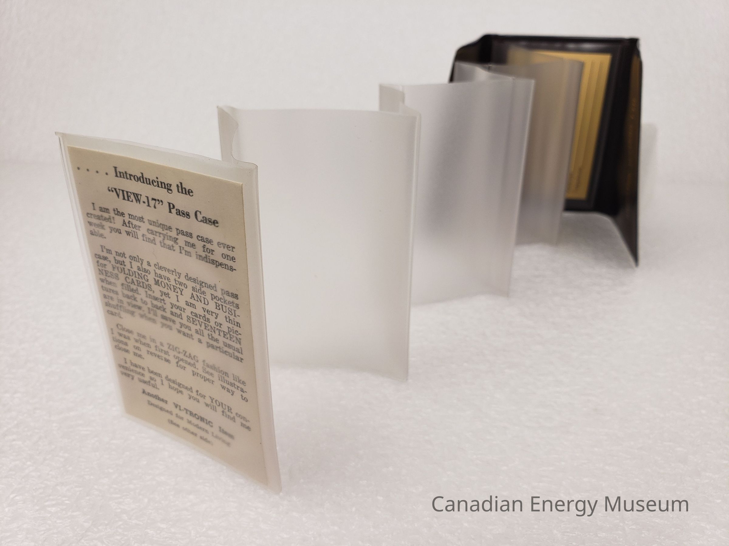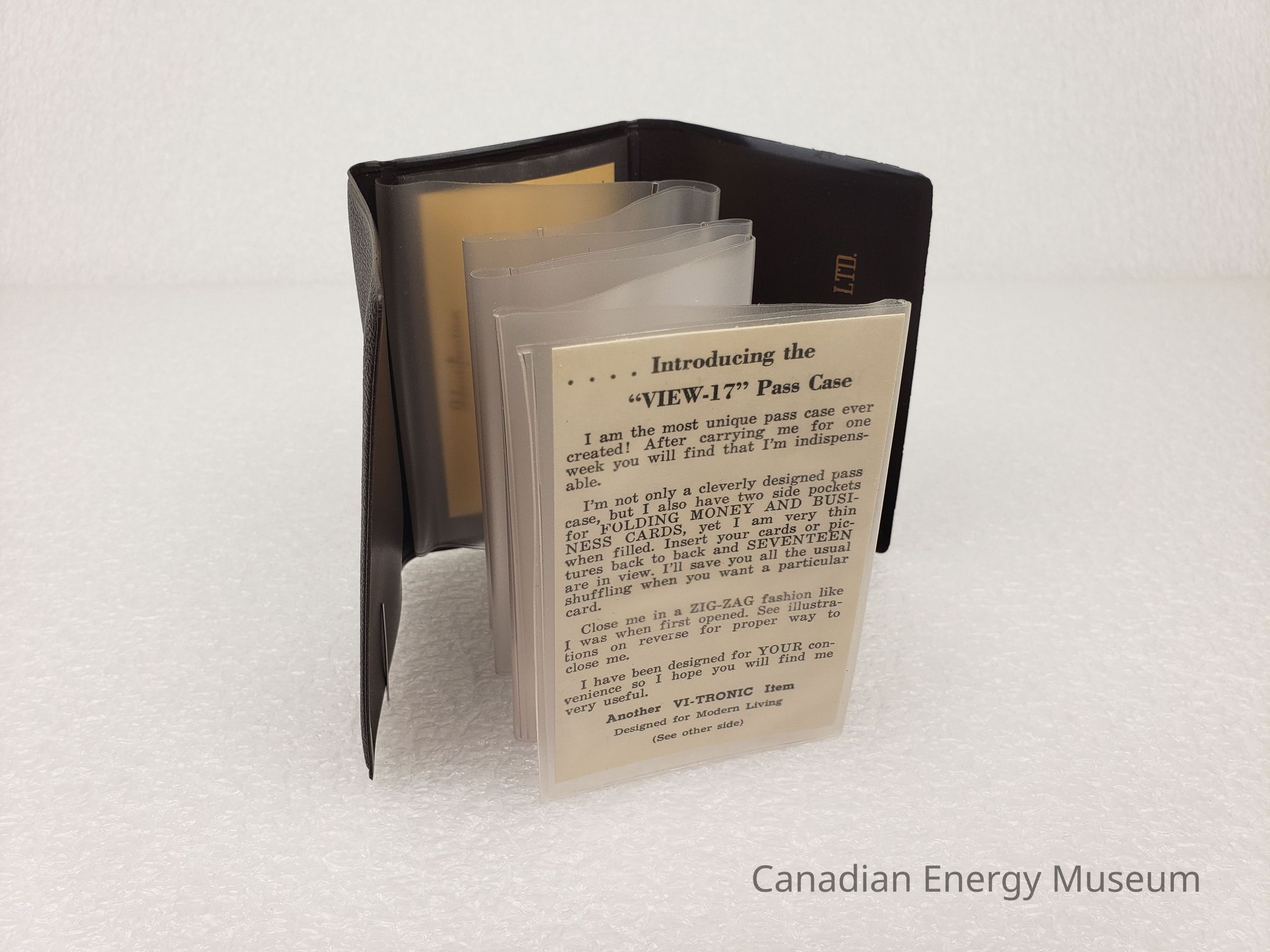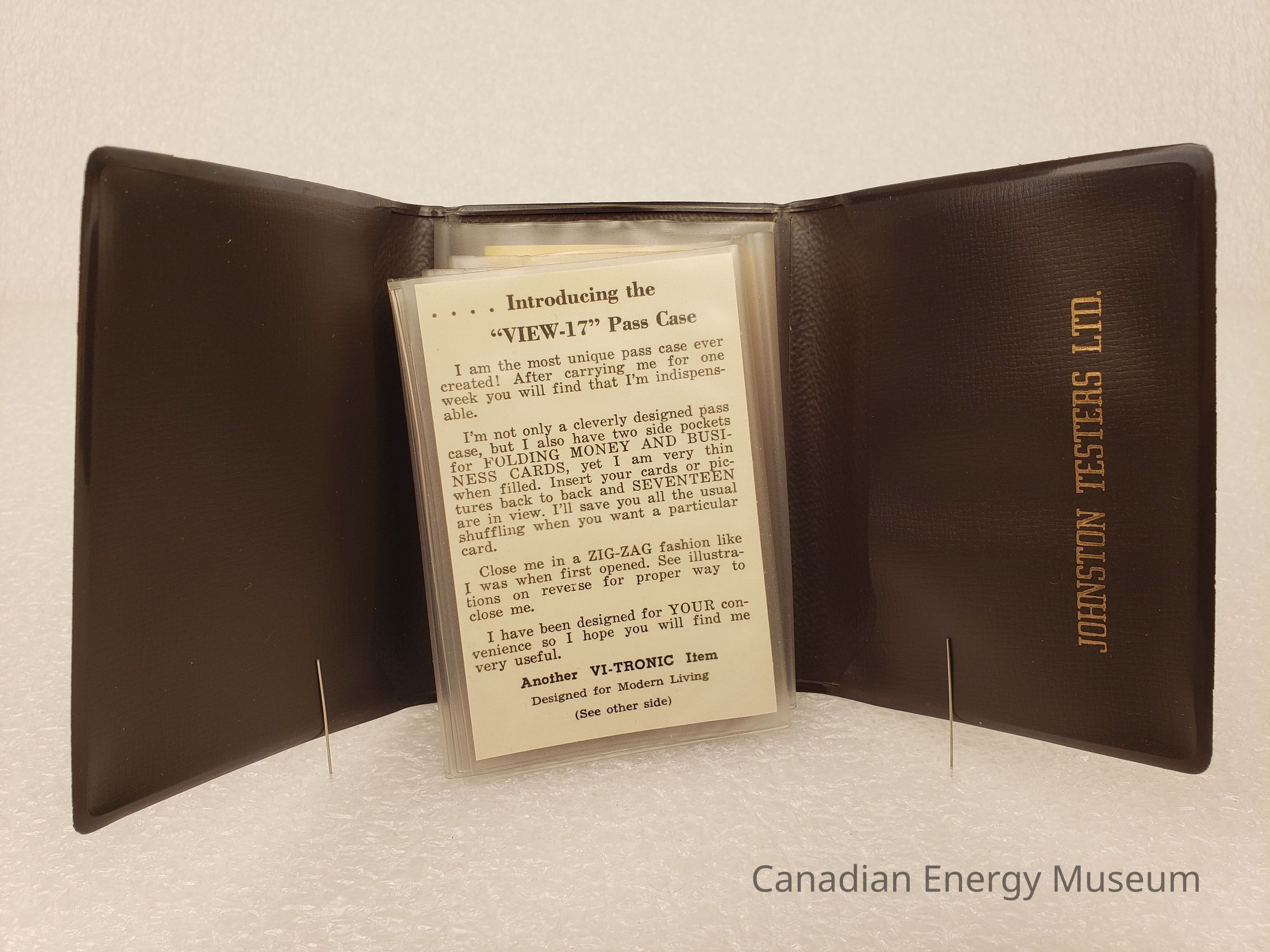 Description: A small, brown plastic card wallet, with nine clear card pockets in a fold-out concertina design. In the top-most pocket is a card with information about the product, called "VIEW-17". Below the folded pockets is yellow-coloured card with space for identification information (unused).To either side of the folded clear pockets are flaps, each with a simple pocket. On the right-flap is printed in gold-foil "JOHNSTON TESTERS LTD.".