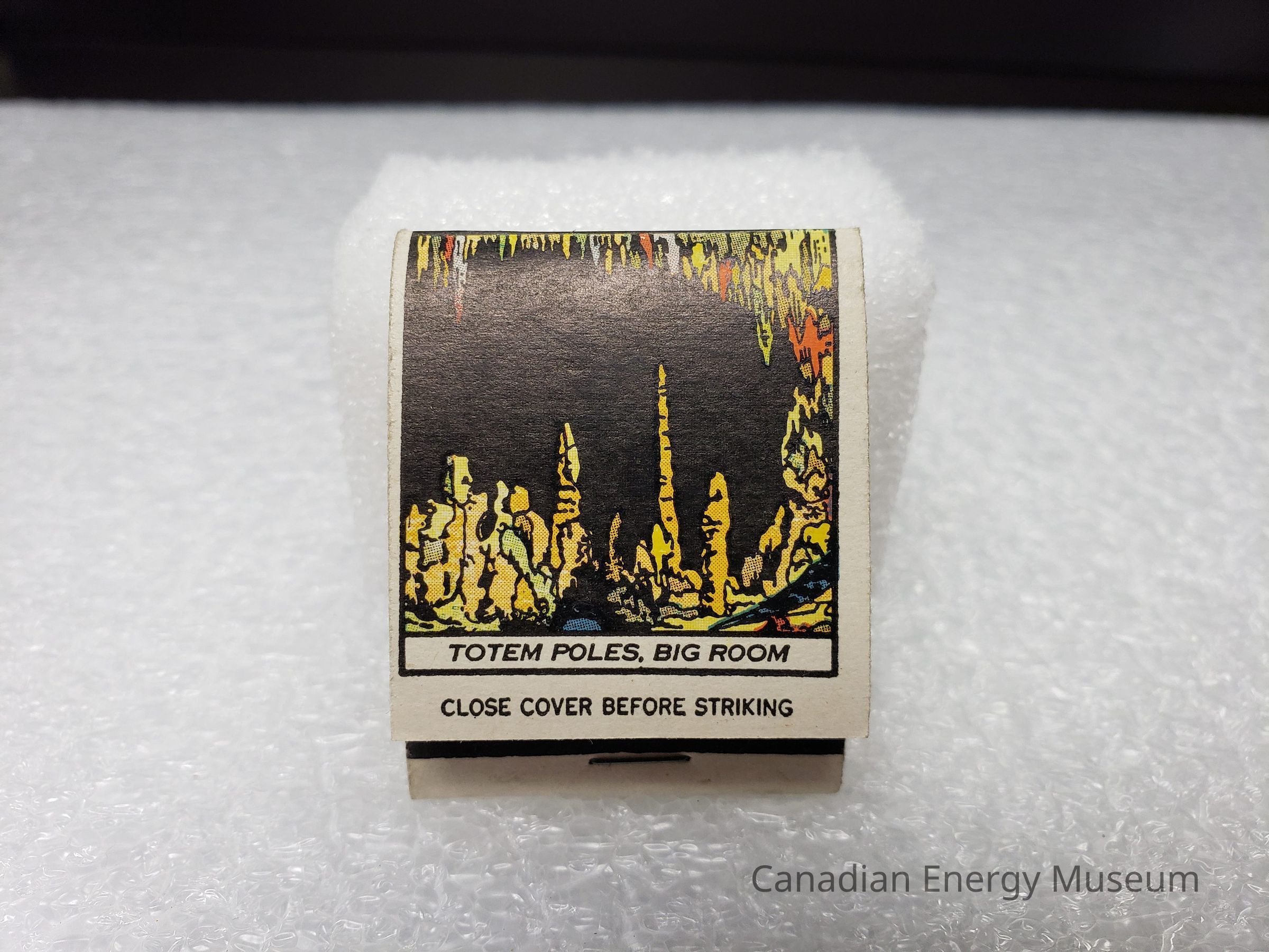 Matchbook from White's City, featuring imagery of the 'Totem Poles' in the Big Room of Carlsbad-Cavern in Carlsbad-Cavern National Park. Contained 20 matches.