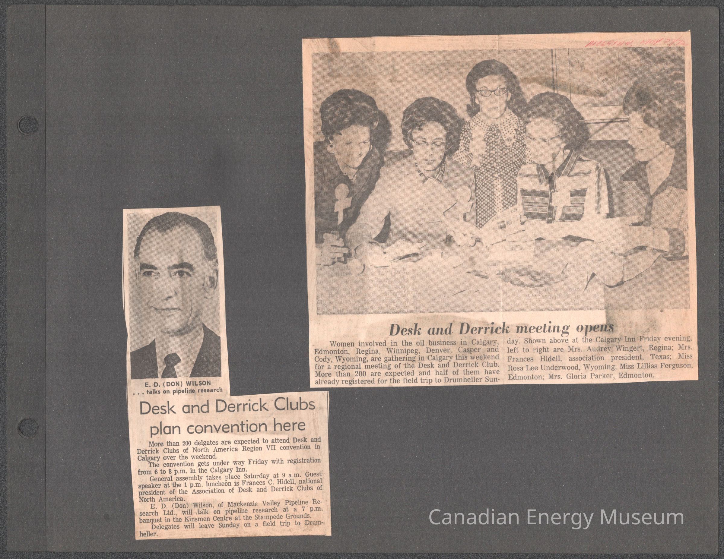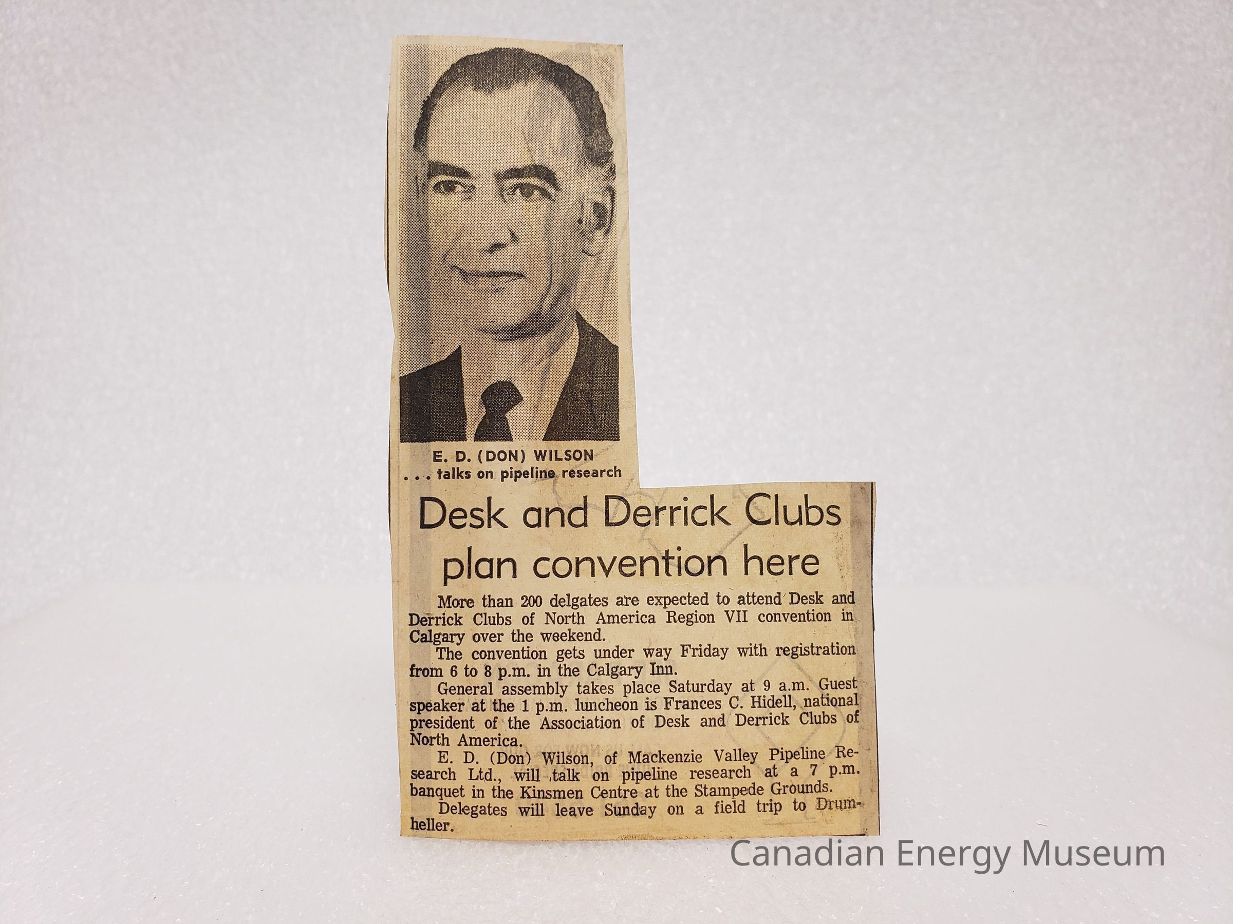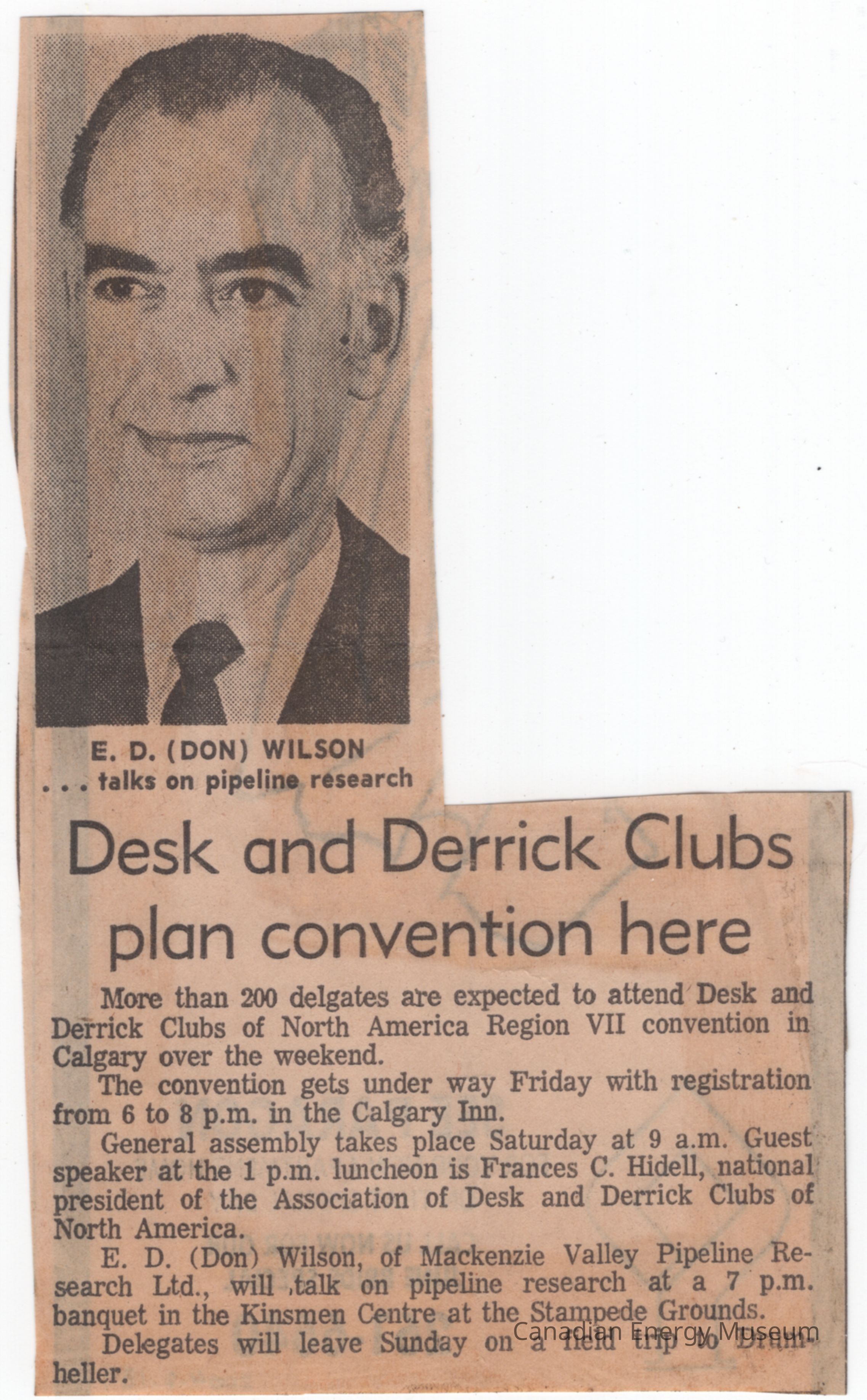 A medium-sized clipping of text and a photograph from The Calgary Herald newspaper, dated to Thursday 25 May 1972, page 64 (information acquired from identical clipping, 2004.2.199). The article is titled "Desk and Derrick Clubs plan convention here". The article text discusses the 200 delegates expected to attend, the venue (Calgary Inn), guest speaker E.D. (Don) Wilson (Mackenzie Valley Pipeline Research Ltd.), and the planned field trip to Drumheller. Above the article text is a headshots: E.D. (Don) Wilson.