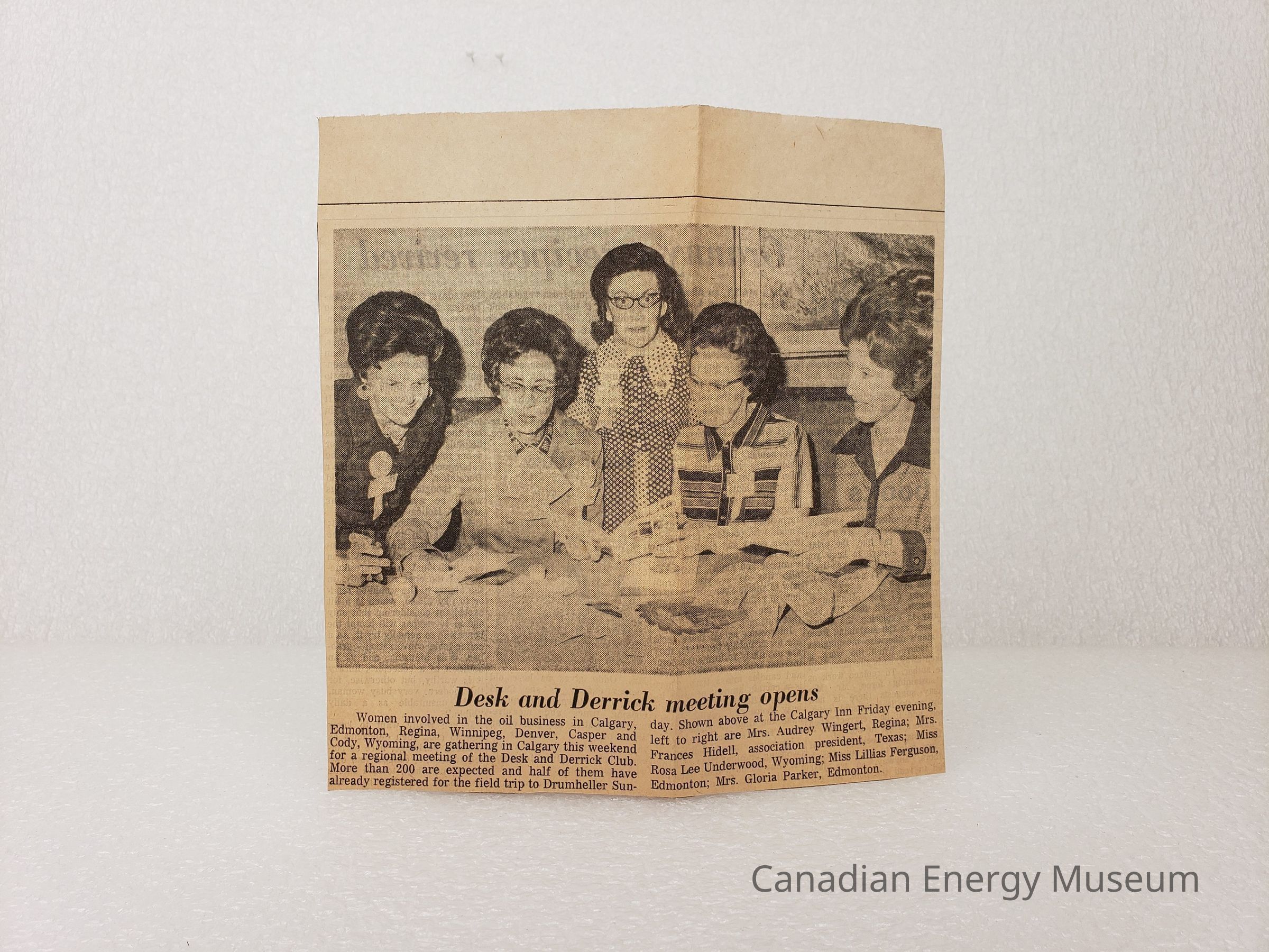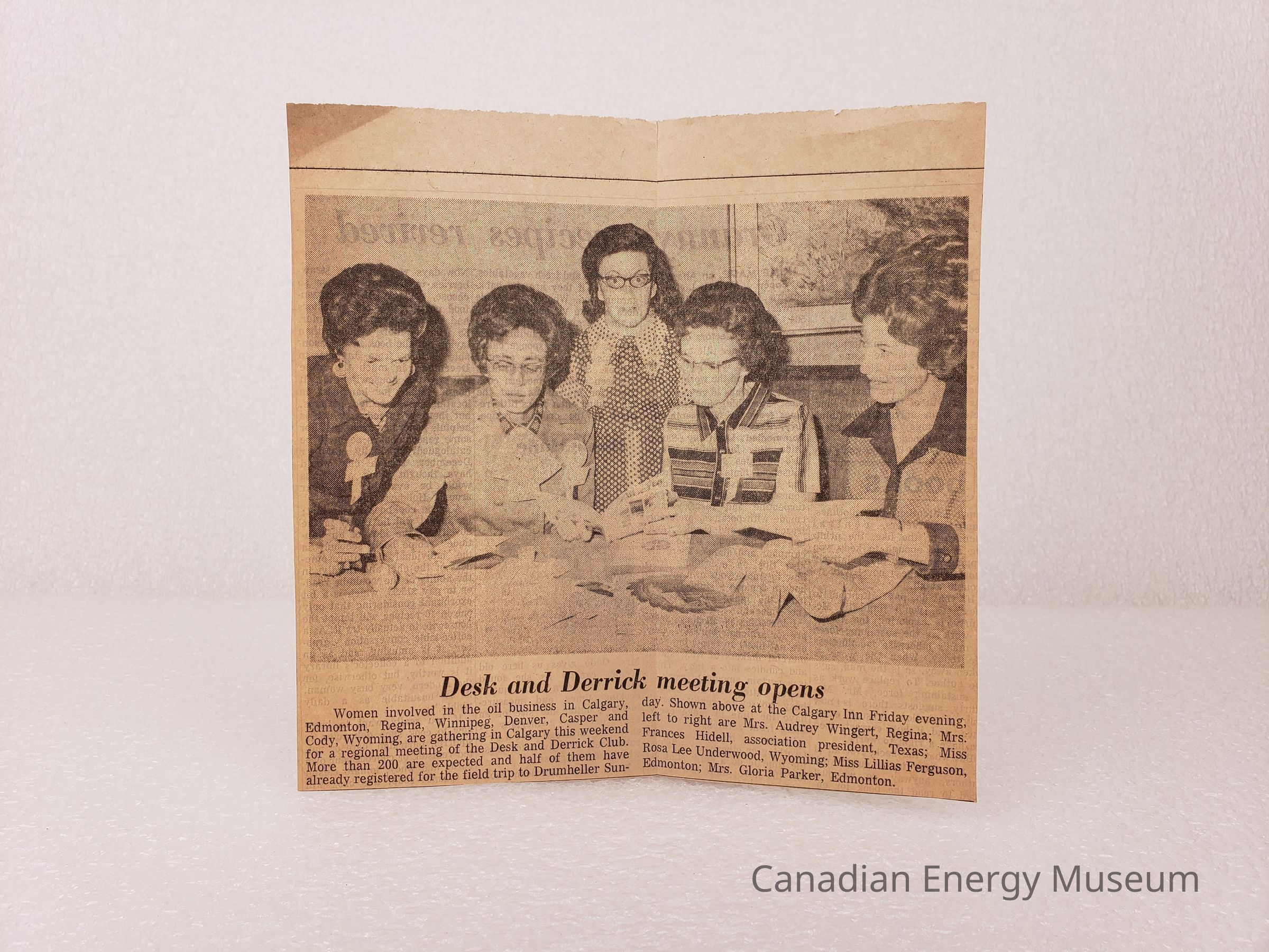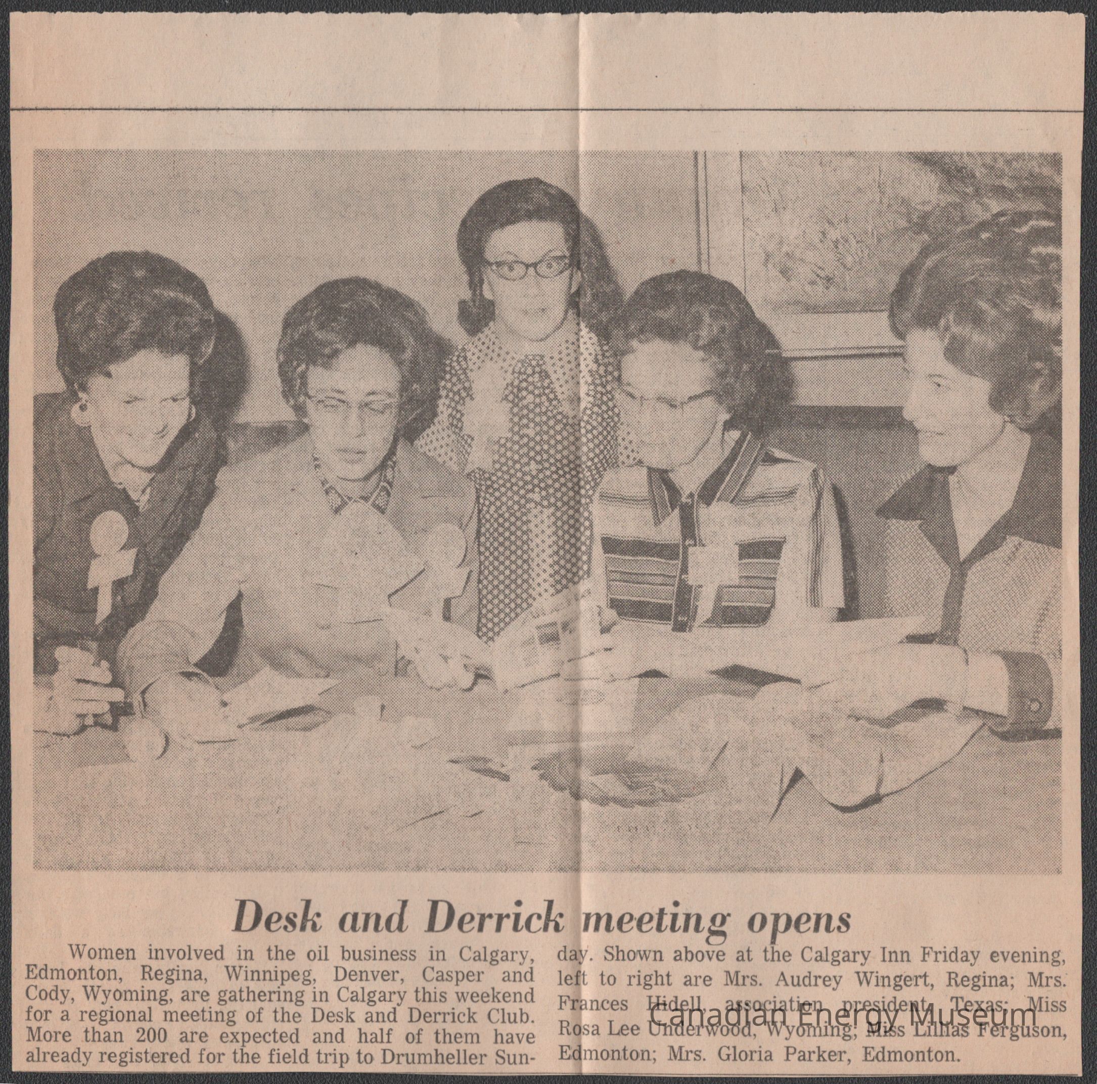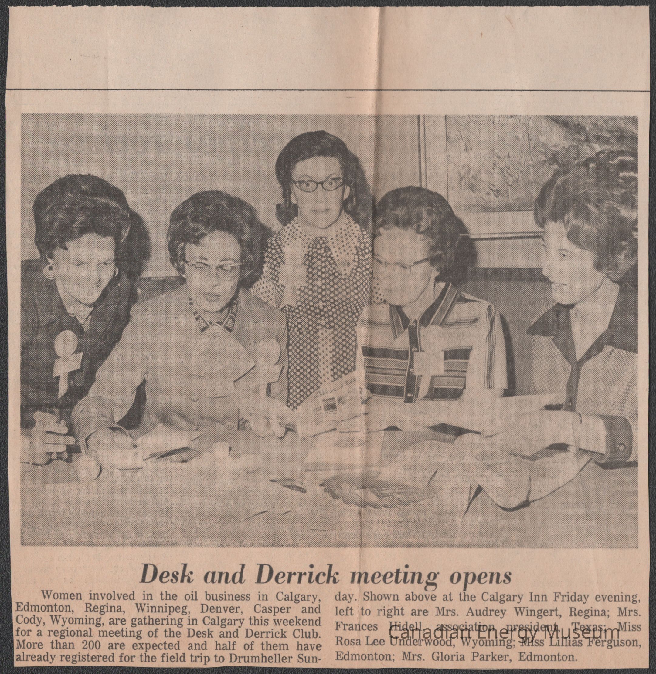 A set of two identical medium-sized clipping of a photograph and text, from The Albertan, dates to Saturday 27 May 1972, page 5. The Image is of five women looking at paper and documents at a table, with a short article below the image, titled "Desk and Derrick meeting opens". The text discusses the 1972 Region VII annual meeting of the Desk and Derrick Club. Text identifies the women in the image as Aubrey Wingert (Regina), Frances Hidell (Association President, Texas), Rosa Lee Underwood (Wyoming), Lillian Ferguson (Edmonton), and Gloria Parker (Edmonton). Image was taken Friday 26 May 1972, at the Calgary Inn).