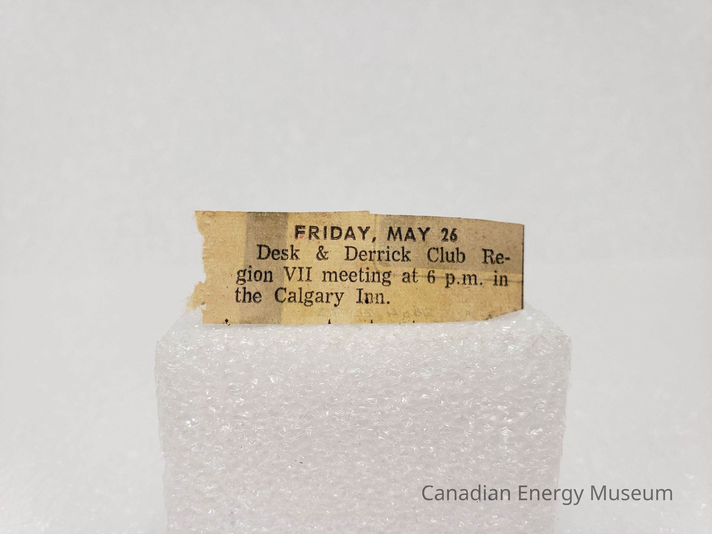 A small clipping of text from (assumedly) the Friday 26 May 1972 issue of The Calgary Herald. The text reads "Friday, May 26; Desk & Derrick Club Region VII meeting at 6 p.m. in the Calgary Inn."