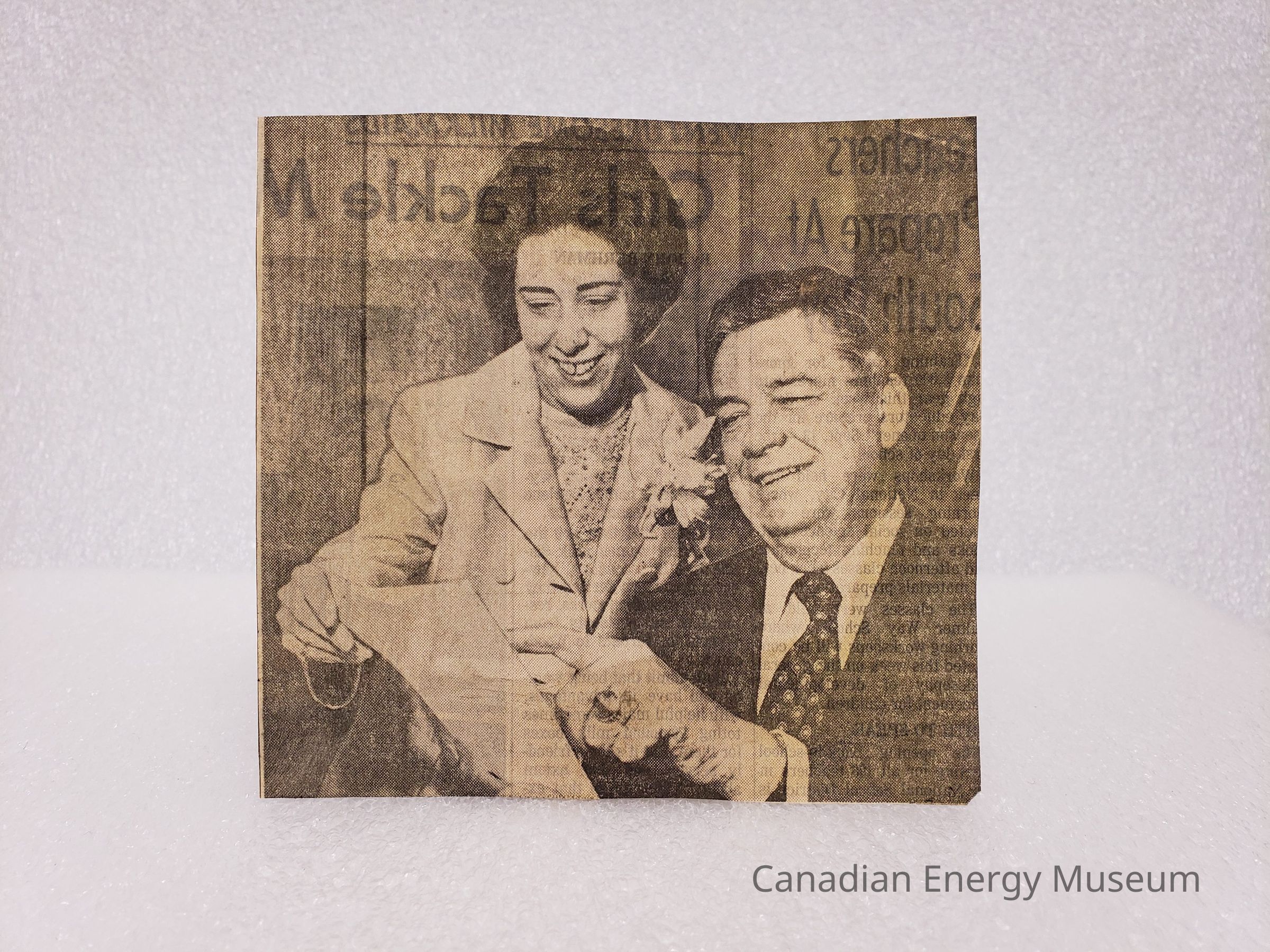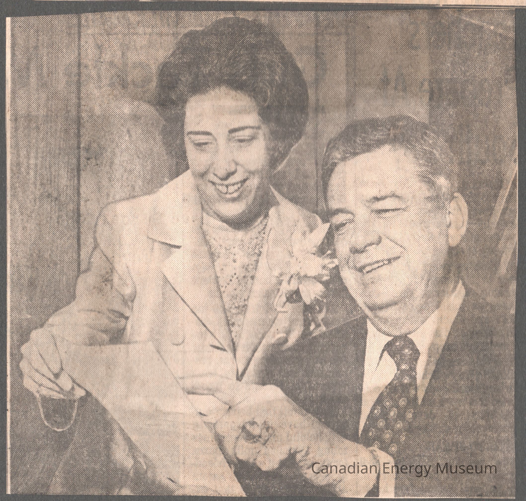 A clipping from the San Diego Union, dated to Sunday Morning, 29 August 1971. The clipping is of the photograph (a lady and a man pointing to a sheet of paper) that accompanies the article "Petroleum Leader Backs Nixon's Economic Policy". This item is paired with a title strip and two text clippings from this issue of the newspaper (2004.2.112, 114-115).
