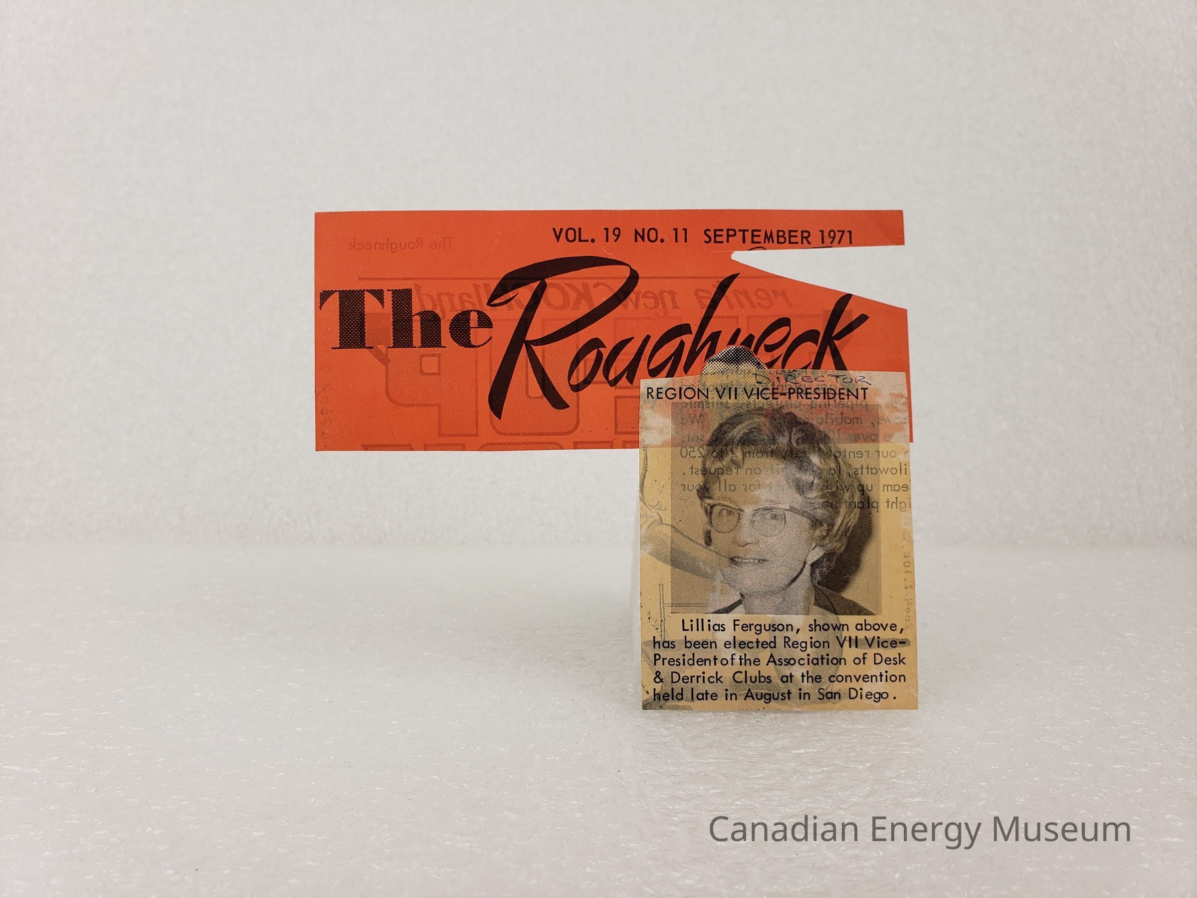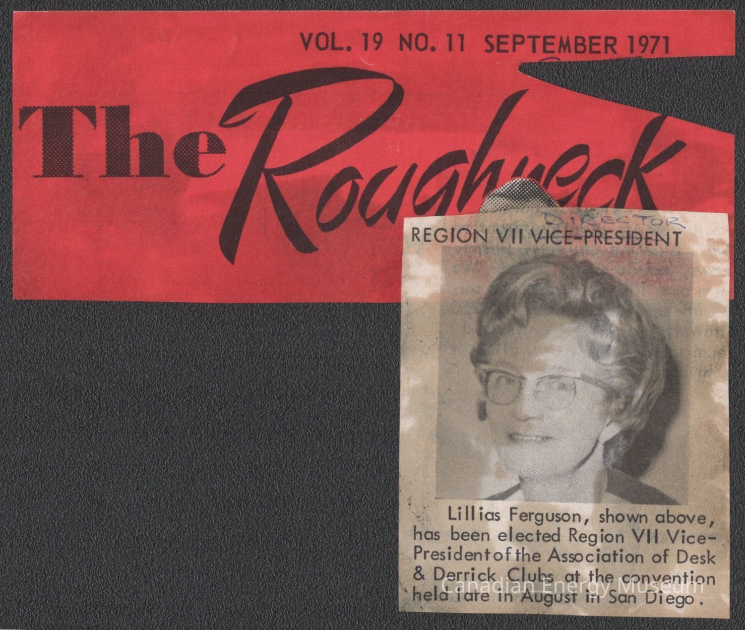 A small-sized clipping of a photograph of Lillias Ferguson (ADDC Region VII Vice President), from The Roughneck periodical, Vol.19 No.11, September 1971; with accompanying text and the red Roughneck periodical banner. The clipping is comprised of two clippings adheres together: one the image with text, and the other the periodical's title banner.