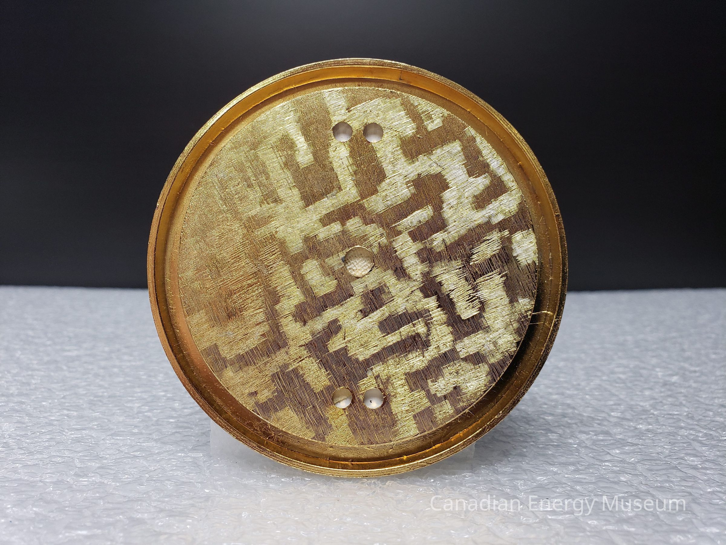 The metal edge is lightly scratched and dented in places, notably: a horizontal scratch through the radial lines at the right-of-middle at the bottom; a vertical scratch through the radial lines in the middle-right; and a dent just right-of-centre at the top.Created By