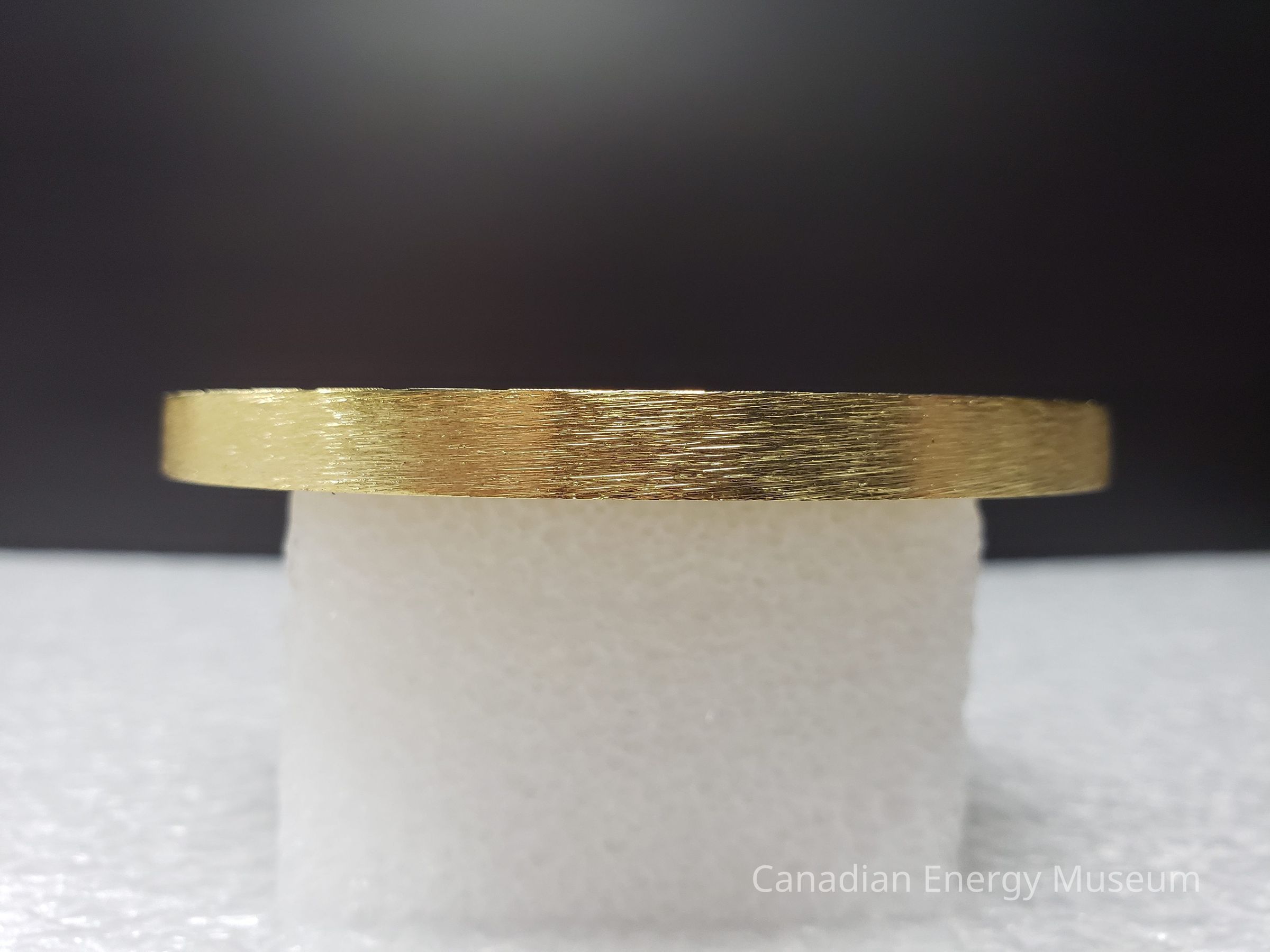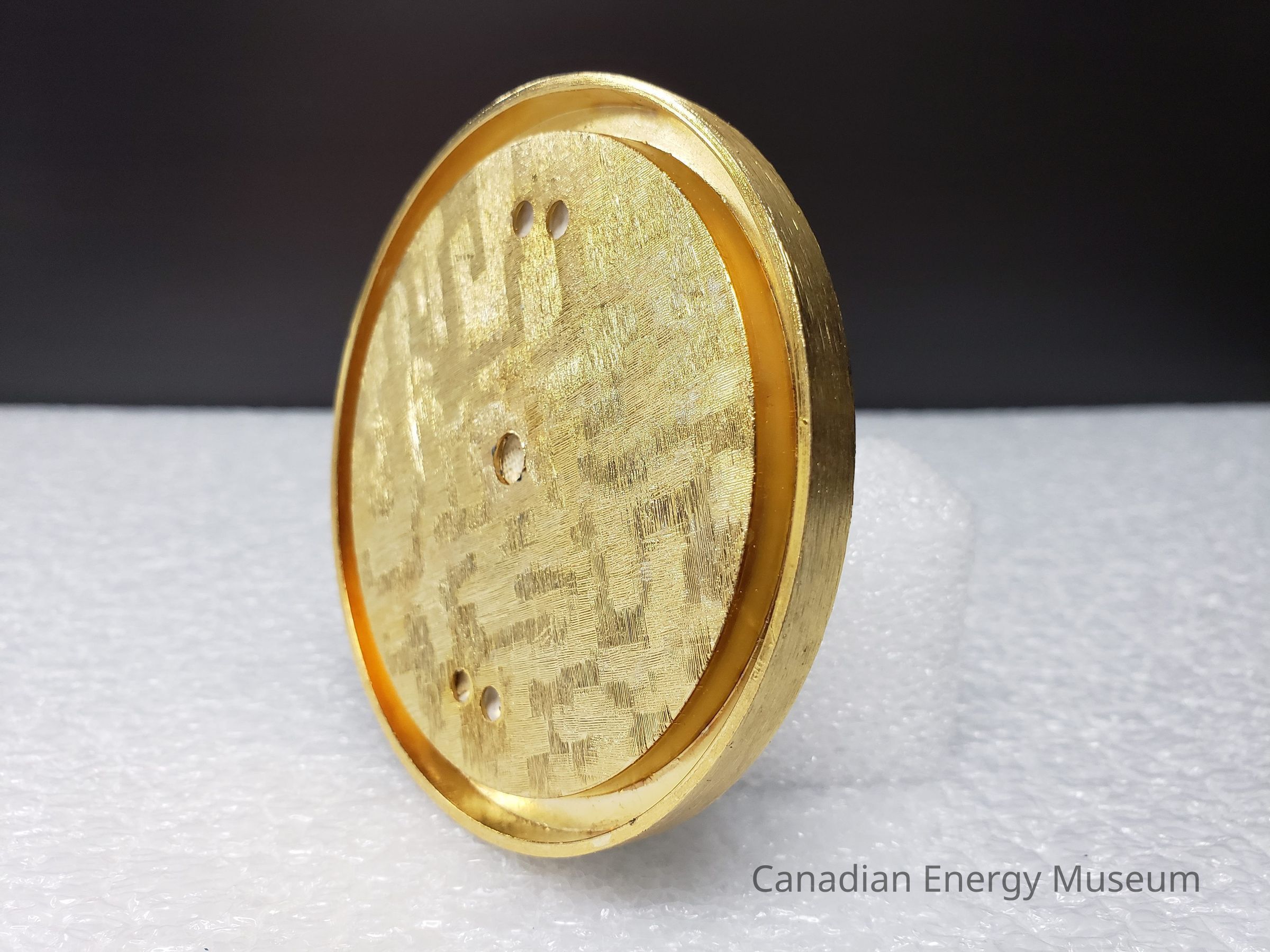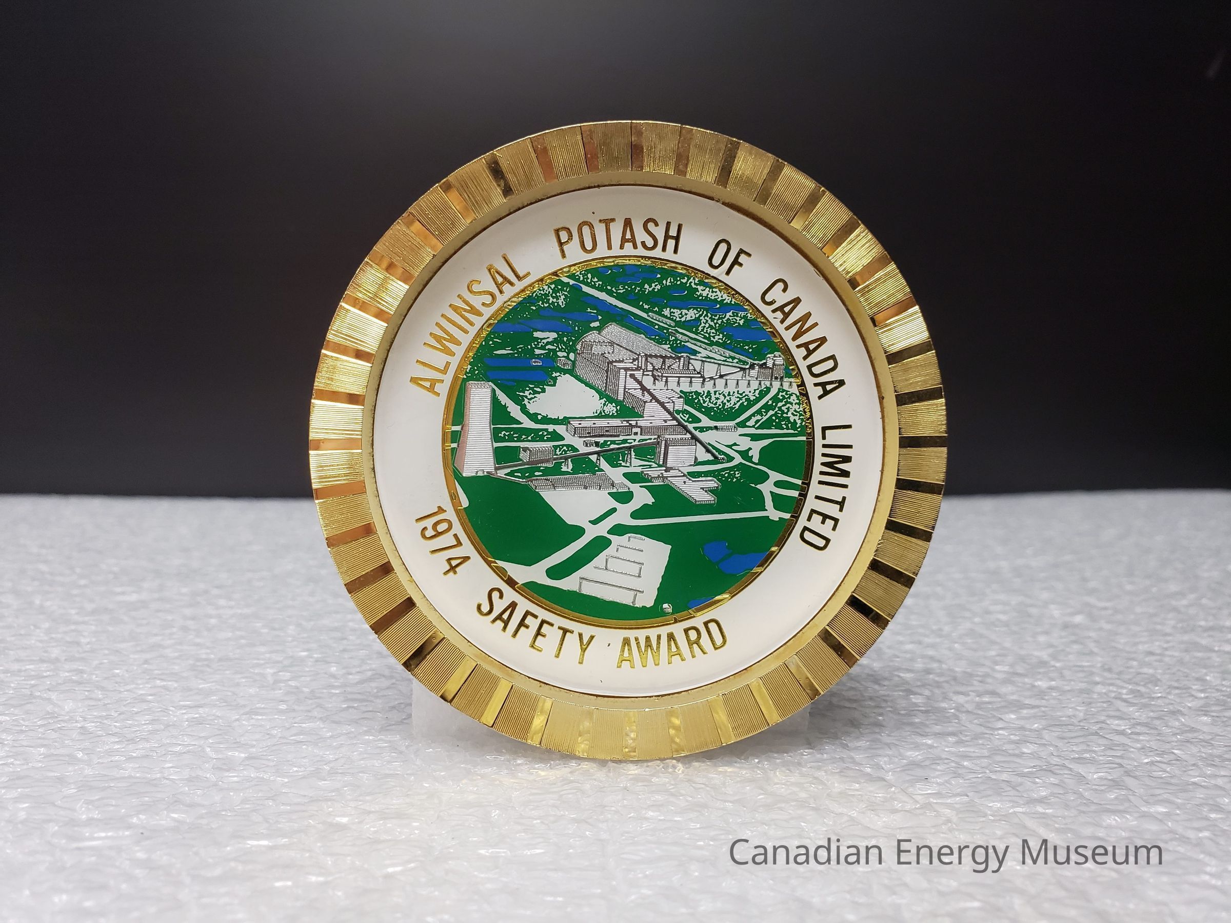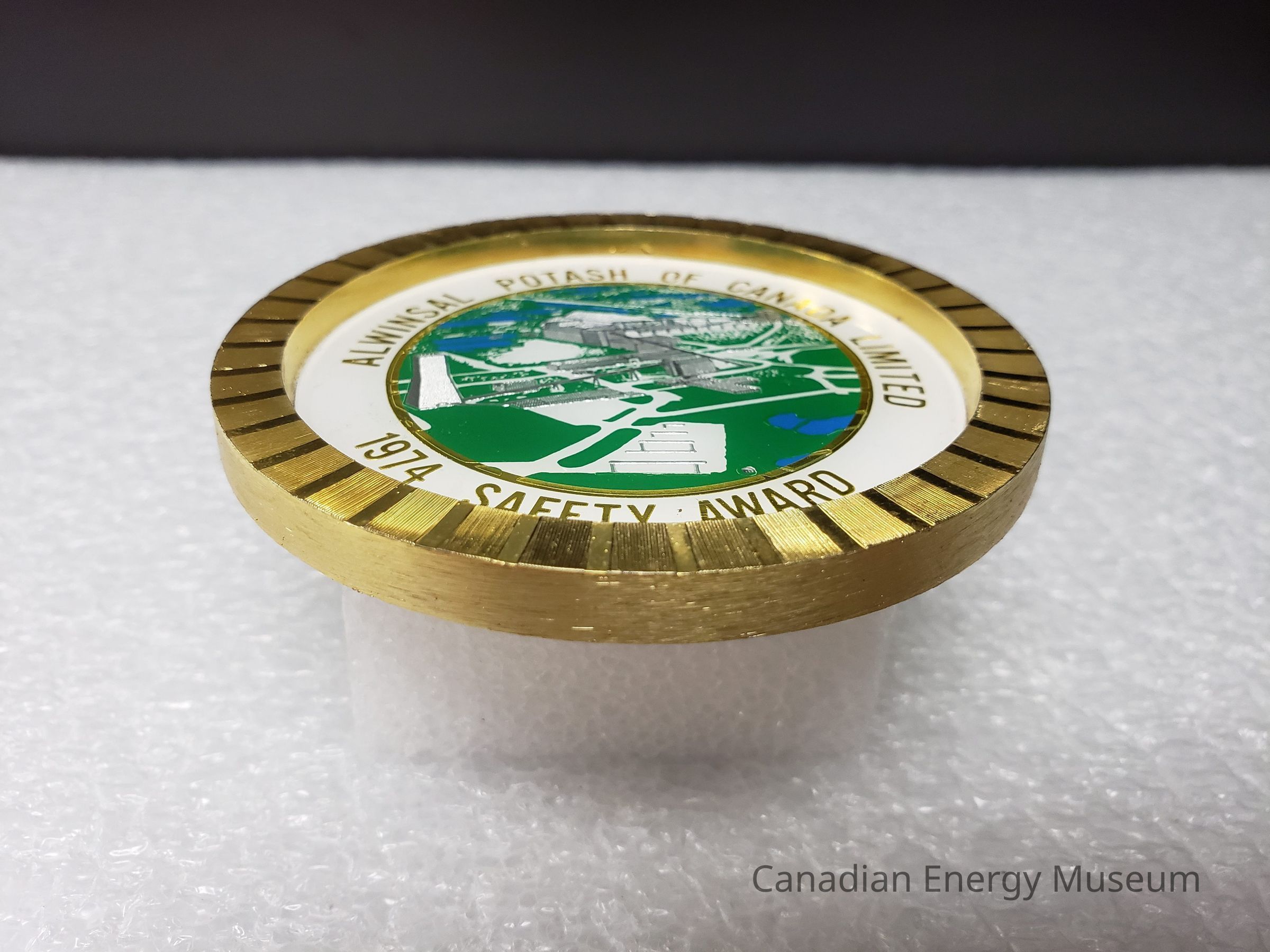 Features: A round, gold-coloured coaster, with raised edges (7mm wide, and 5mm high), and a sunken interio space wirh a clear plastic disc over the printed design. The top of the raised edge has a repeating patters on tight, fine radial lines, and 1.5mm gaps in lines. Beneath the clear plastic disc is a white base, with the following elements: A 1mm ring of gold foil (19mm in from the metal edge, leaving a white gap); gold foil text "ALWINSAL POTASH OF CANADA LIMITED" following the curve of the gold ring at the top; gold foil text "1974 SAFETY AWARD" following the curve of the gold ring at the bottom; inside the ring is an aerial view of the Alwinsal Potash of Canaada Ltd. facility, coloured in green, blue, and the facility itself in silver foil.
