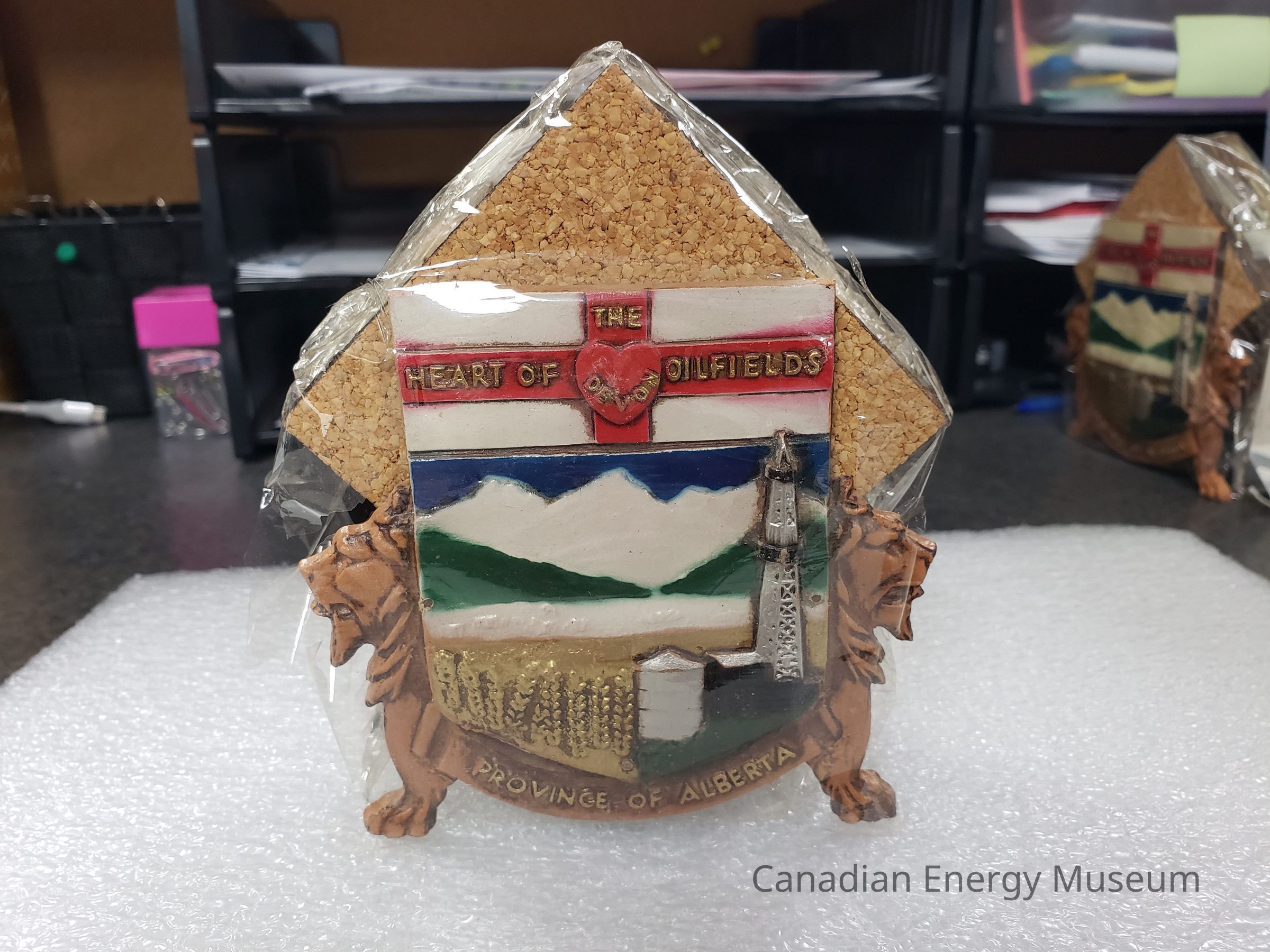 A set of 9 cork coasters displayed inside a carved wooden stand. Stand has the text "THE HEART OF DEVON OILFIELDS", imagery of mountains, grain fields, and a derrick painted in white, red, blue, green,gold, silver, and black. Imagery of lions to either side acting as the feet.Collection