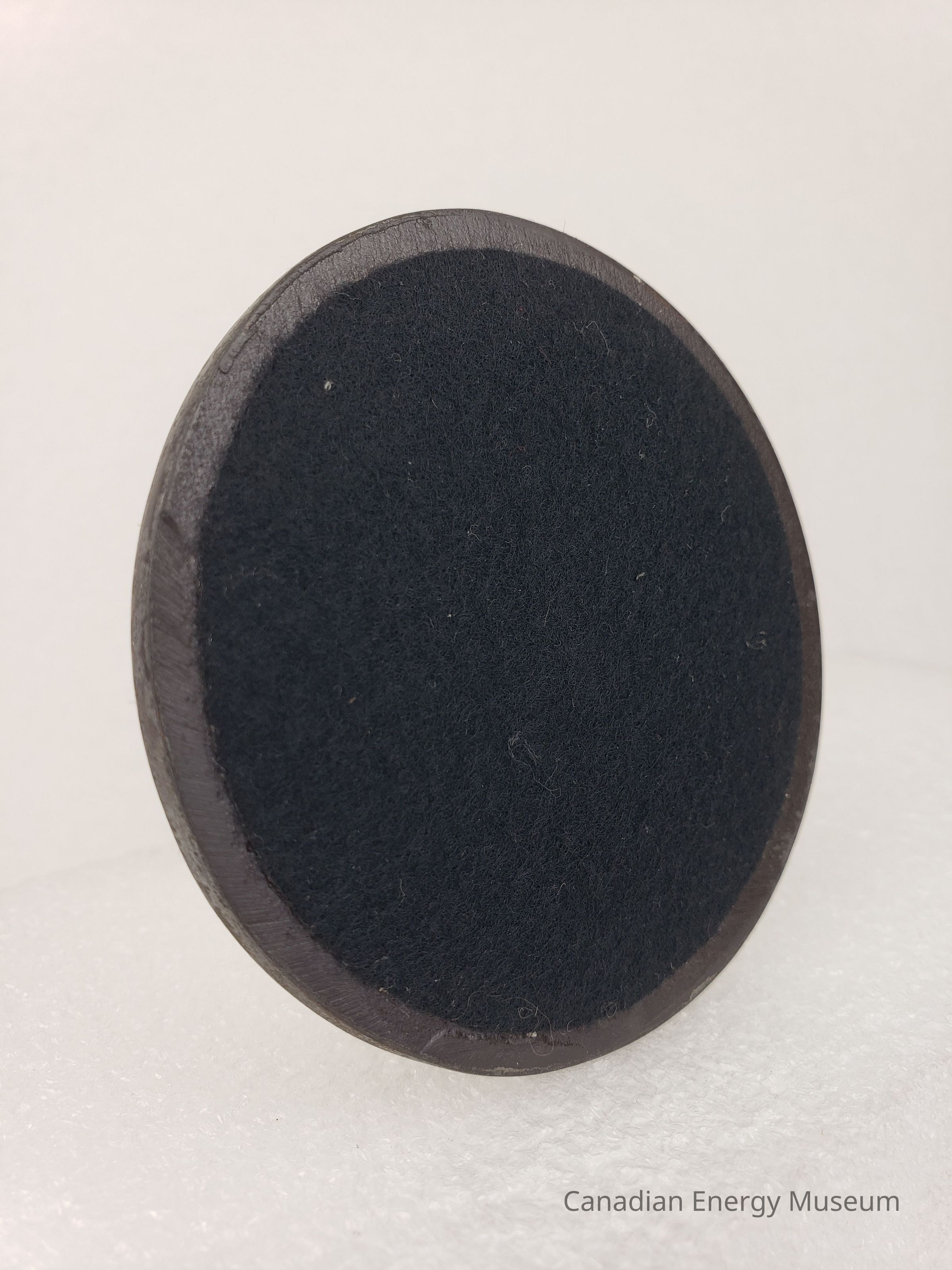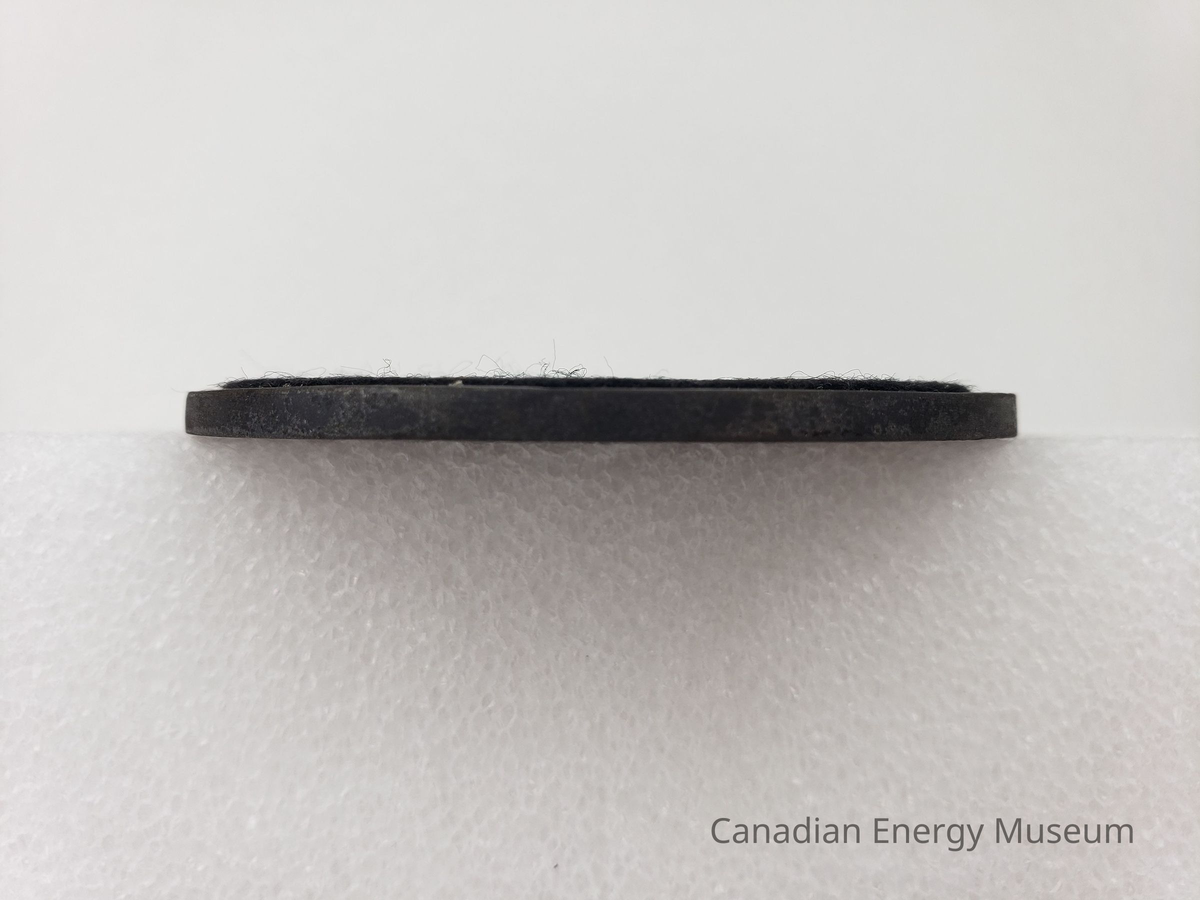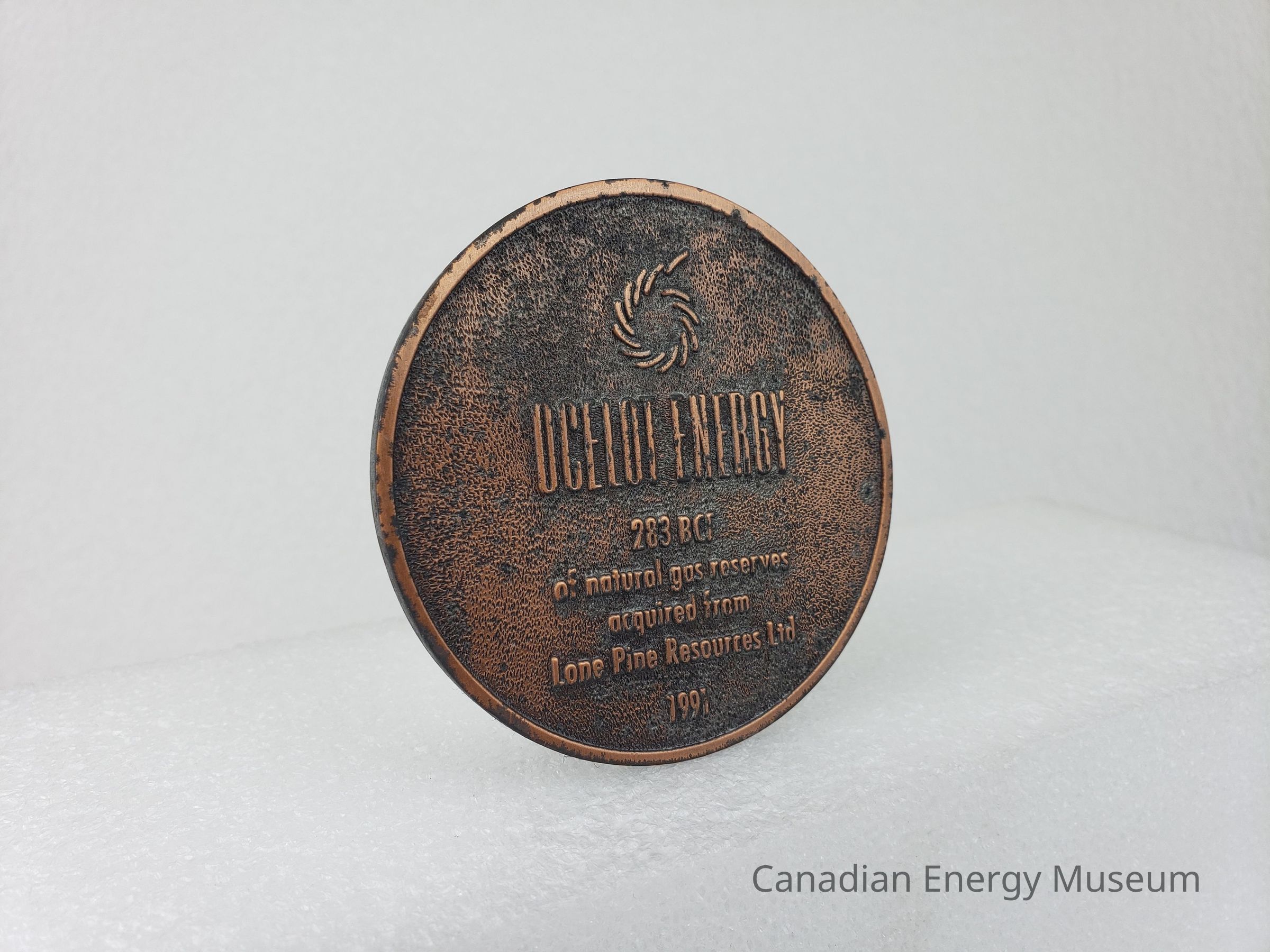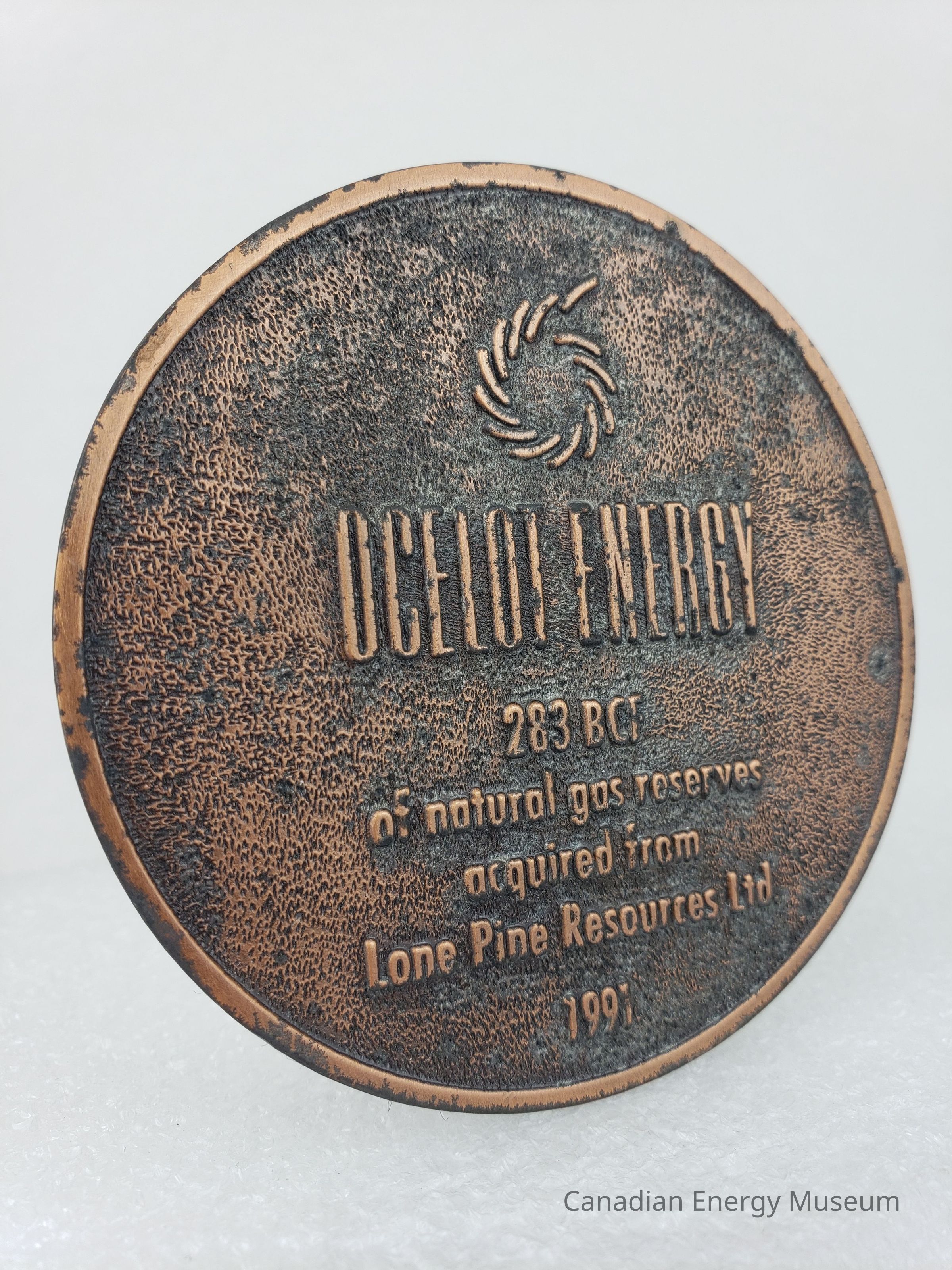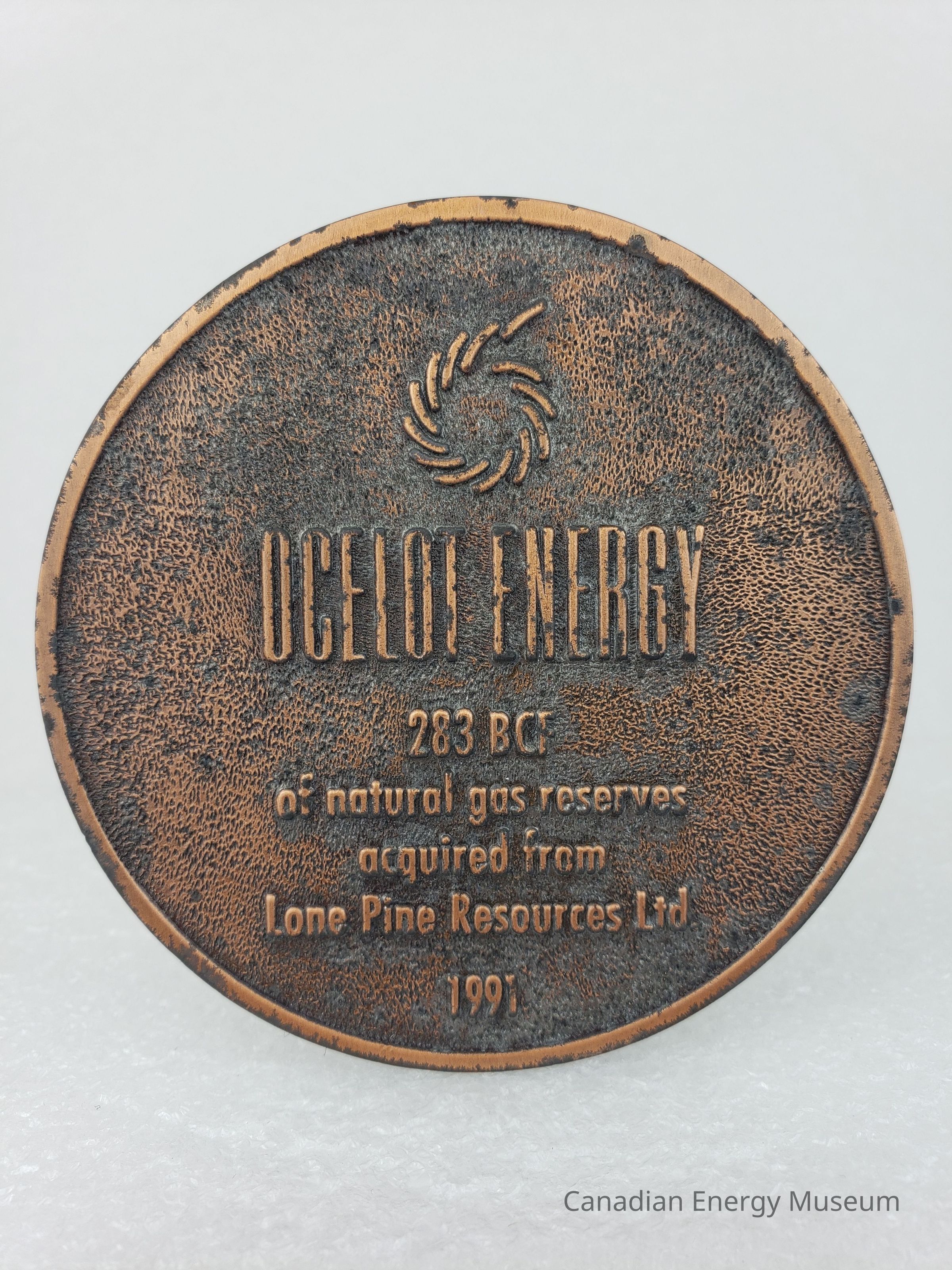Description: A round cast-metal coaster, with a thin black felt base. The cast design is a dashed spiral logo in the upper-centre; "OCELOT OCEAN" large in the upper-centre; and "283 BCF; of natural gas reserves acquired from Lone Pine Resources Ltd.; 1991" in the lower centre.