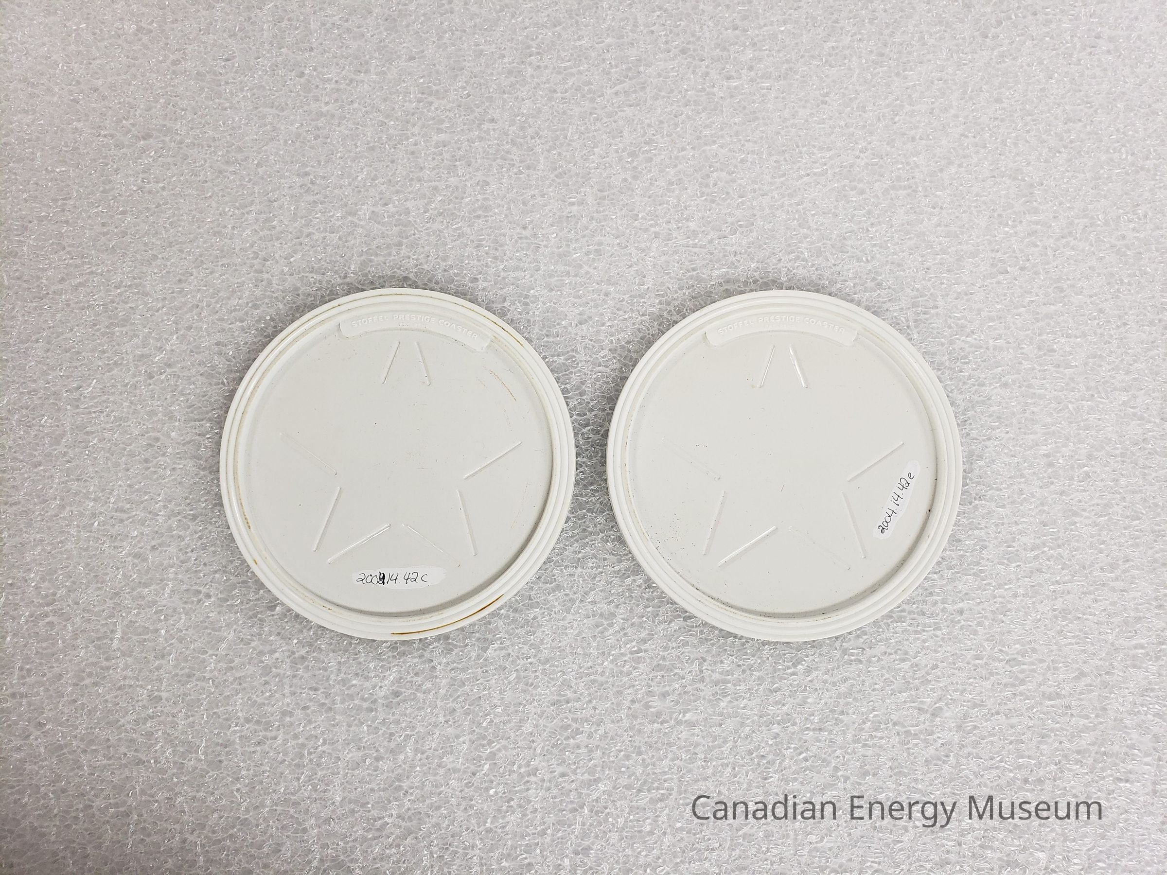 Features: A plastic rim with a metal center plate. The rim is a ring of plastic, with a 2mm depth and 5mm width on both sides. The top and base of the rim has two groove rings to texture the surface. Inside this rim is a metal surface, with a star design embossed in it (not a complete star, but lines suggesting the shape of a star). The metal is colored white. Within the star emboss is a printed red star, with a green-gold "T" inside, and the text "TEXACO" across the 'arms' of the star. Around this design (4mm from the rim) are two concurrent rings of black.Collection