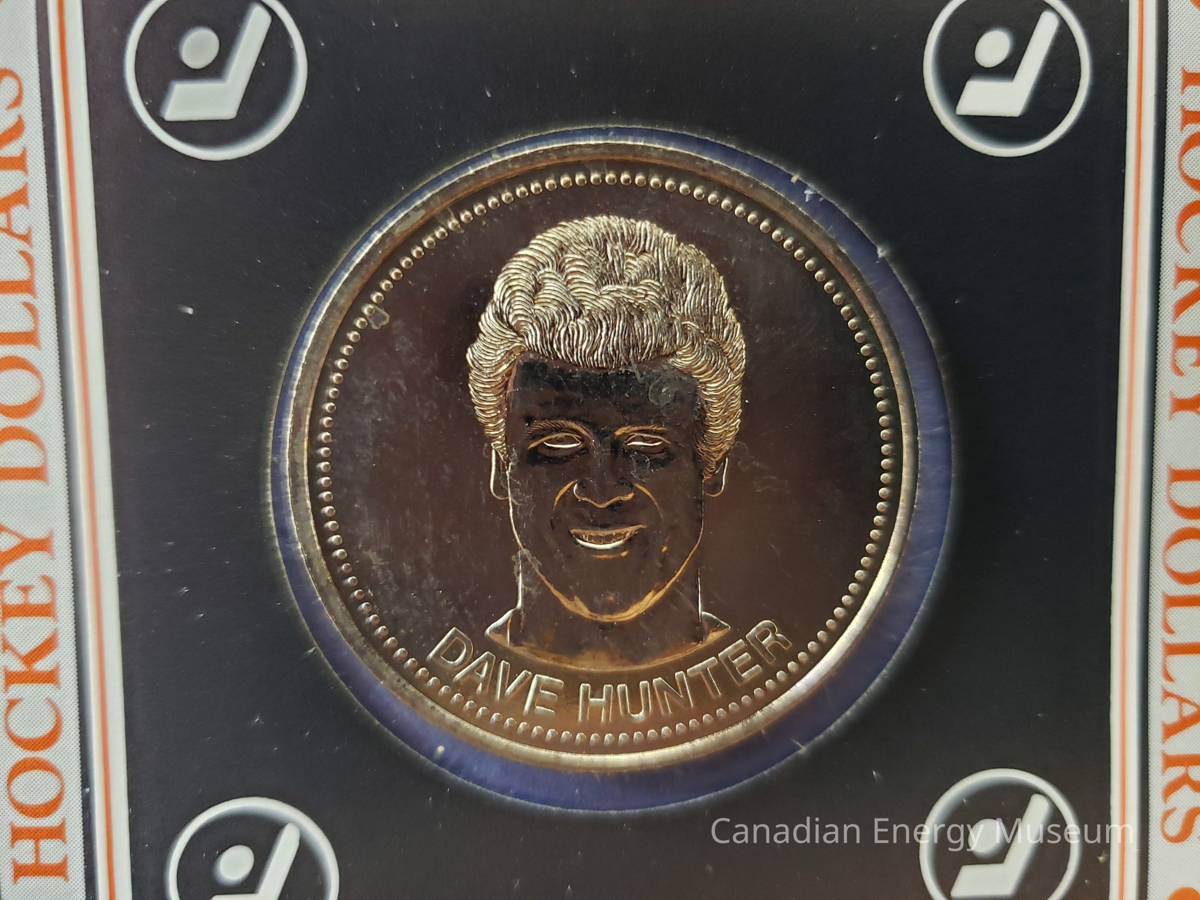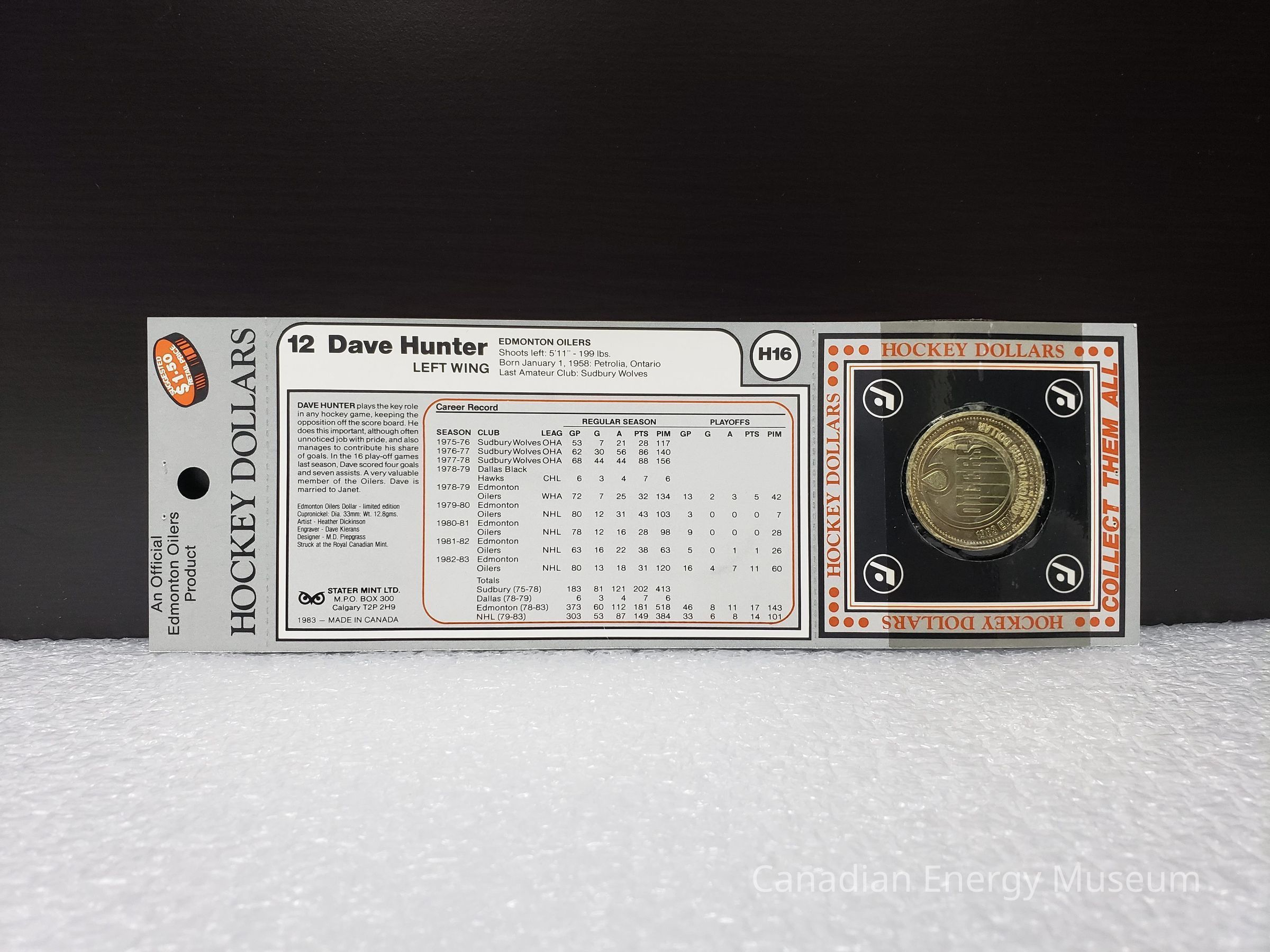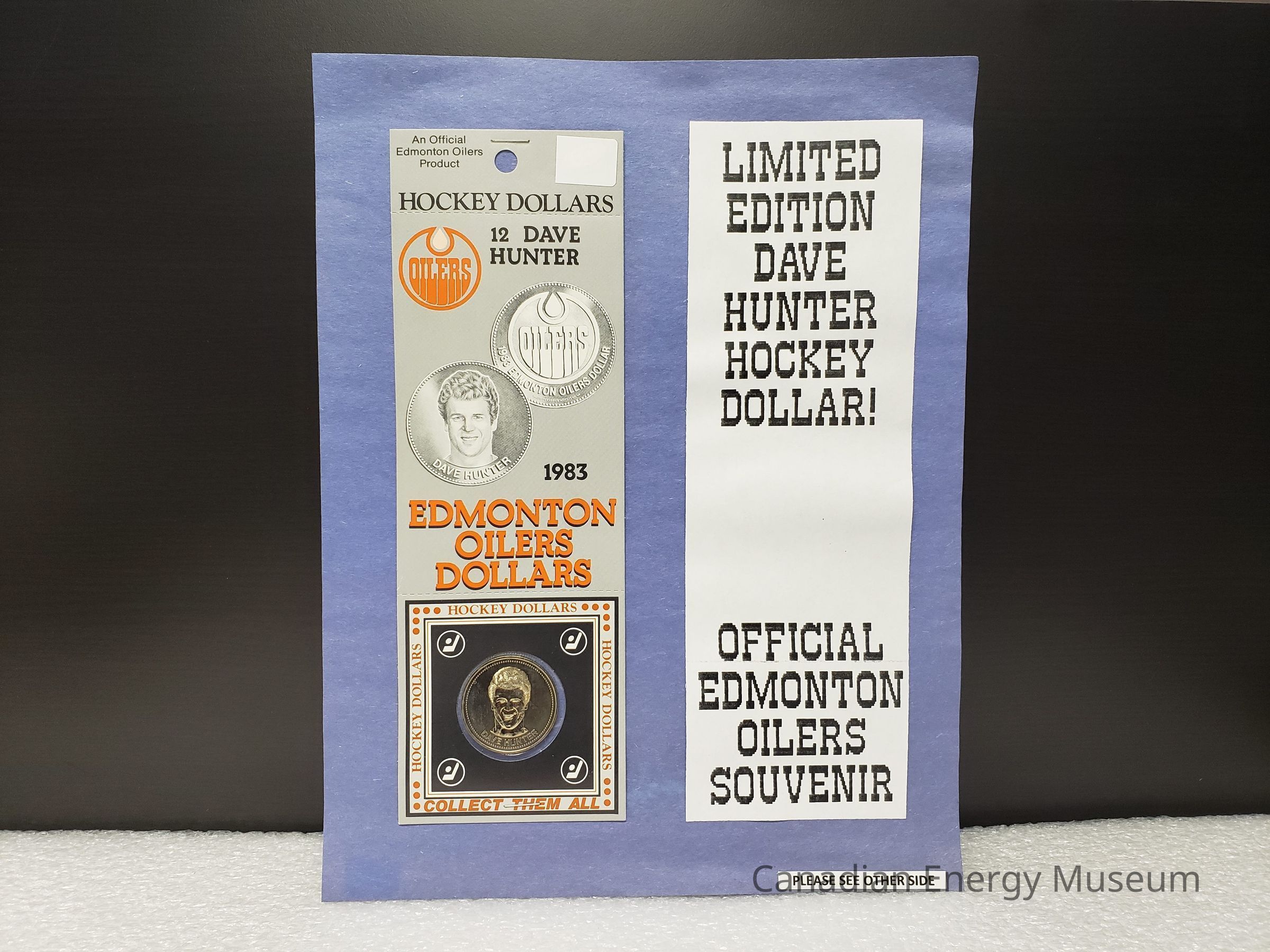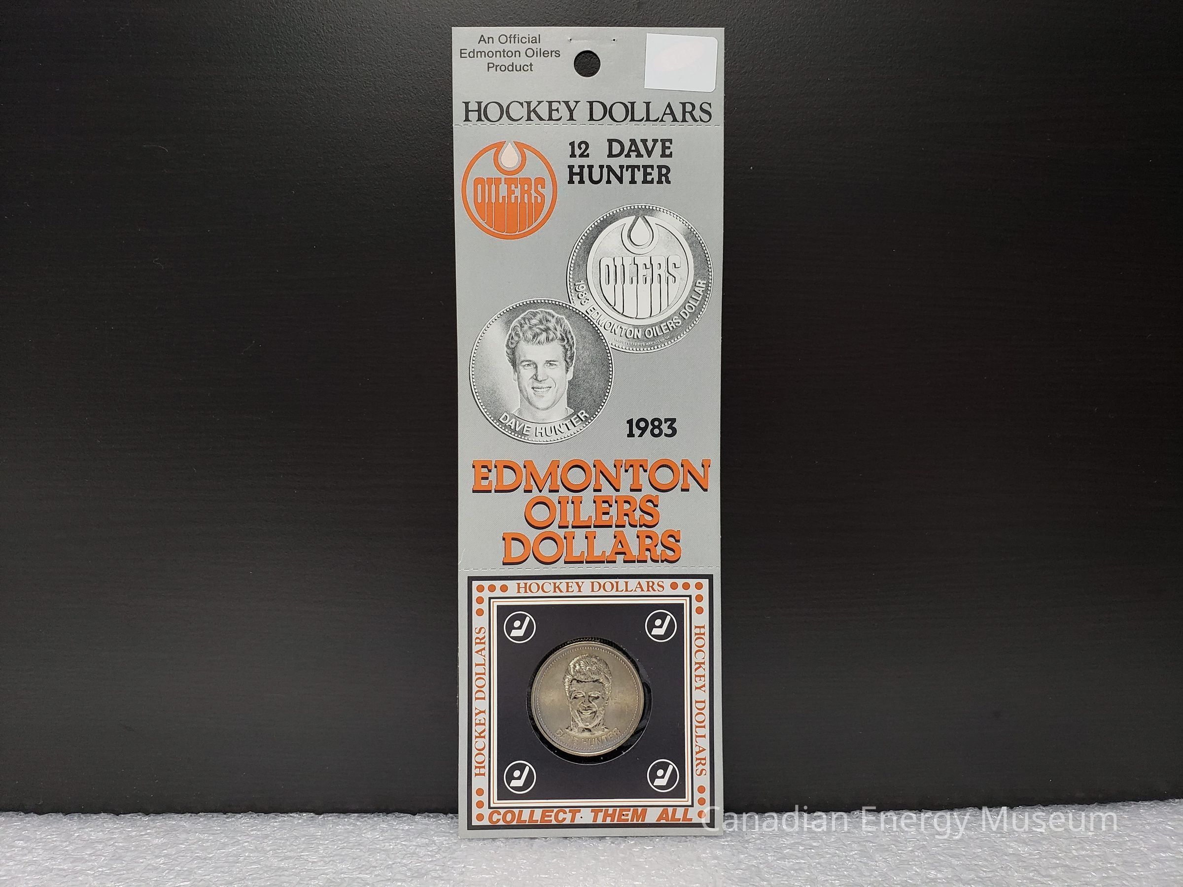 Front: On the front side the design elements are as follows: "An Offical Edmonton Oilers Product" (top-left, black); an orange-filled, black line illustration of a coin with the white text inside "SUGGESTED $1.50 RETAIL PRICE" (top-right, covered in white sticker); "HOCKEY DOLLARS" (directly below previous elements, black); horizontal line of tear-along indents; Edmonton Oilers logo (left below tear line, orange); "12 DAVE HUNTER" (right of Oilers logo, black); greyscale images of the coin's two sides (upper-middle); "1983" (mid-right, black); "EDMONTON OILERS DOLLARS" (lower-middle, orange with black drop shadow); horizontal line of tear-along indents; square containing cut-out with the coin inside. The square section has a black border; orange text "HOCKEY DOLLARS" on top and sides, and "COLLECT THEM ALL" on the bottom, with orange dots in corners; fine black border; ultra-fine orange border; black fill square; white stylised hockey stick and puck design in ring, in each corner; round cut-out in centre. The coin is suspended in the middle of the cut-out with a strip of adhesive tape on the backside. It is unclear if this is how the coin was originally attached, or an adaptation made when mounted on the display sheet the coin and package were donated with.