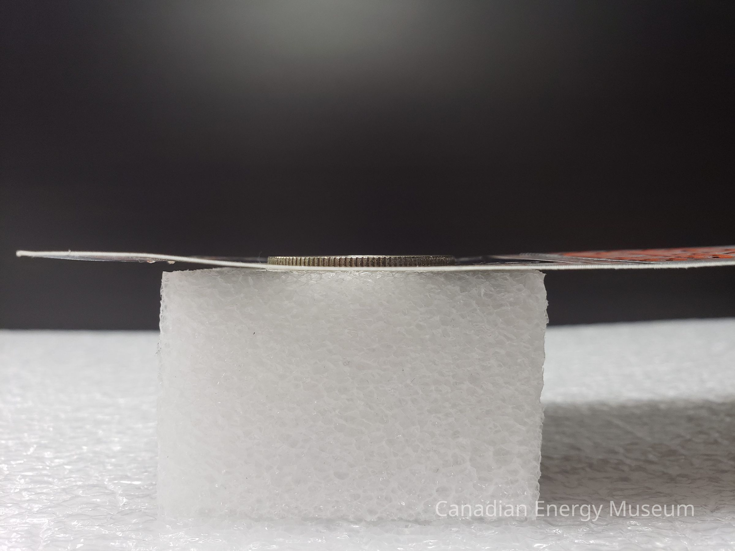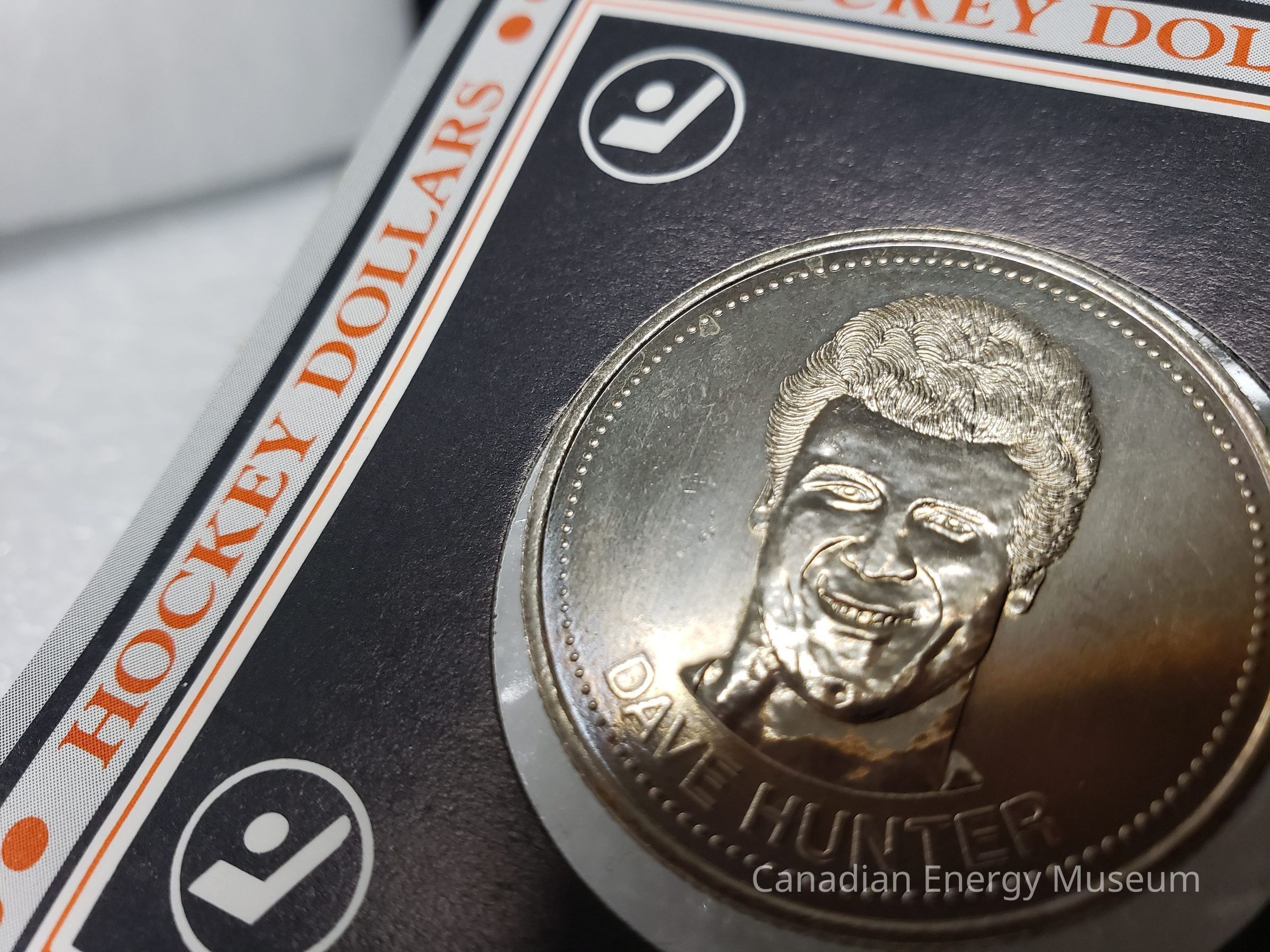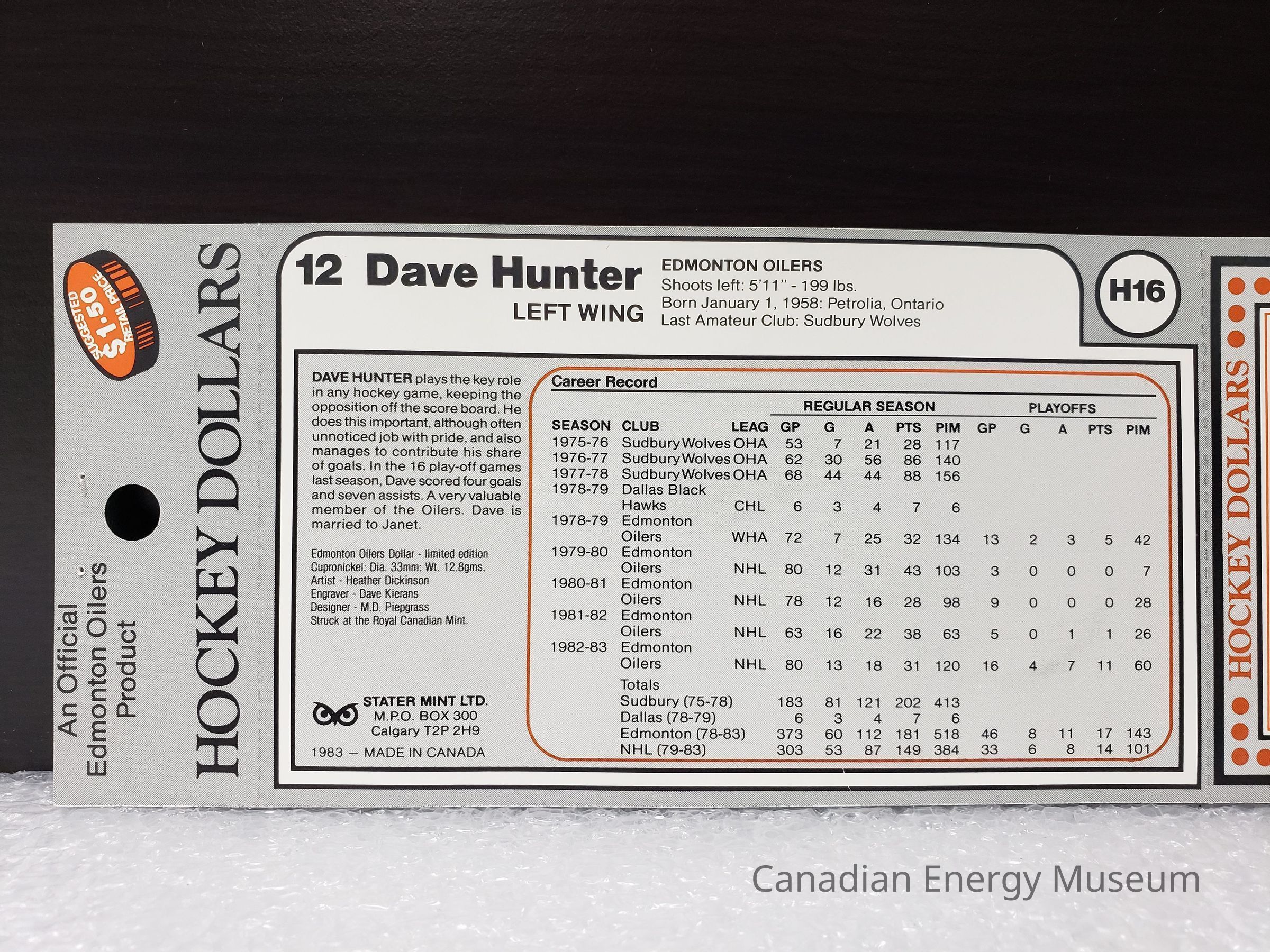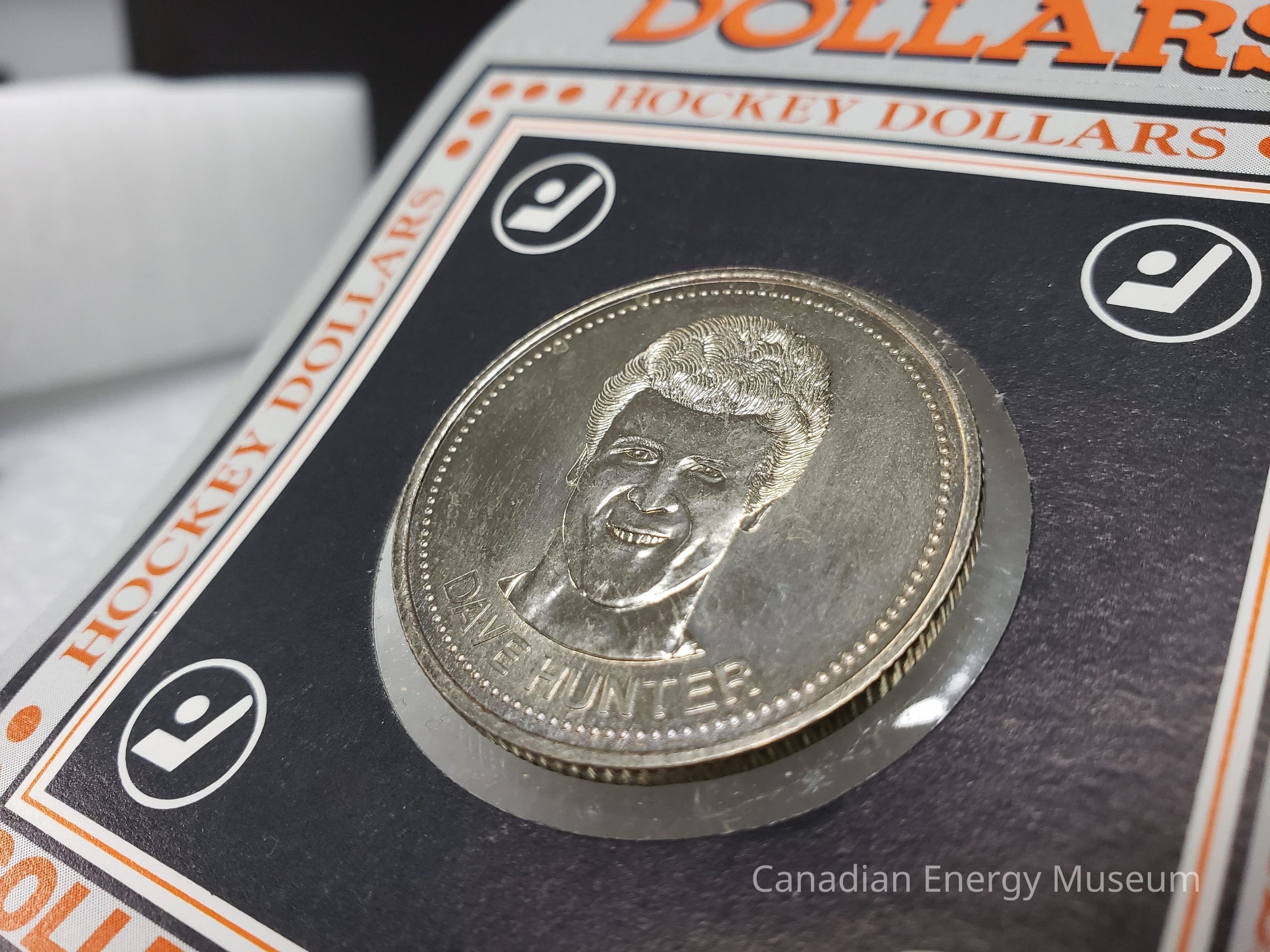 Front: On the front side the design elements are as follows: "An Offical Edmonton Oilers Product" (top-left, black); an orange-filled, black line illustration of a coin with the white text inside "SUGGESTED $1.50 RETAIL PRICE" (top-right, covered in white sticker); "HOCKEY DOLLARS" (directly below previous elements, black); horizontal line of tear-along indents; Edmonton Oilers logo (left below tear line, orange); "12 DAVE HUNTER" (right of Oilers logo, black); greyscale images of the coin's two sides (upper-middle); "1983" (mid-right, black); "EDMONTON OILERS DOLLARS" (lower-middle, orange with black drop shadow); horizontal line of tear-along indents; square containing cut-out with the coin inside. The square section has a black border; orange text "HOCKEY DOLLARS" on top and sides, and "COLLECT THEM ALL" on the bottom, with orange dots in corners; fine black border; ultra-fine orange border; black fill square; white stylised hockey stick and puck design in ring, in each corner; round cut-out in centre. The coin is suspended in the middle of the cut-out with a strip of adhesive tape on the backside. It is unclear if this is how the coin was originally attached, or an adaptation made when mounted on the display sheet the coin and package were donated with.