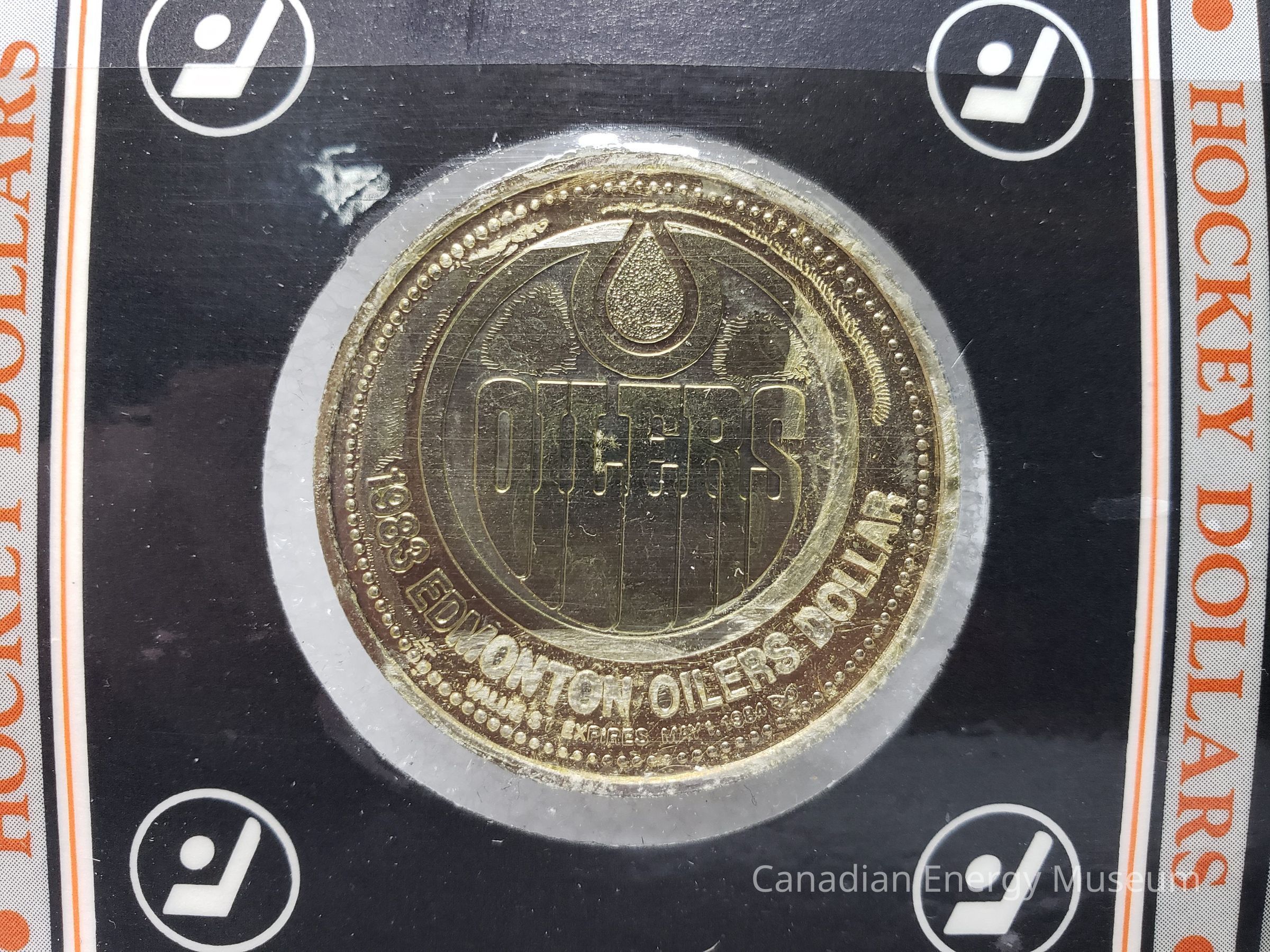Tails-side: Round Edmonton Oilers' logo, with text "1983 EDMONTON OILERS DOLLAR" below, following the curve of the coin. Around the outside is a dotted border, broken by text at the bottom reading: "VALUE $1EXPIRES MAY 1, 1984 [UNIDENTIFIED]". Ridged edge.