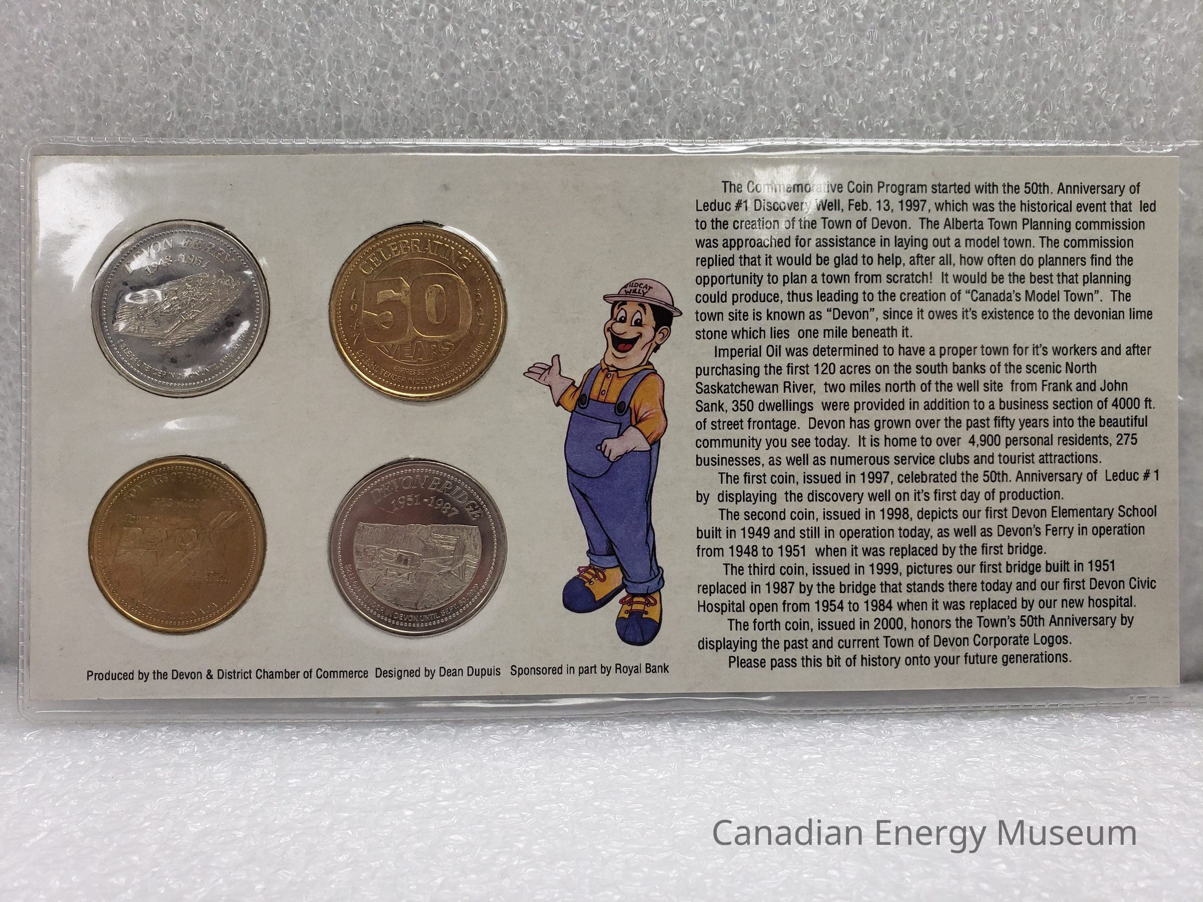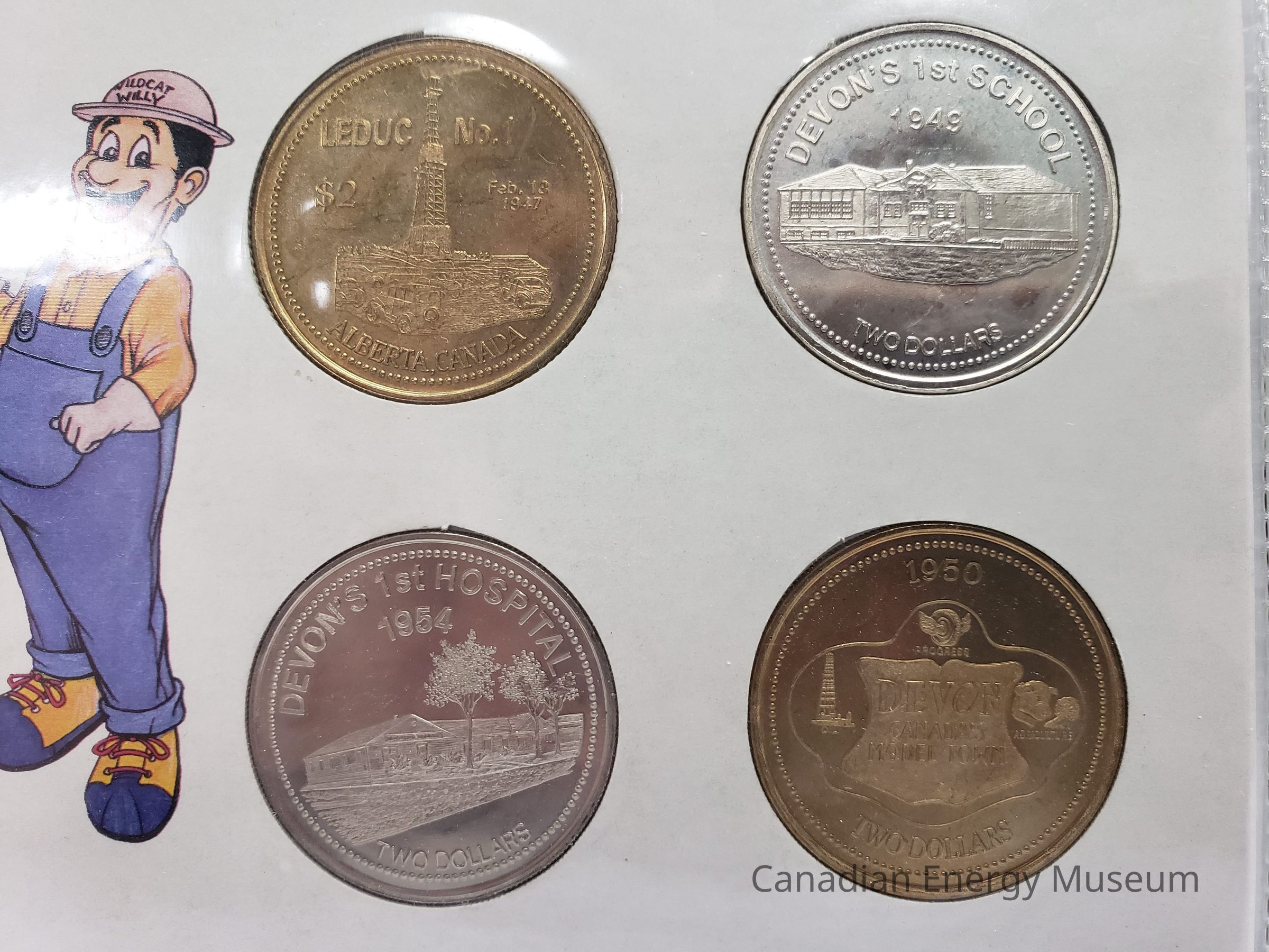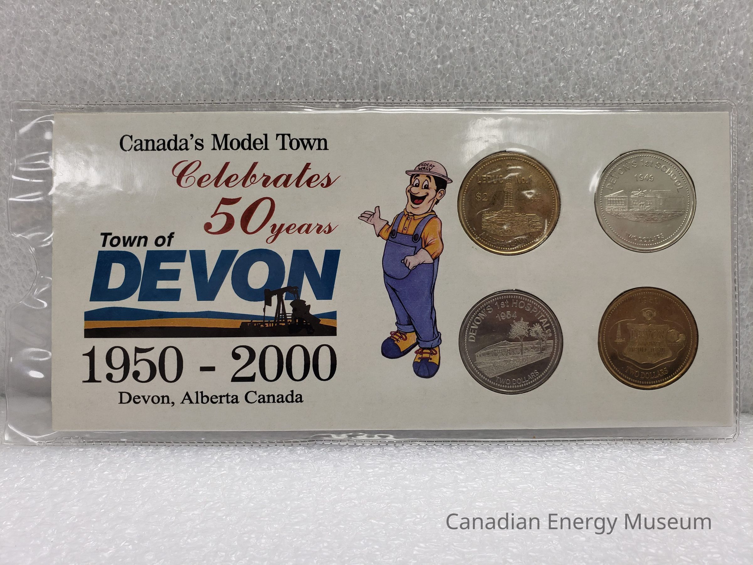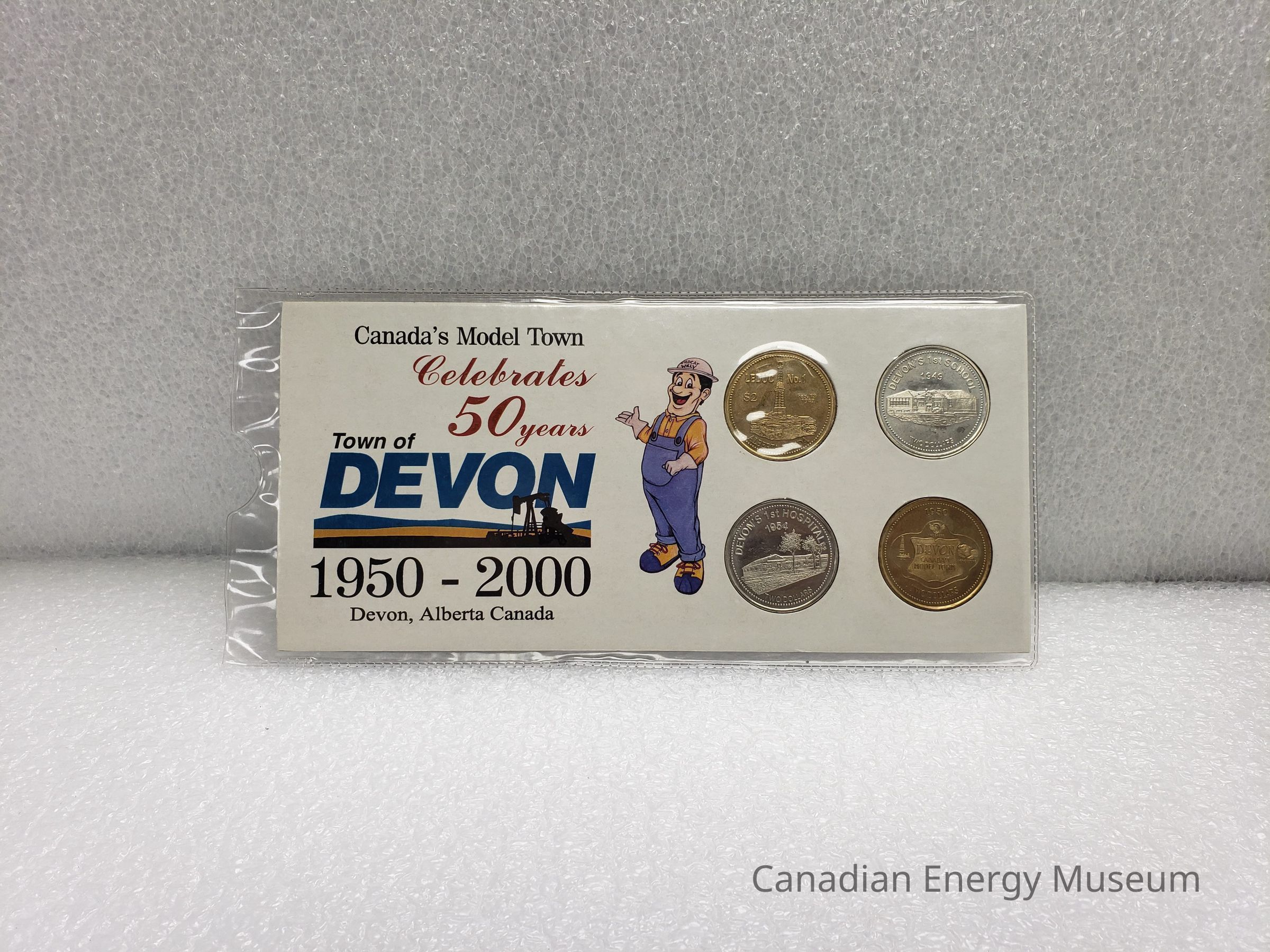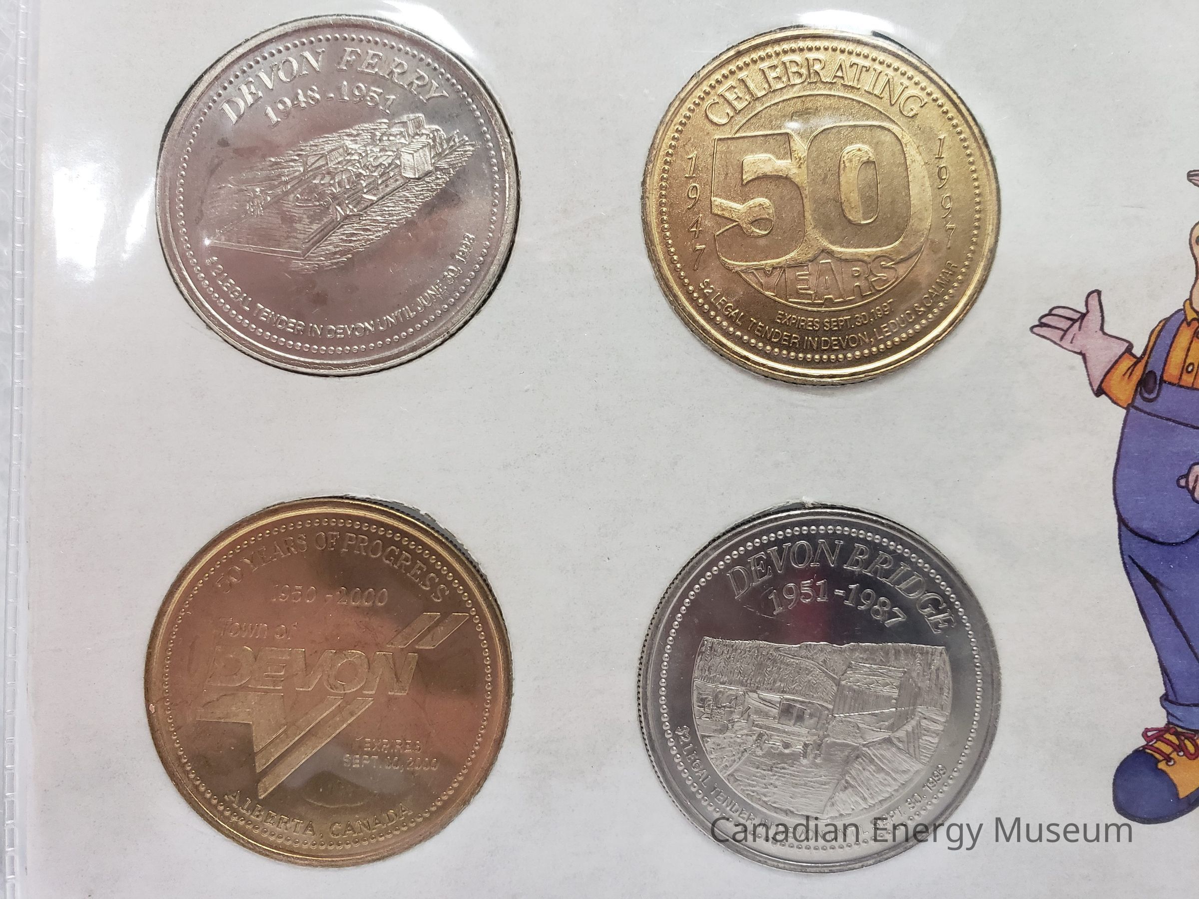 A set of 4 commemorative coins in original display card and plastic sleeve. Commemorate the Town of Devon's 50th Anniversary. Coin imagery of Leduc #1/"Celebrating 50 Years"; Devon's 1st School/Devon Ferry; Devon's 1st Hospital/Devon Bridge; and Devon: Canada's Model Town/Town of Devon logo.Collection